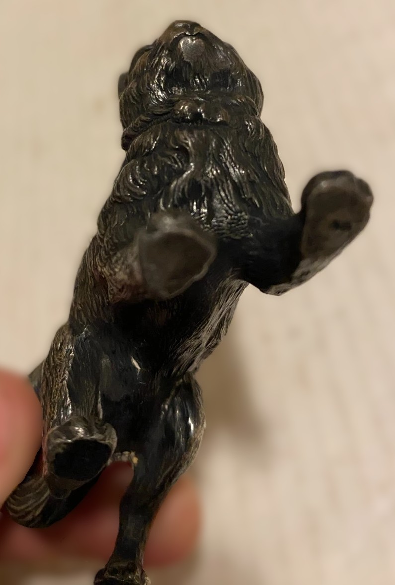 - Material and Detail: The piece is made of metal with a dark, rich patina. The casting is remarkably detailed, showing individual tufts of fur around the neck (the “ruff”), finely modeled ears, and a well-defined face with focused eyes.