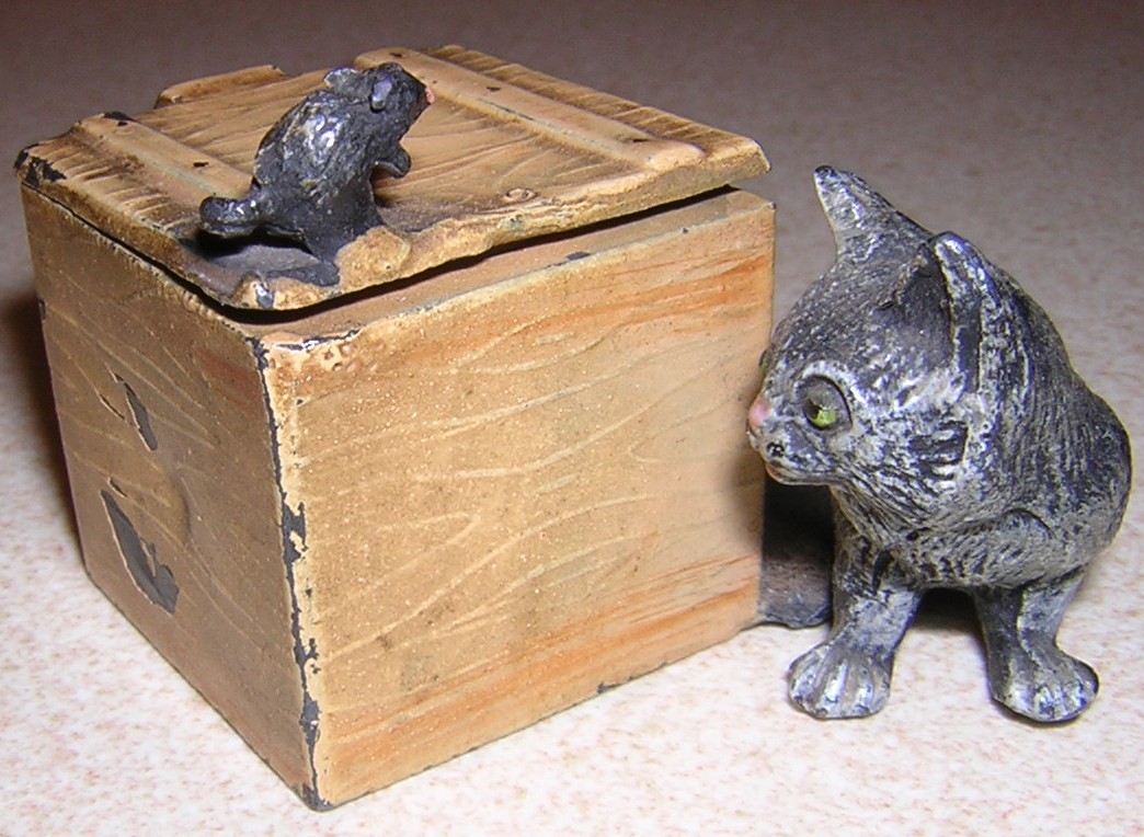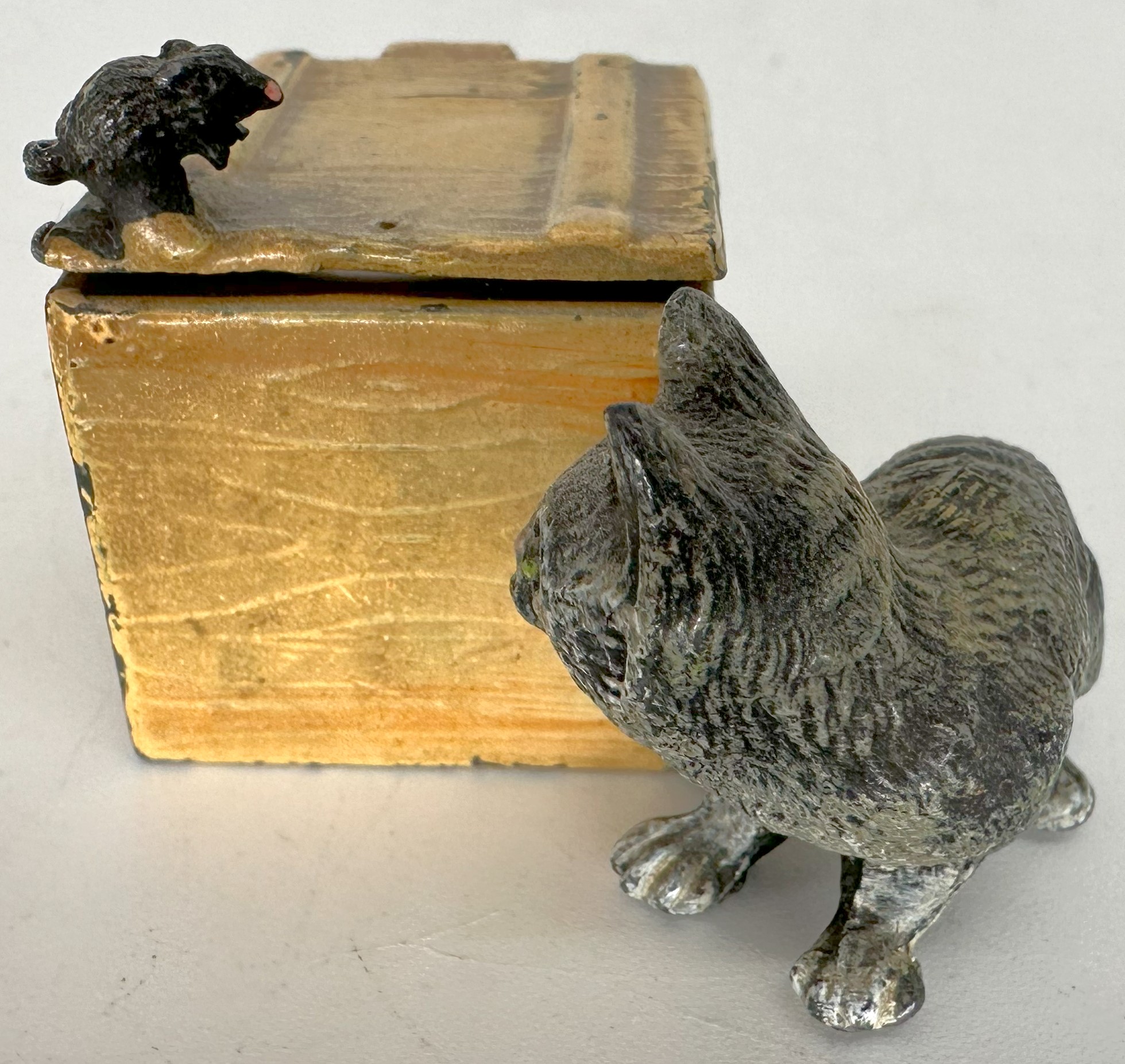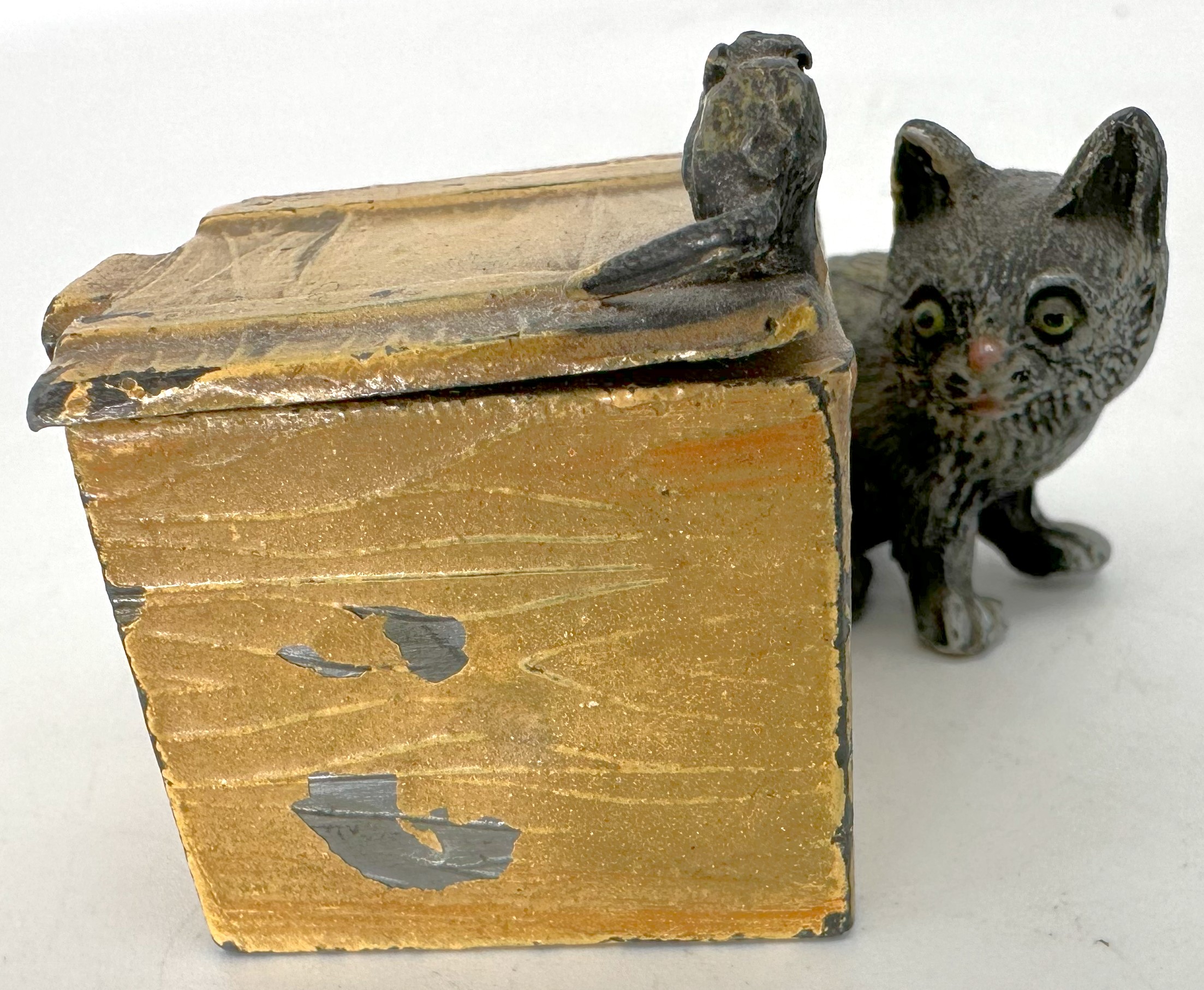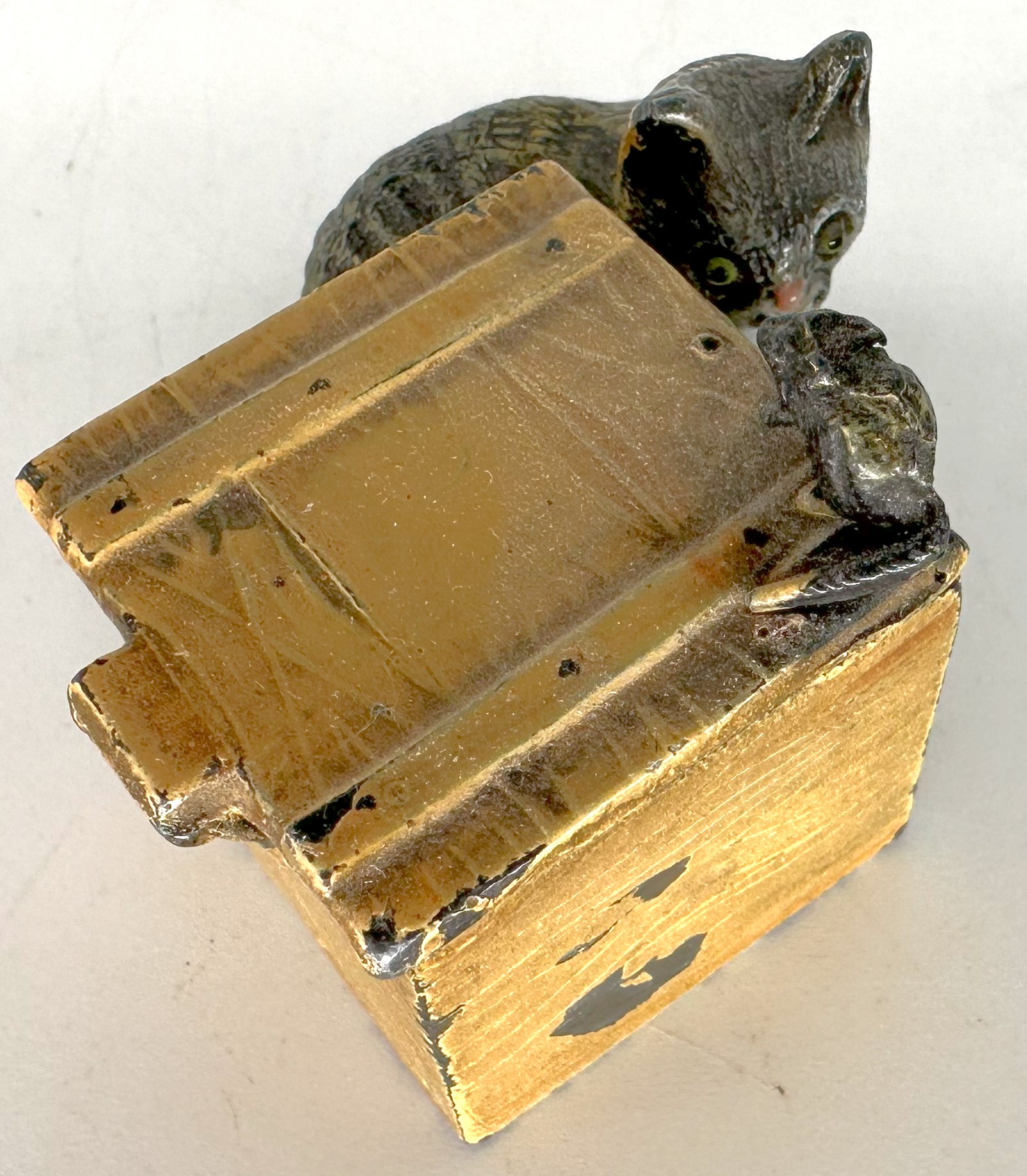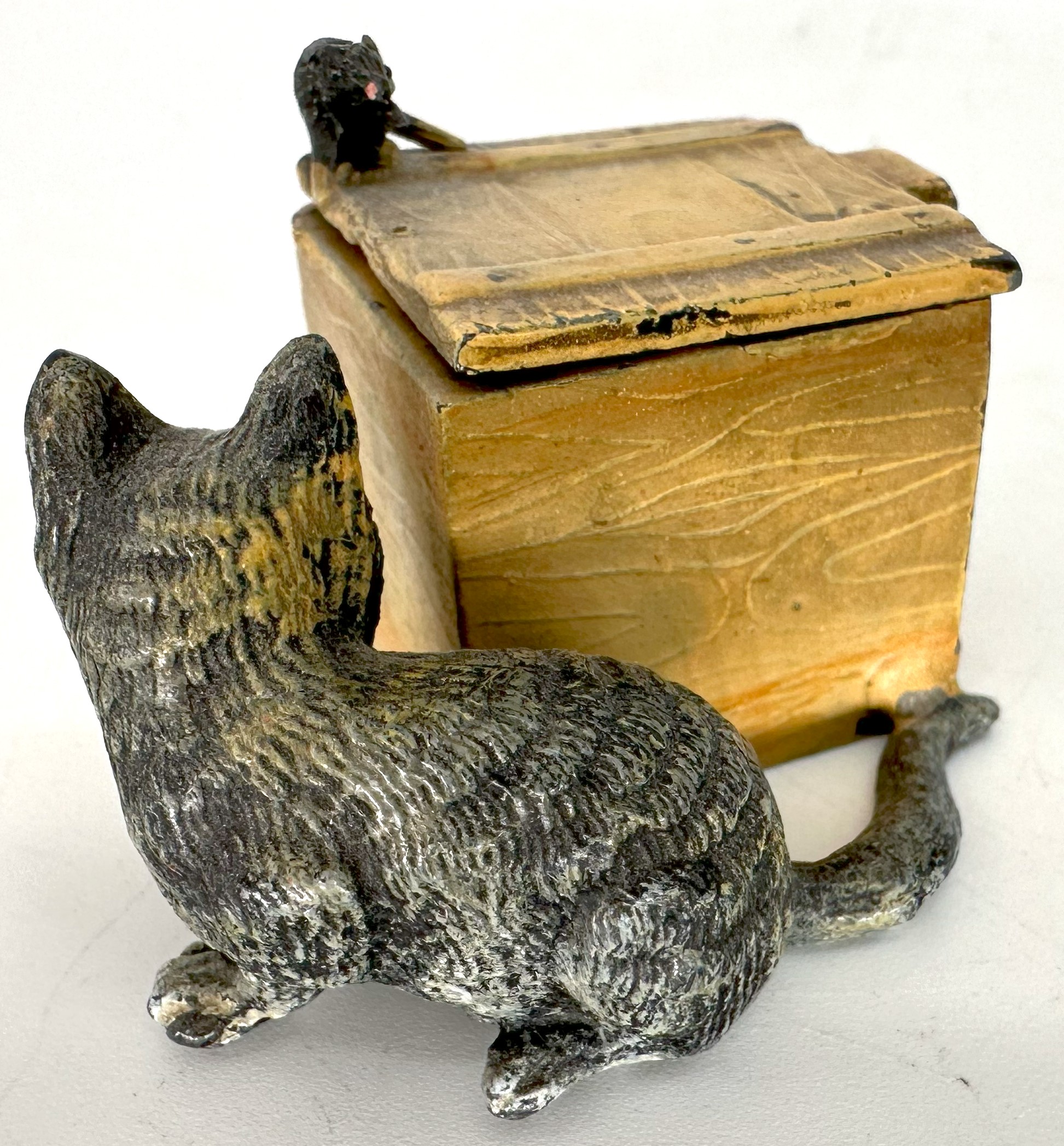 Charming figural inkwell depicting a cat preying on a mouse, who is sitting on top of a box.