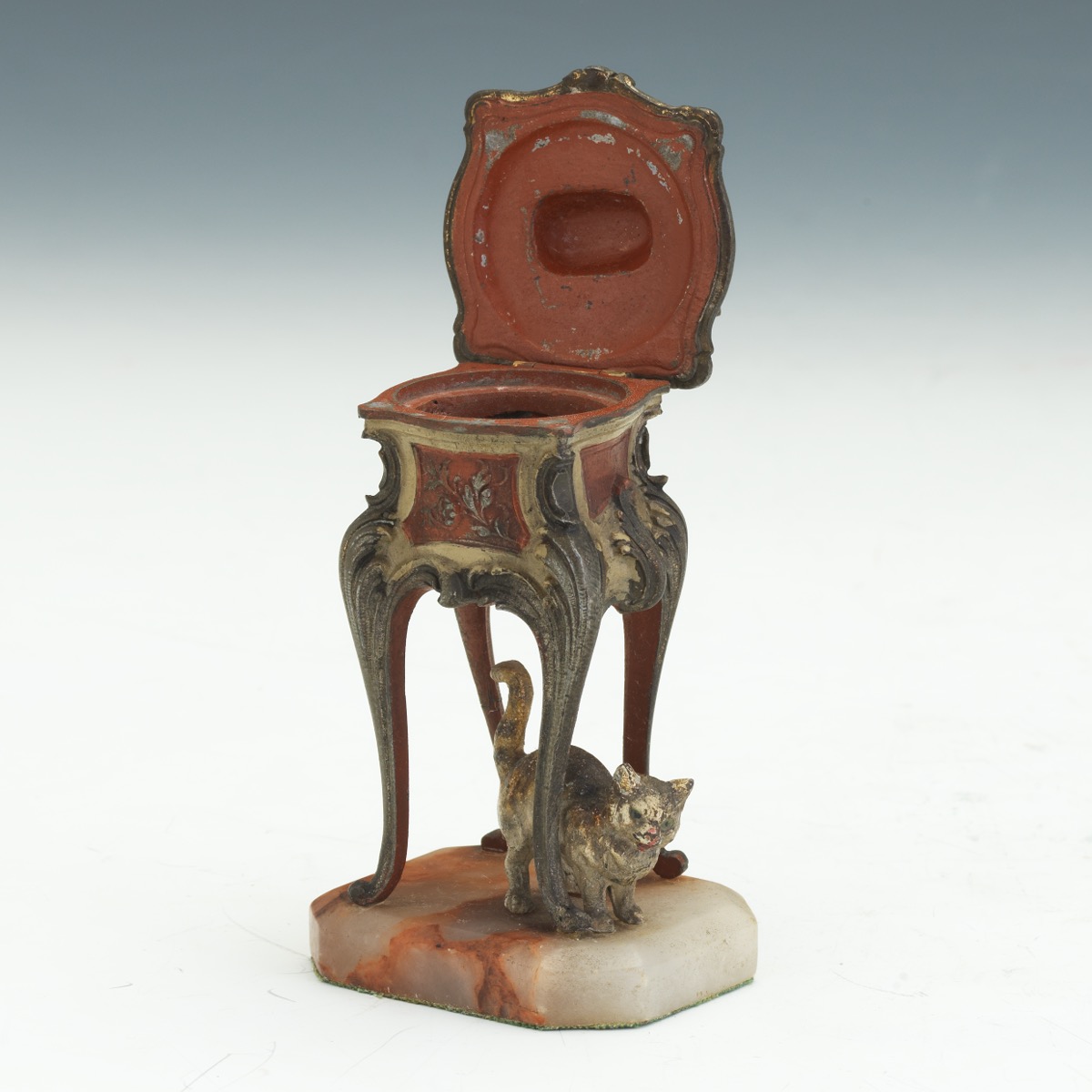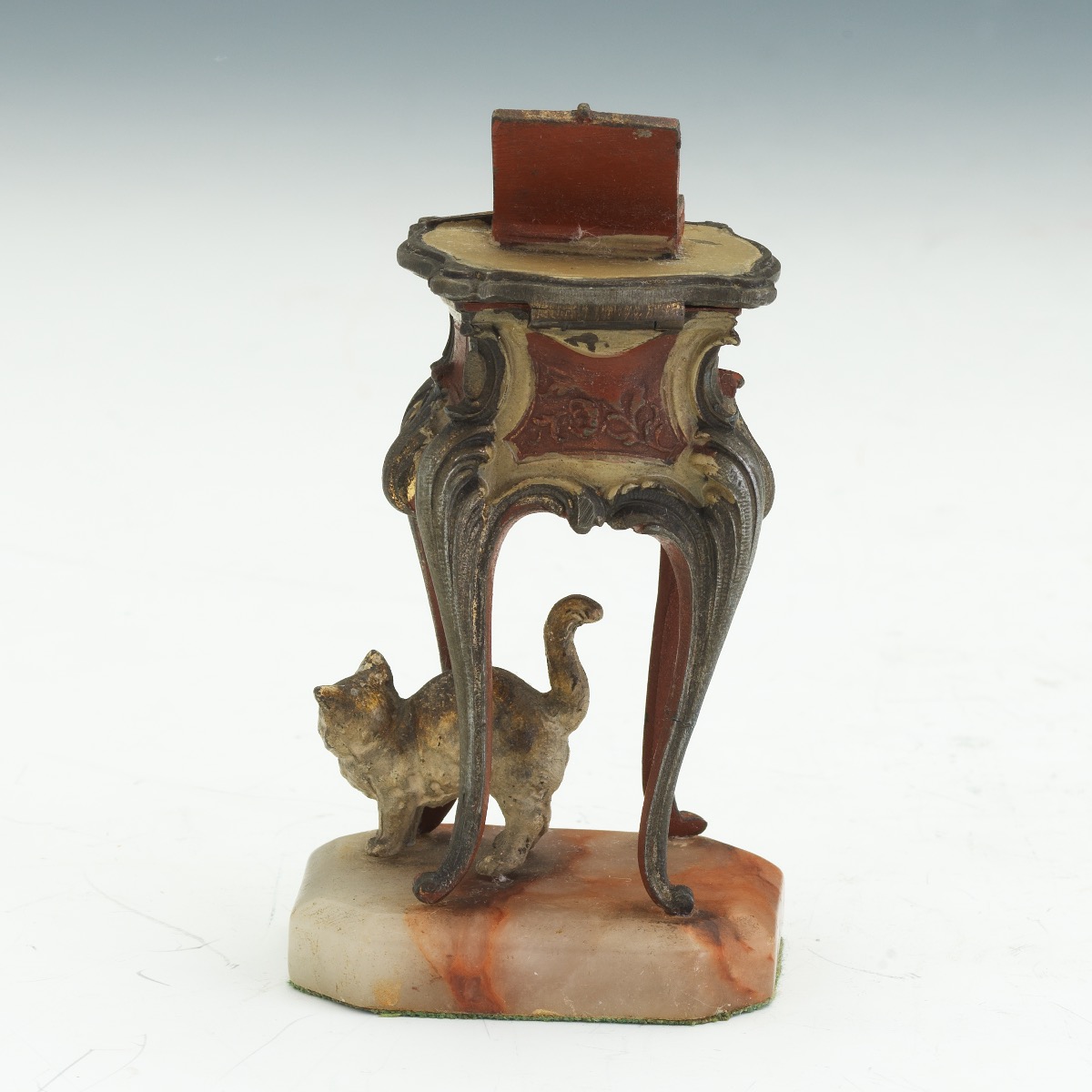 This figural inkwell is designed to resemble a miniature writing table or a small chest of drawers decorated with a jewelry box. A charming, cold-painted cat crouches underneath, positioned between the four curving cabriole legs decorated with floral designs. The entire assembly is mounted on an onyx base.