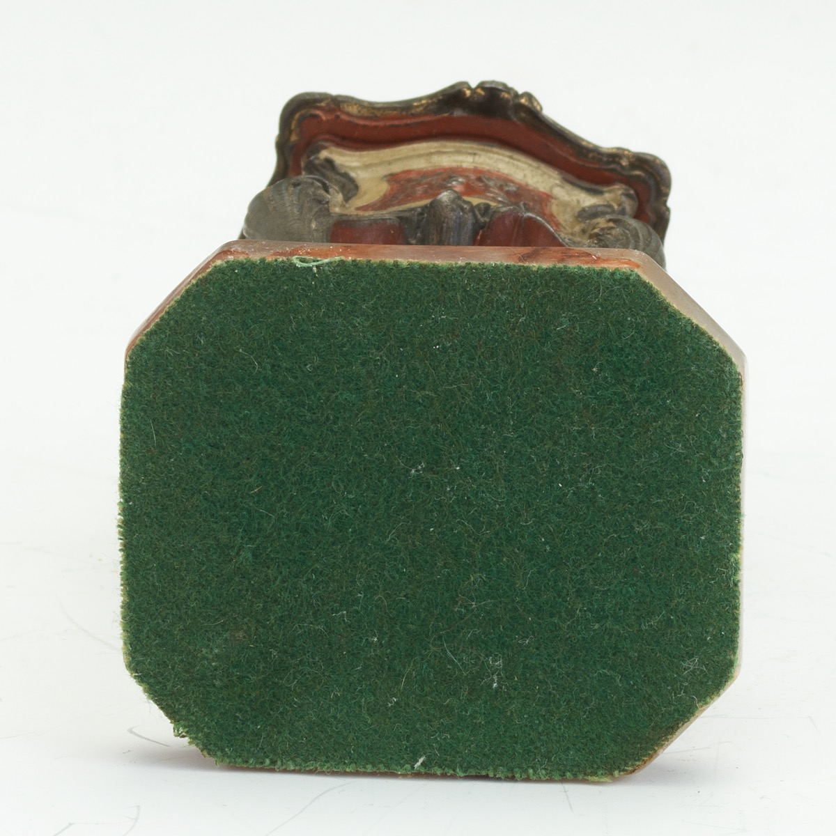 • Rococo Style: The inkwell’s design is heavily influenced by the Rococo style of the 18th century, with its emphasis on elegant, curved lines, asymmetrical forms, and motifs from nature like flowers and animals. The cabriole legs and the decorative scrollwork are classic Rococo elements.