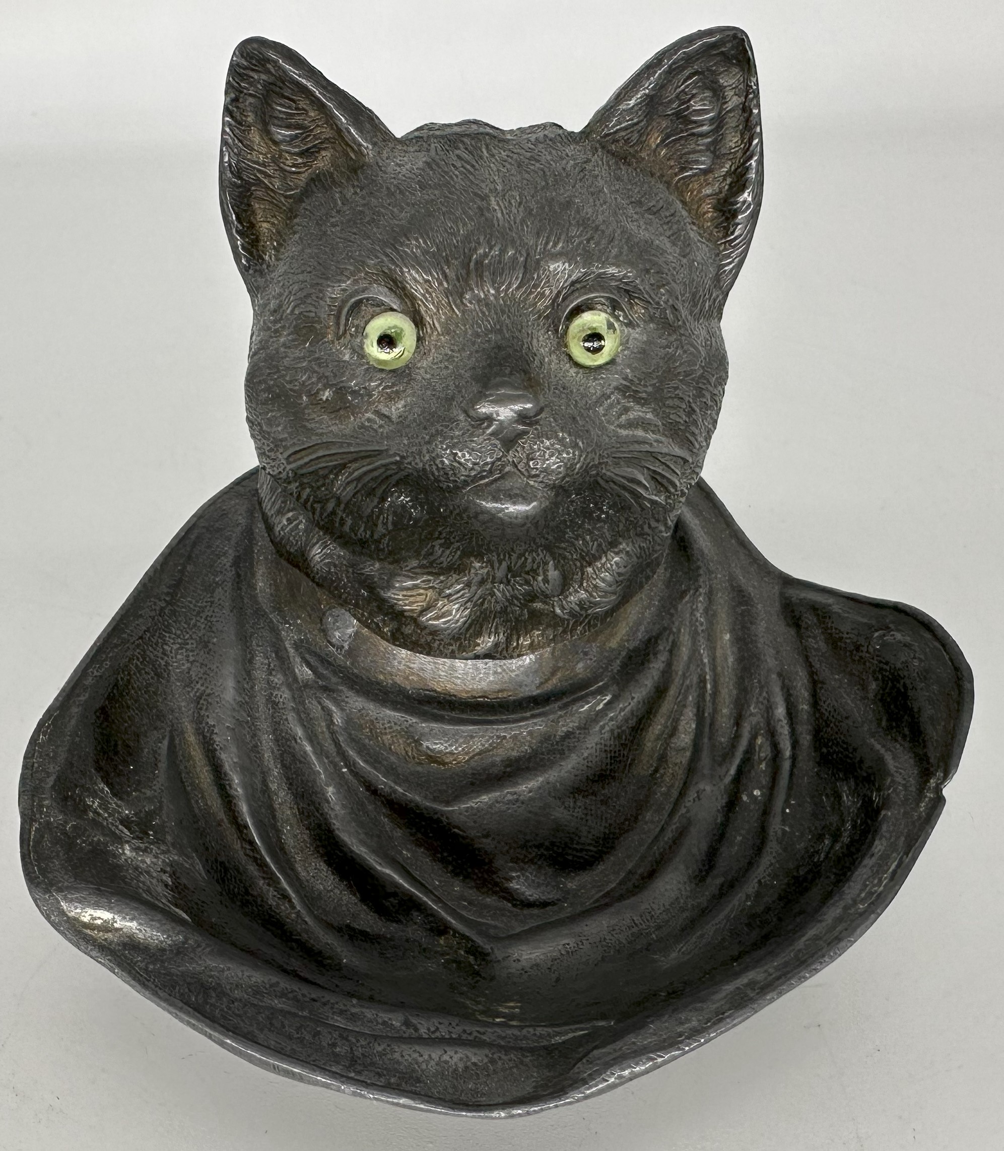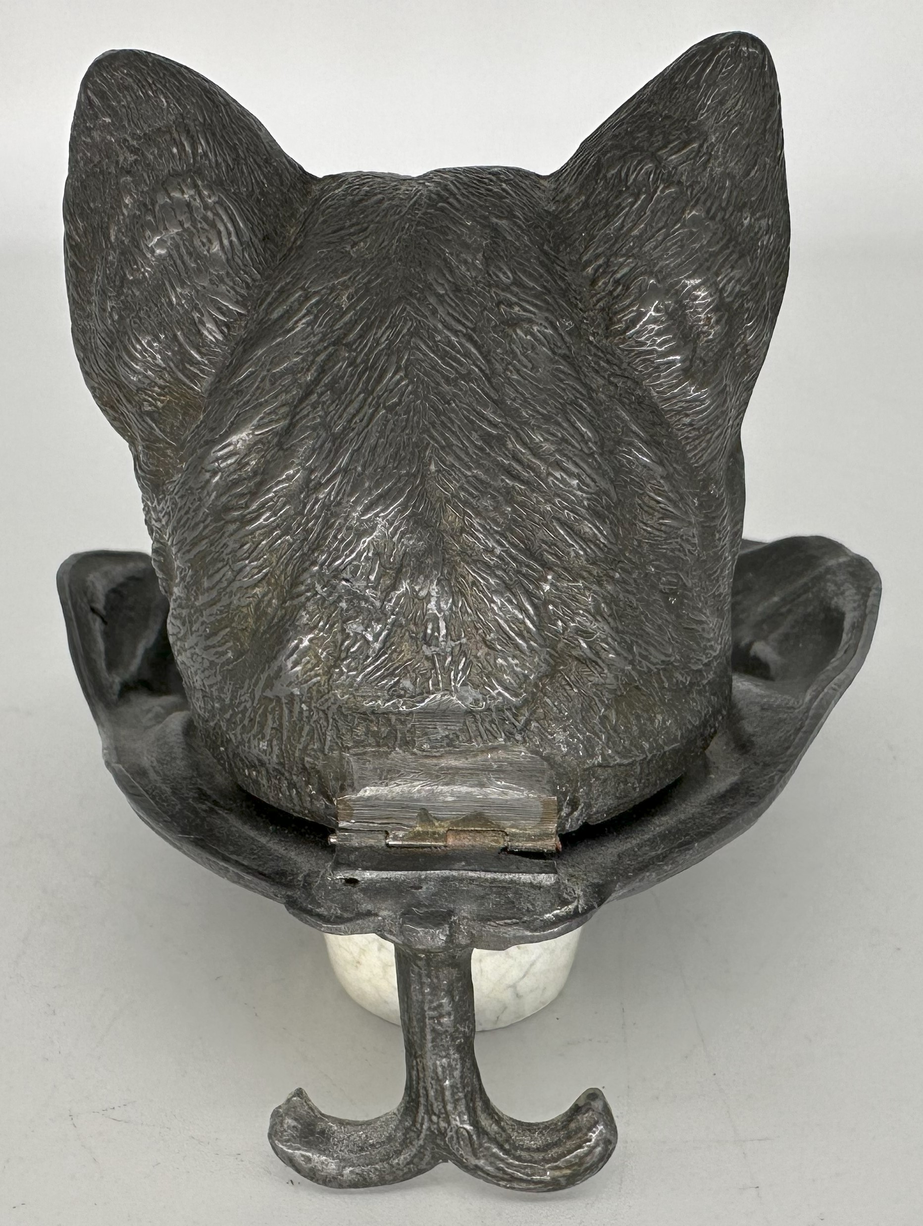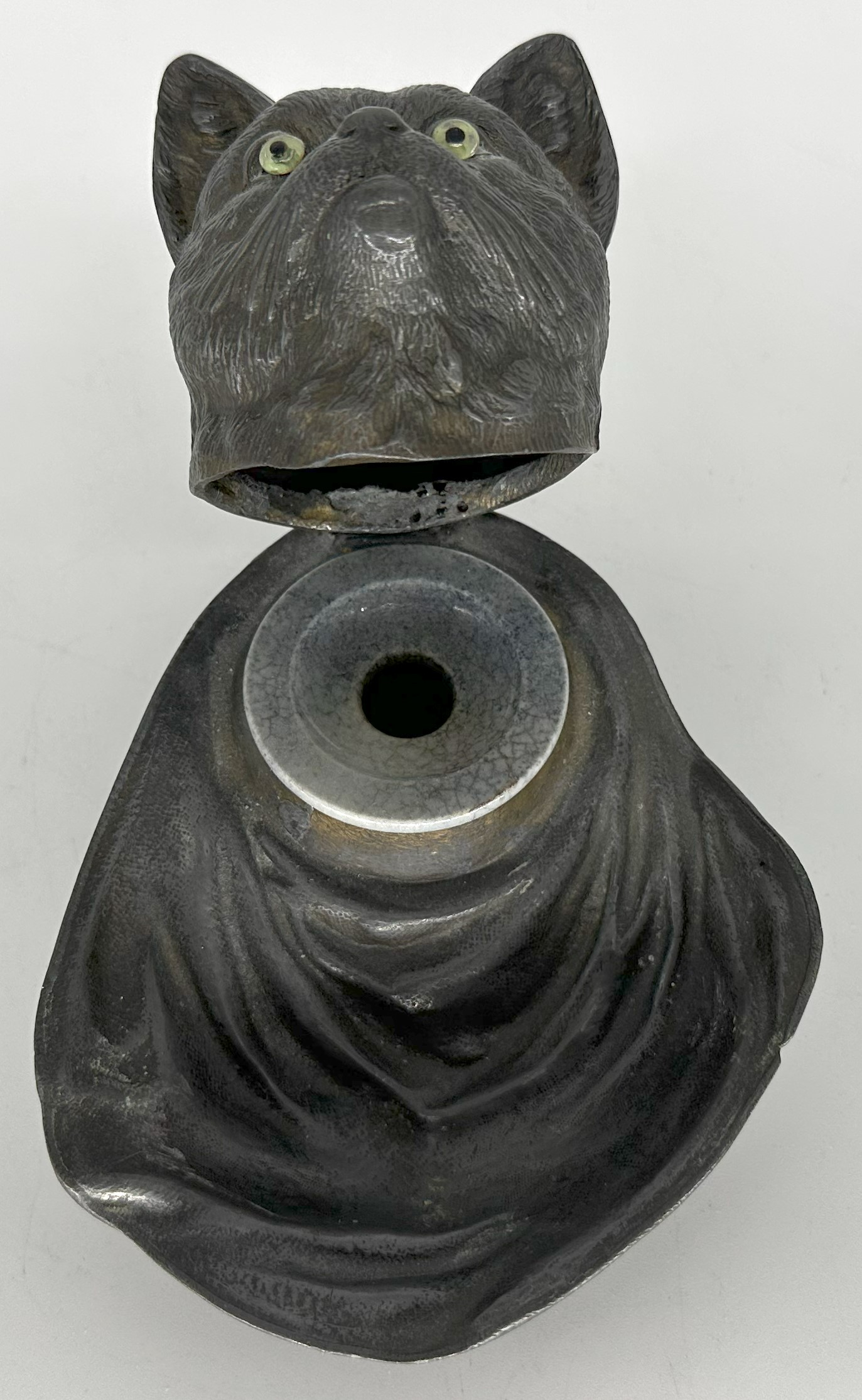 Held by a tri-legged base, a cat’s head with glass eyes, a bib around her neck, holds the inkwell.