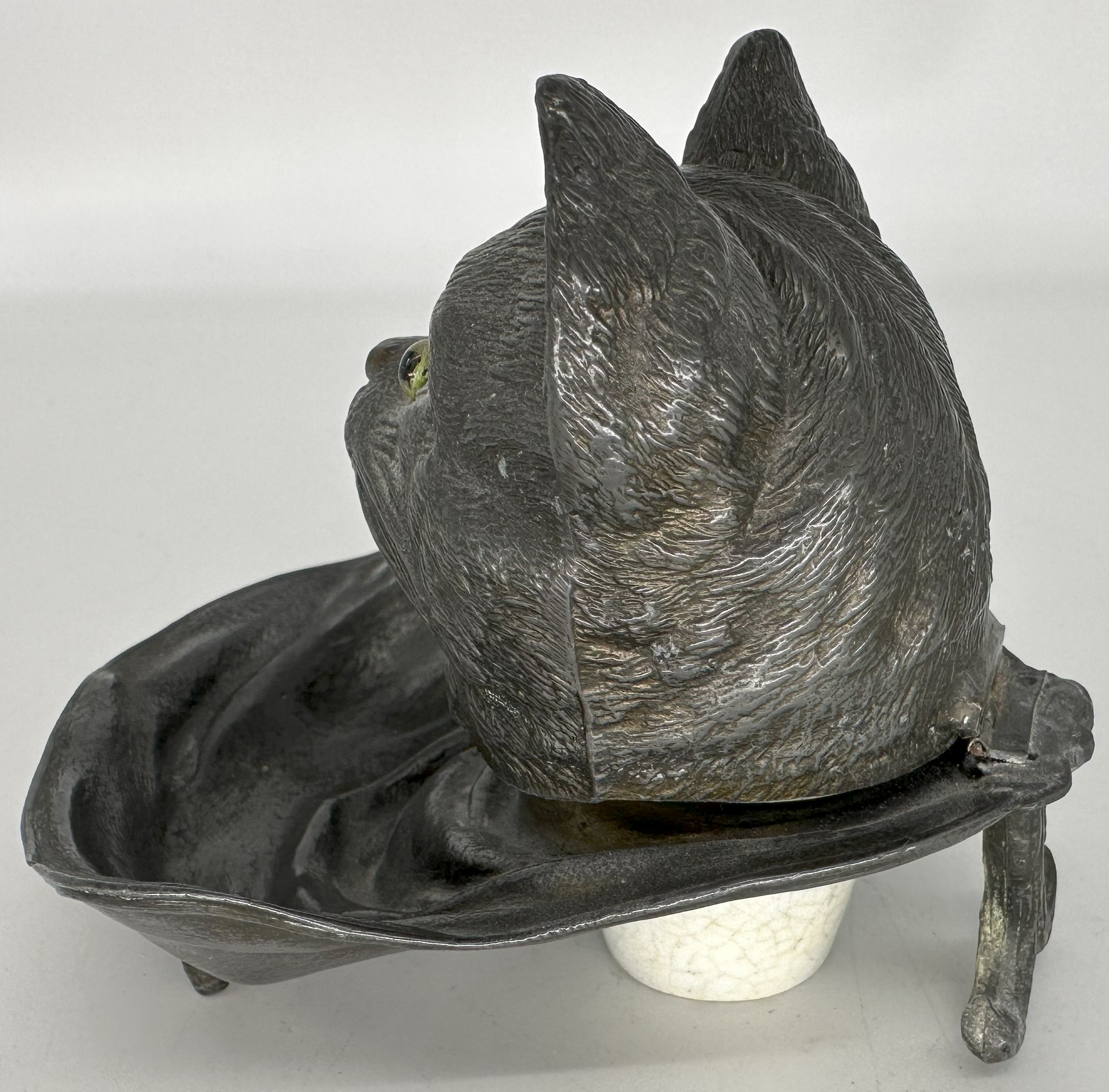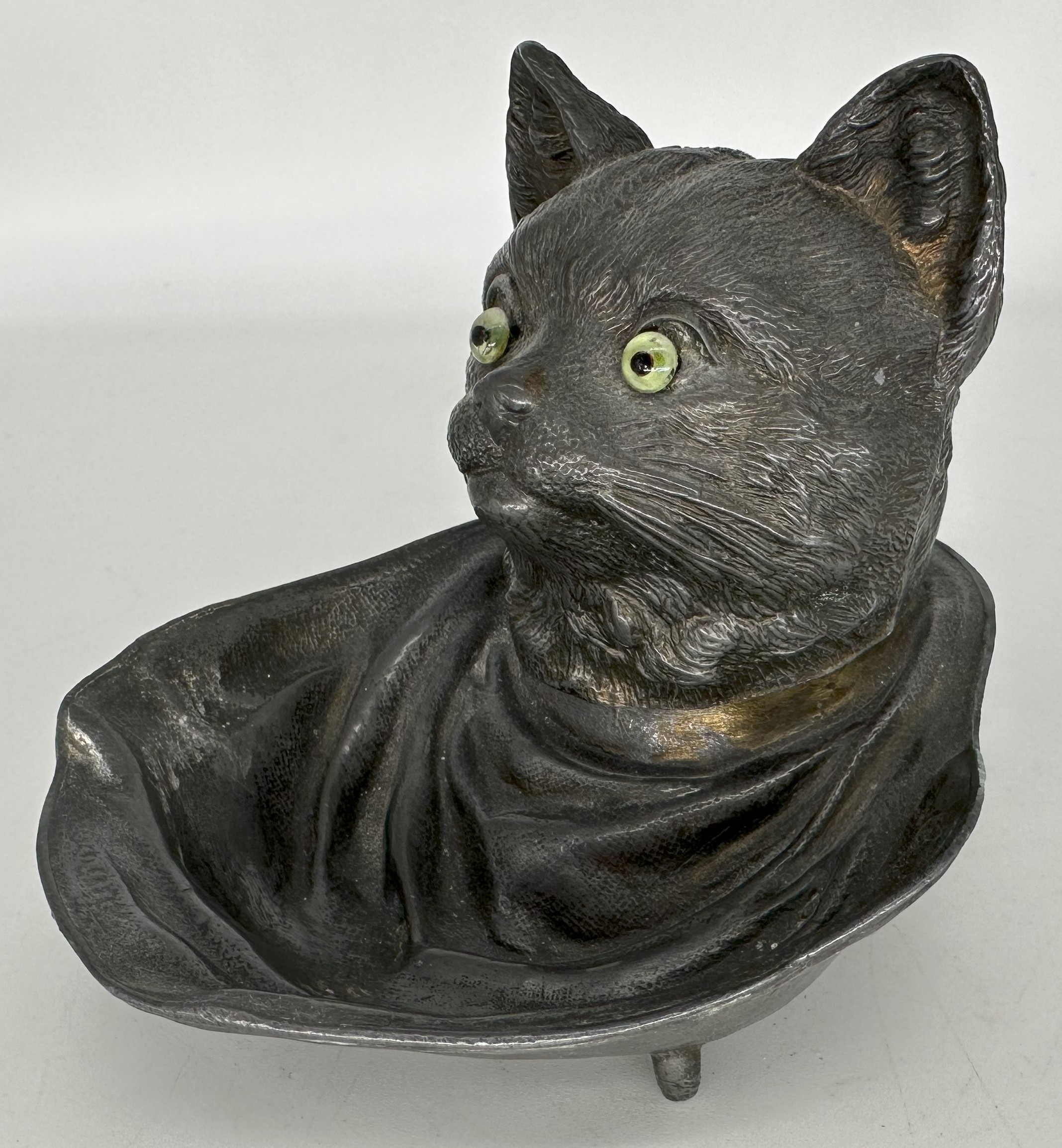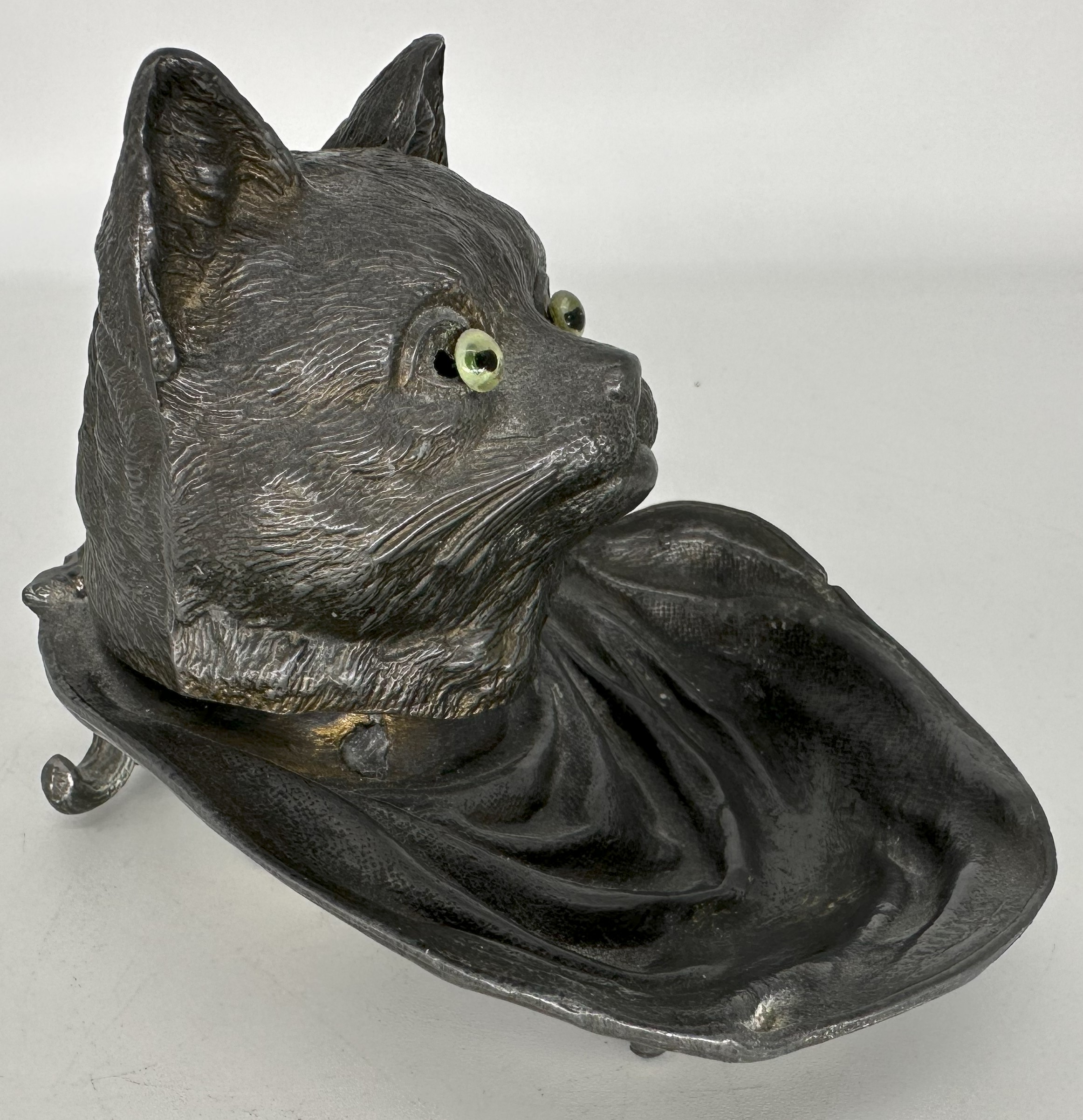 Held by a tri-legged base, a cat’s head with glass eyes, a bib around her neck, holds the inkwell.