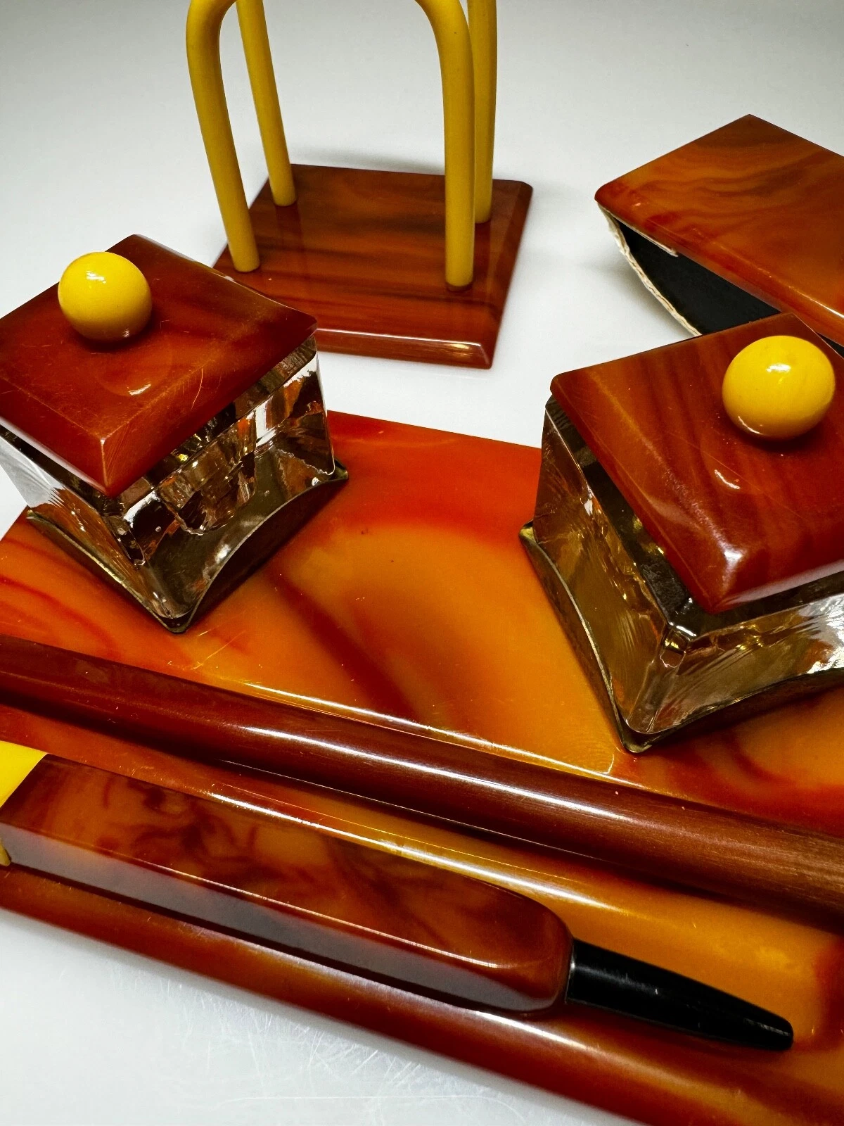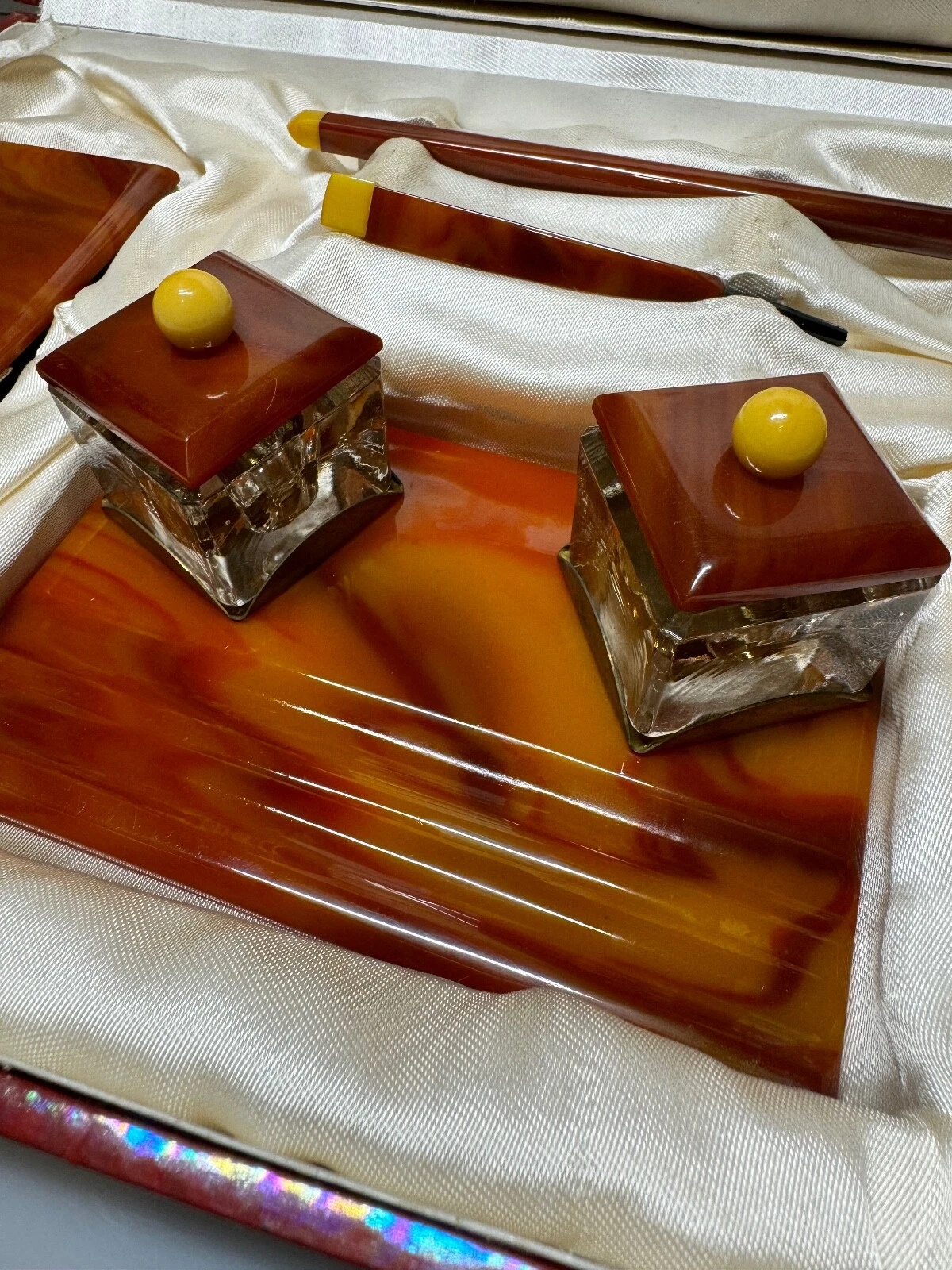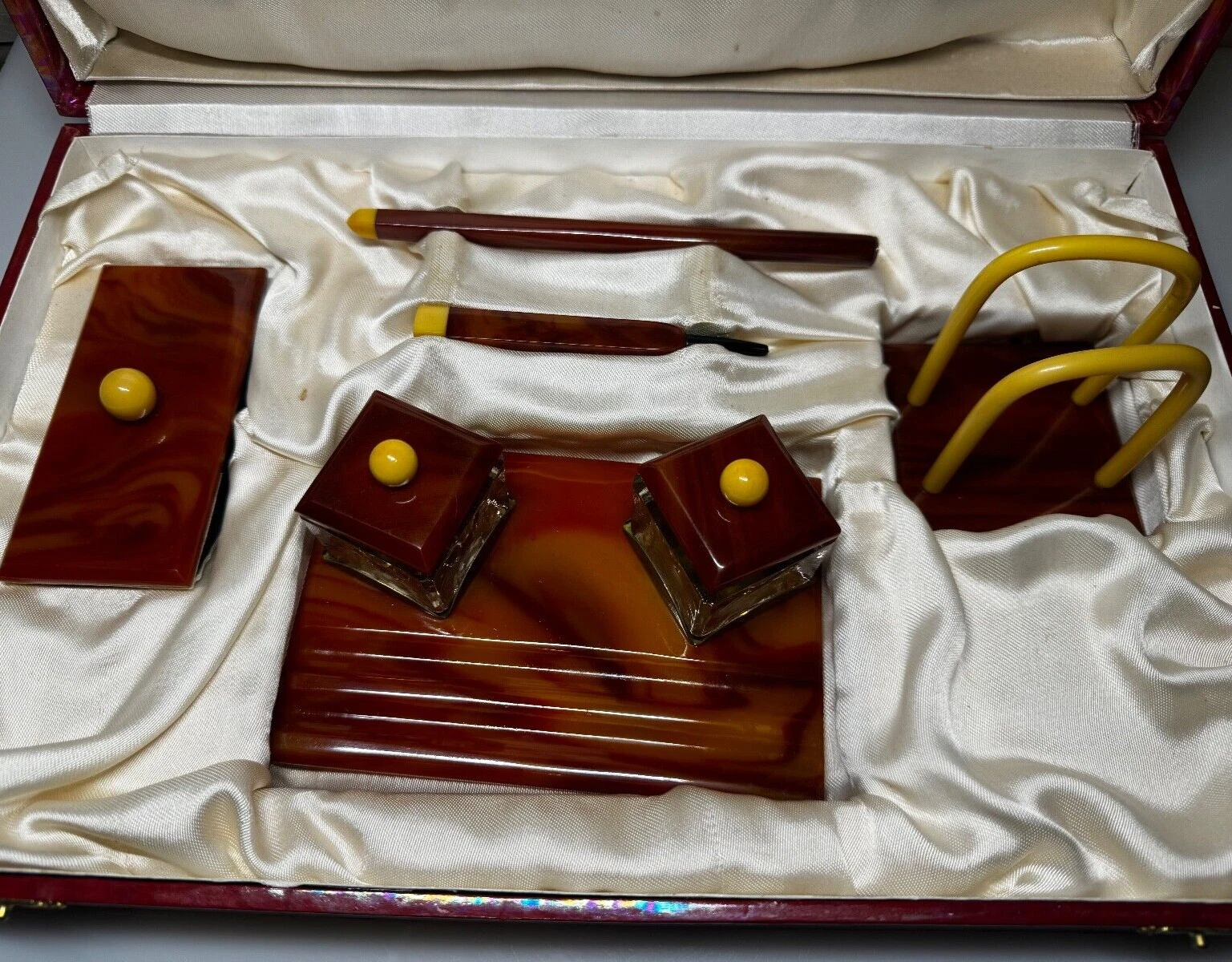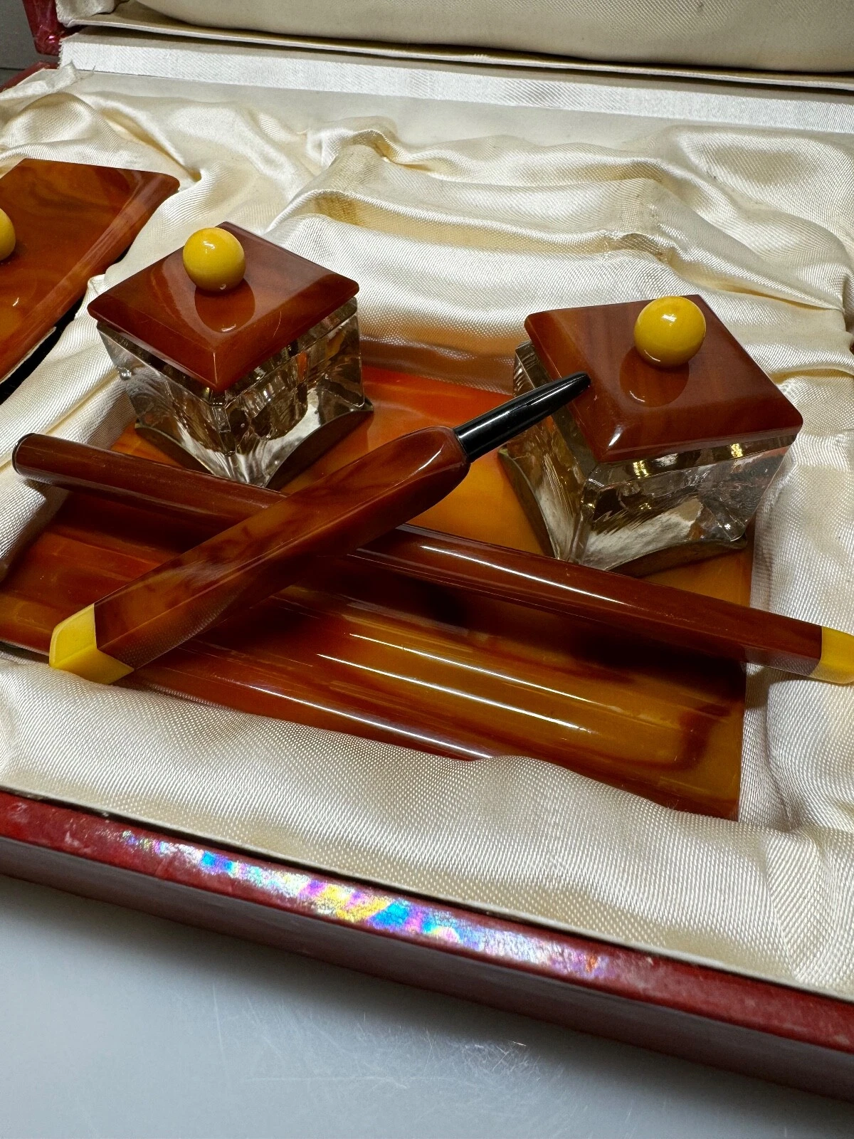 This is a striking Art Deco-era desk set, notable for its “butterscotch” and “cherry juice” marbled aesthetic. The set is housed in its original silk-lined presentation box, suggesting it was a high-quality gift or luxury item when new.