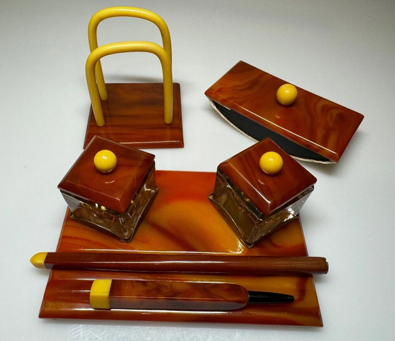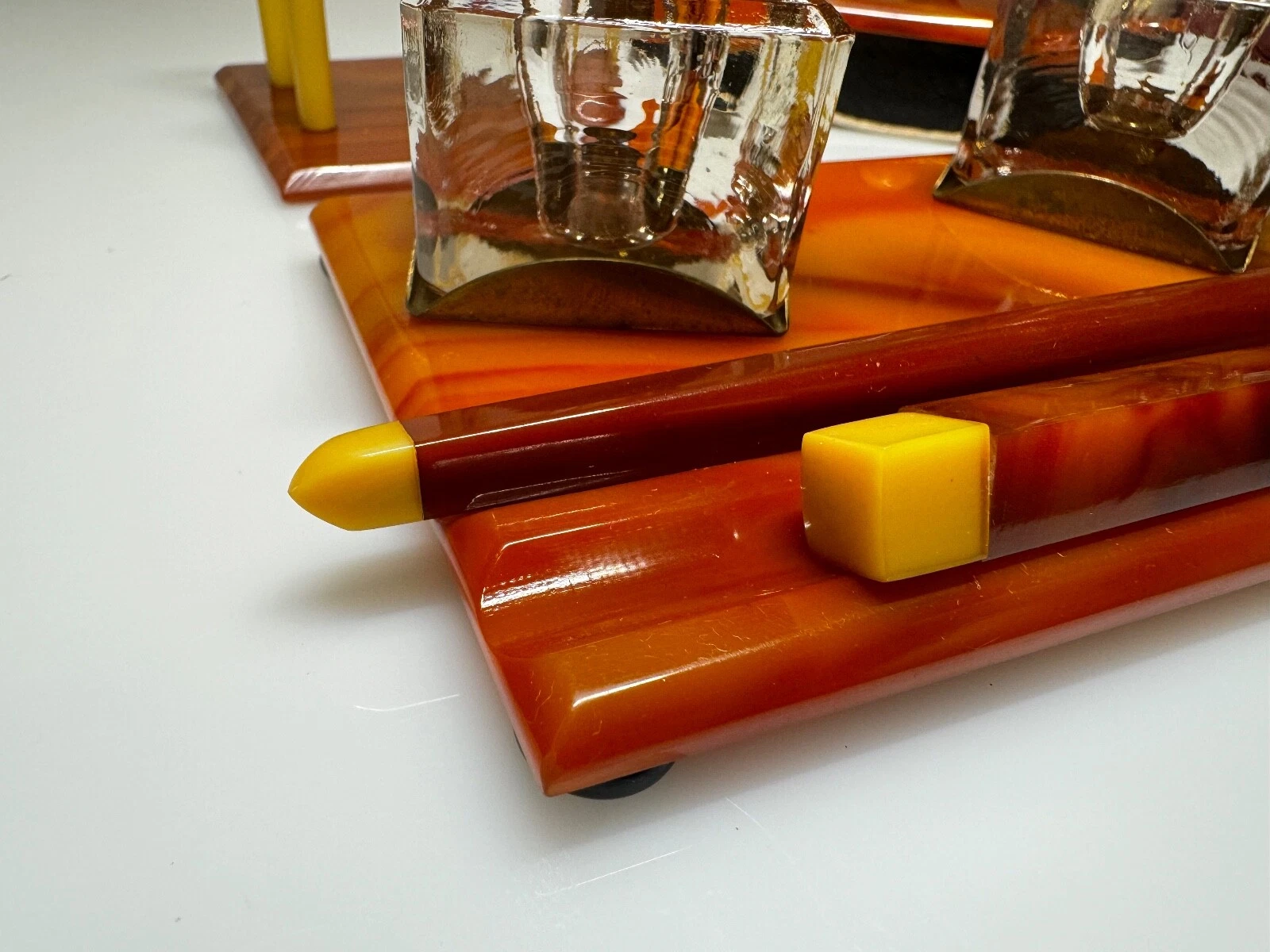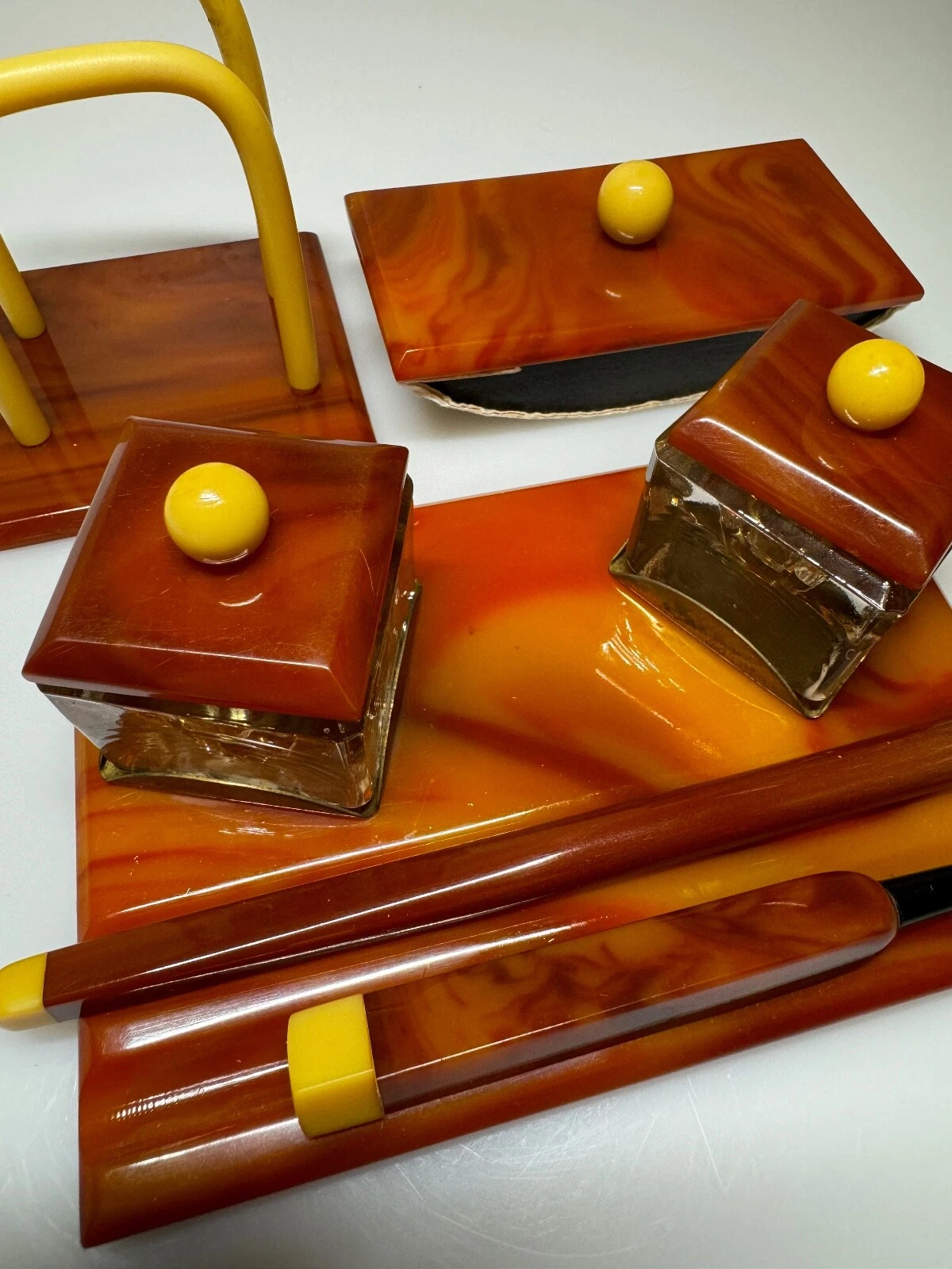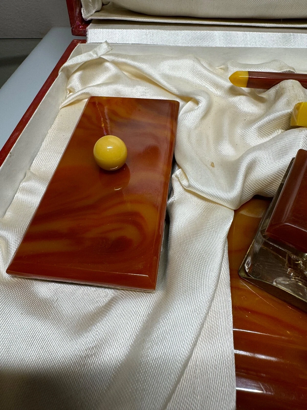 This is a striking Art Deco-era desk set, notable for its “butterscotch” and “cherry juice” marbled aesthetic. The set is housed in its original silk-lined presentation box, suggesting it was a high-quality gift or luxury item when new.