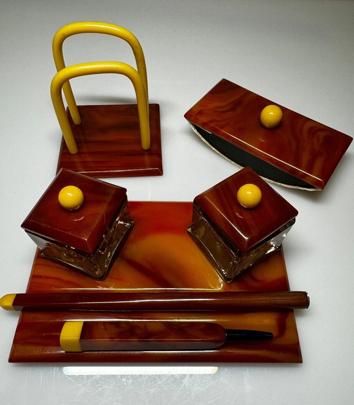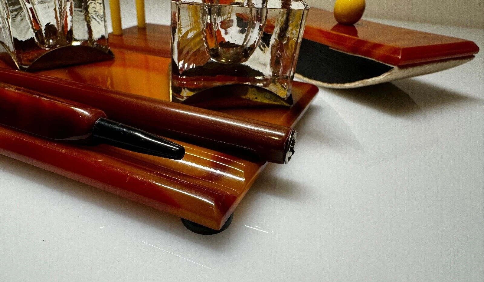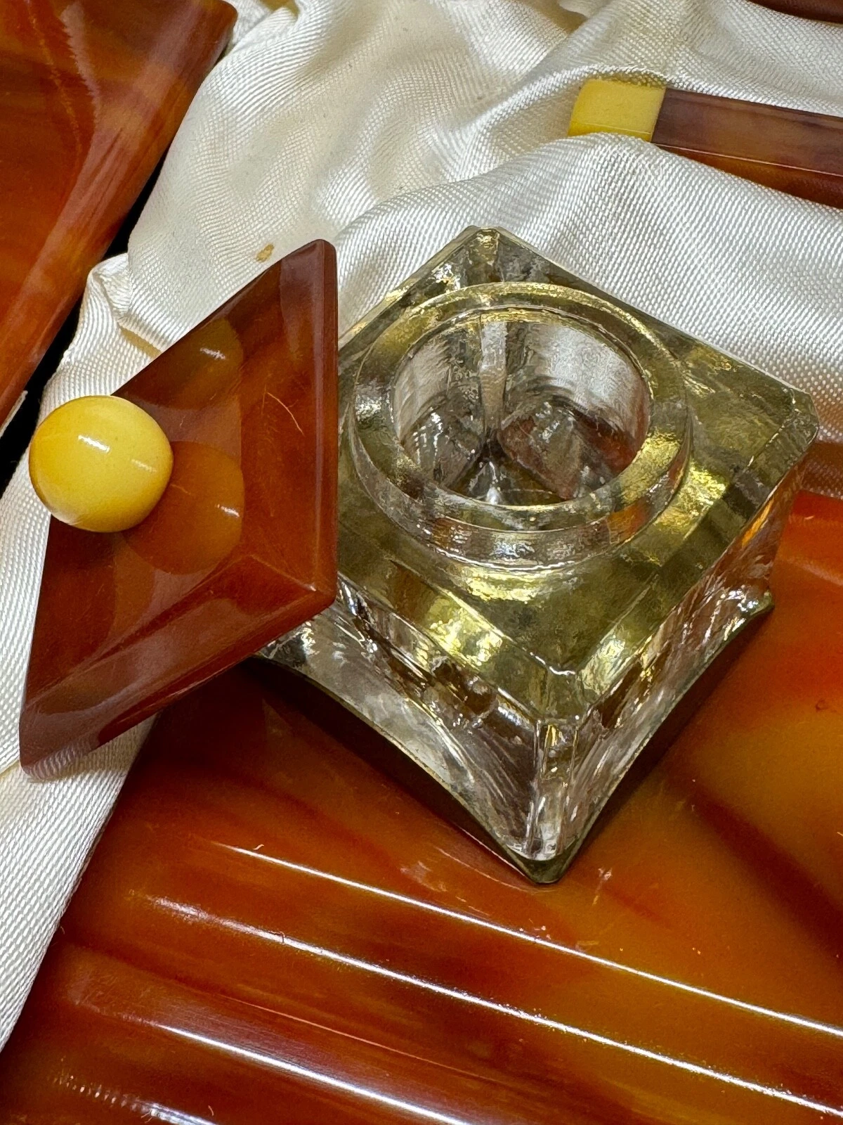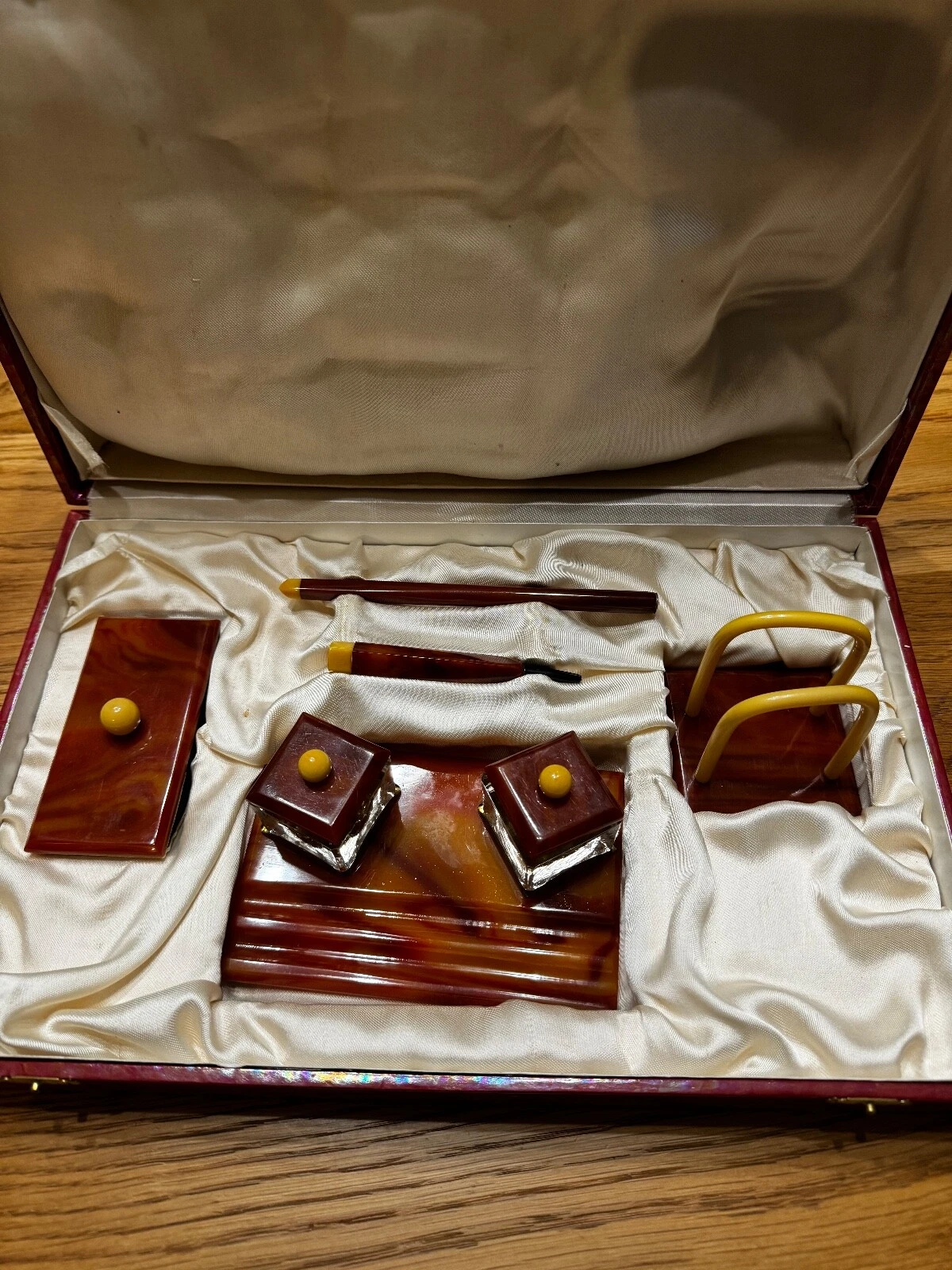 This is a striking Art Deco-era desk set, notable for its “butterscotch” and “cherry juice” marbled aesthetic. The set is housed in its original silk-lined presentation box, suggesting it was a high-quality gift or luxury item when new.