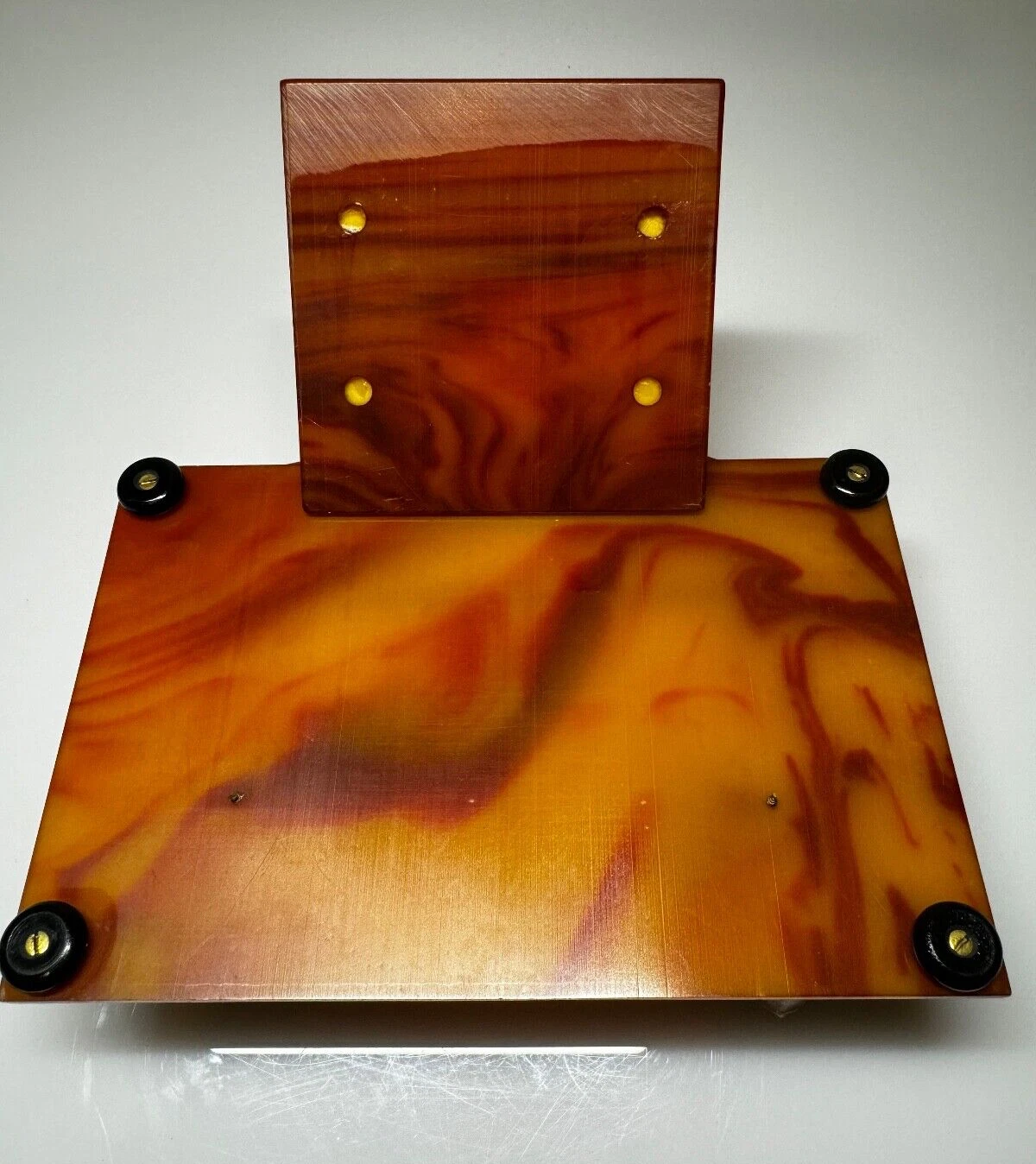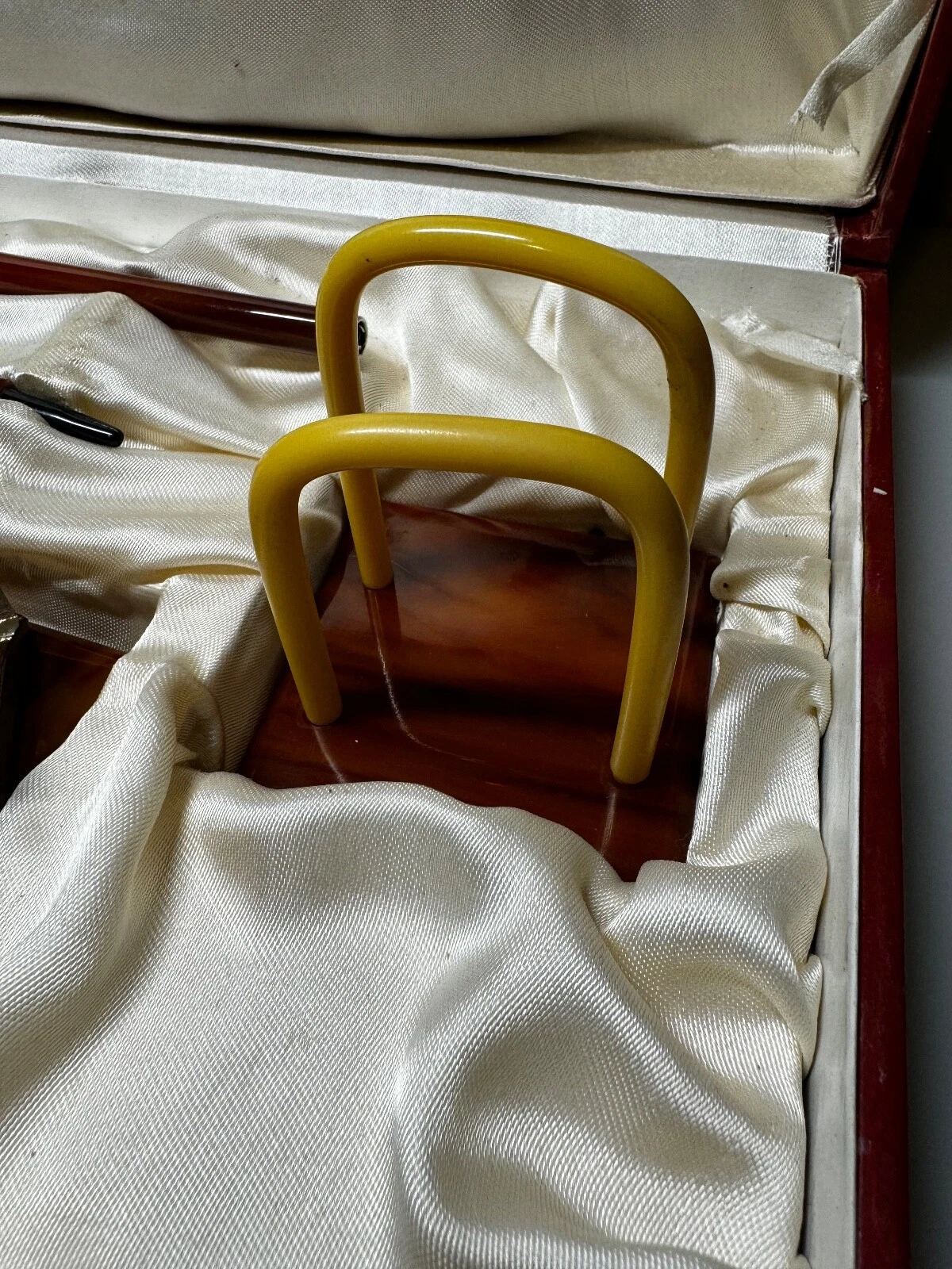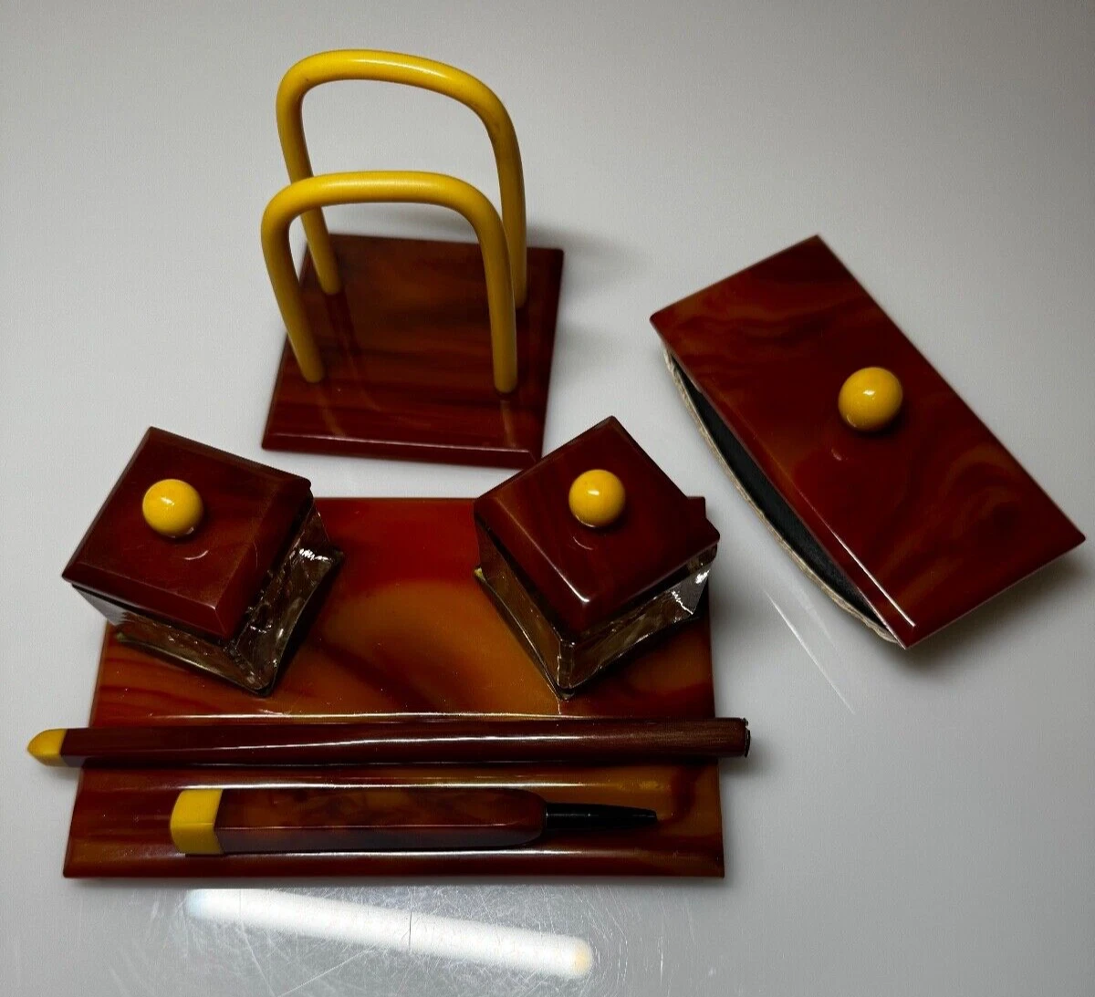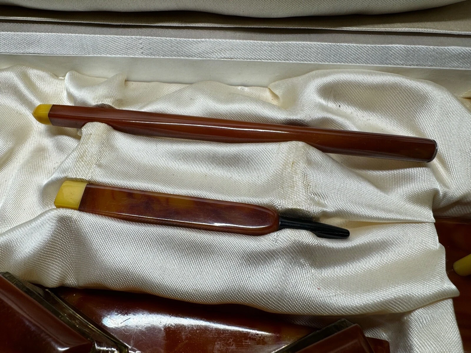 This is a striking Art Deco-era desk set, notable for its “butterscotch” and “cherry juice” marbled aesthetic. The set is housed in its original silk-lined presentation box, suggesting it was a high-quality gift or luxury item when new.
