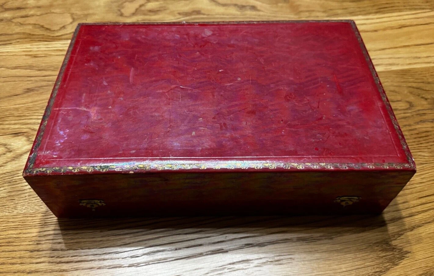 The presence of the original red leatherette presentation case is a rare find and significantly helps preserve the condition of these often-fragile early plastics.