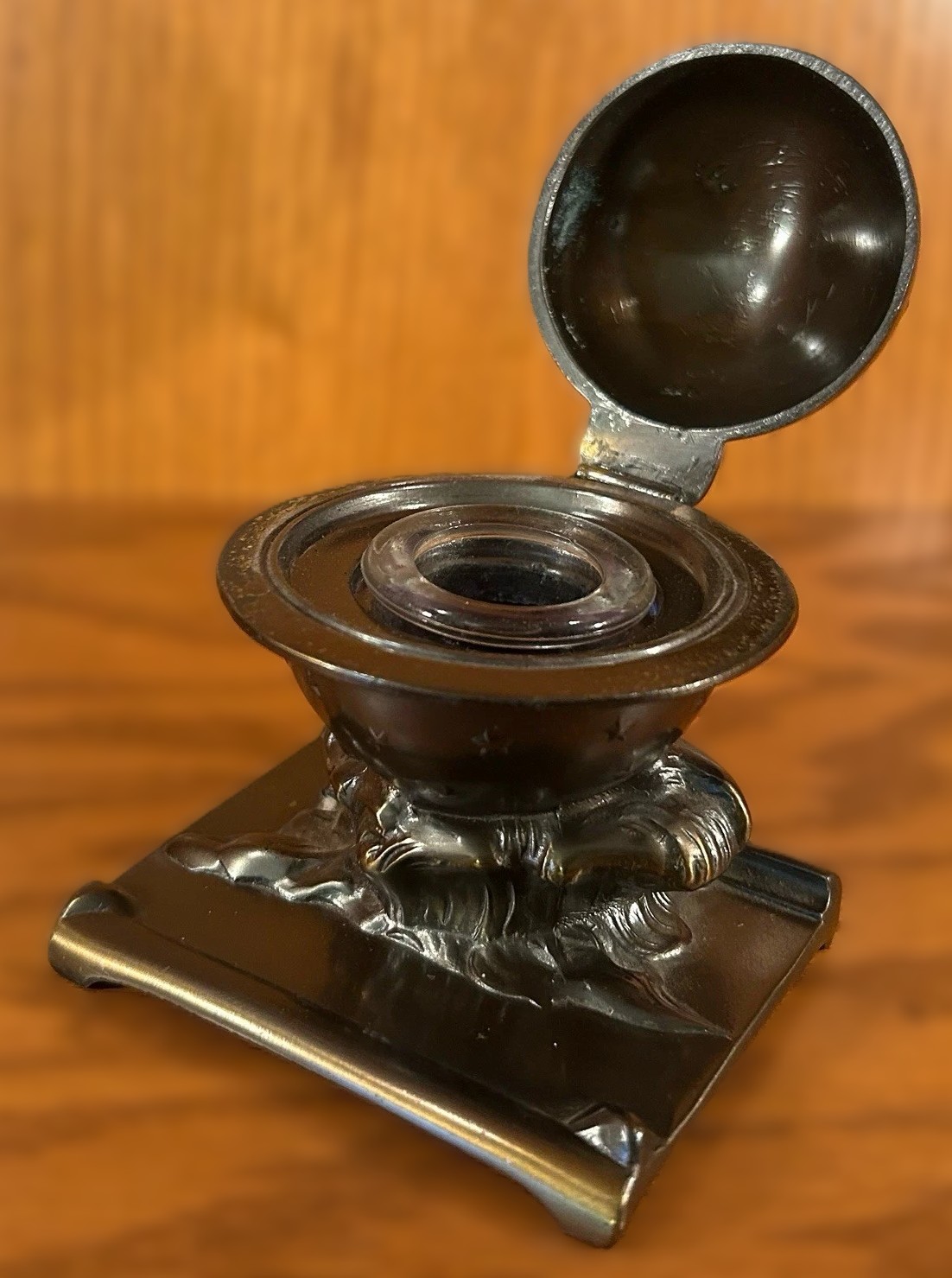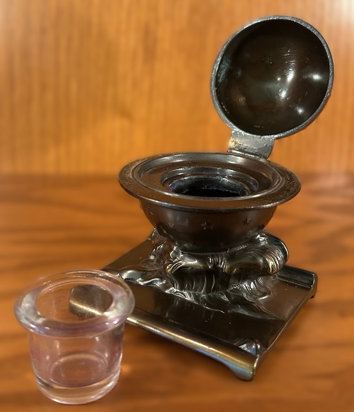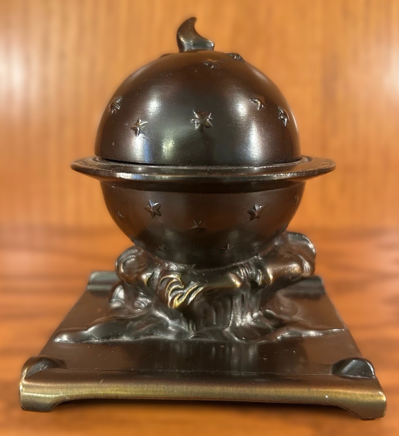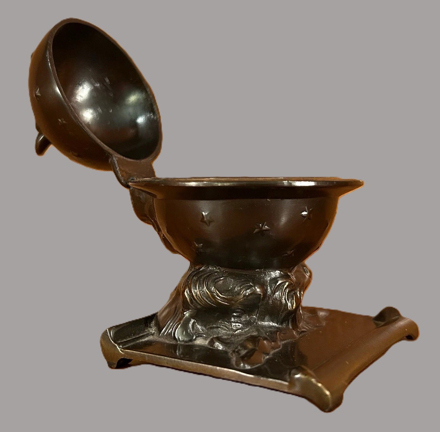 This inkwell is an example of celestial-themed metalware from the early 20th century, produced by the Kronheim & Oldenbusch (K&O) Company.
