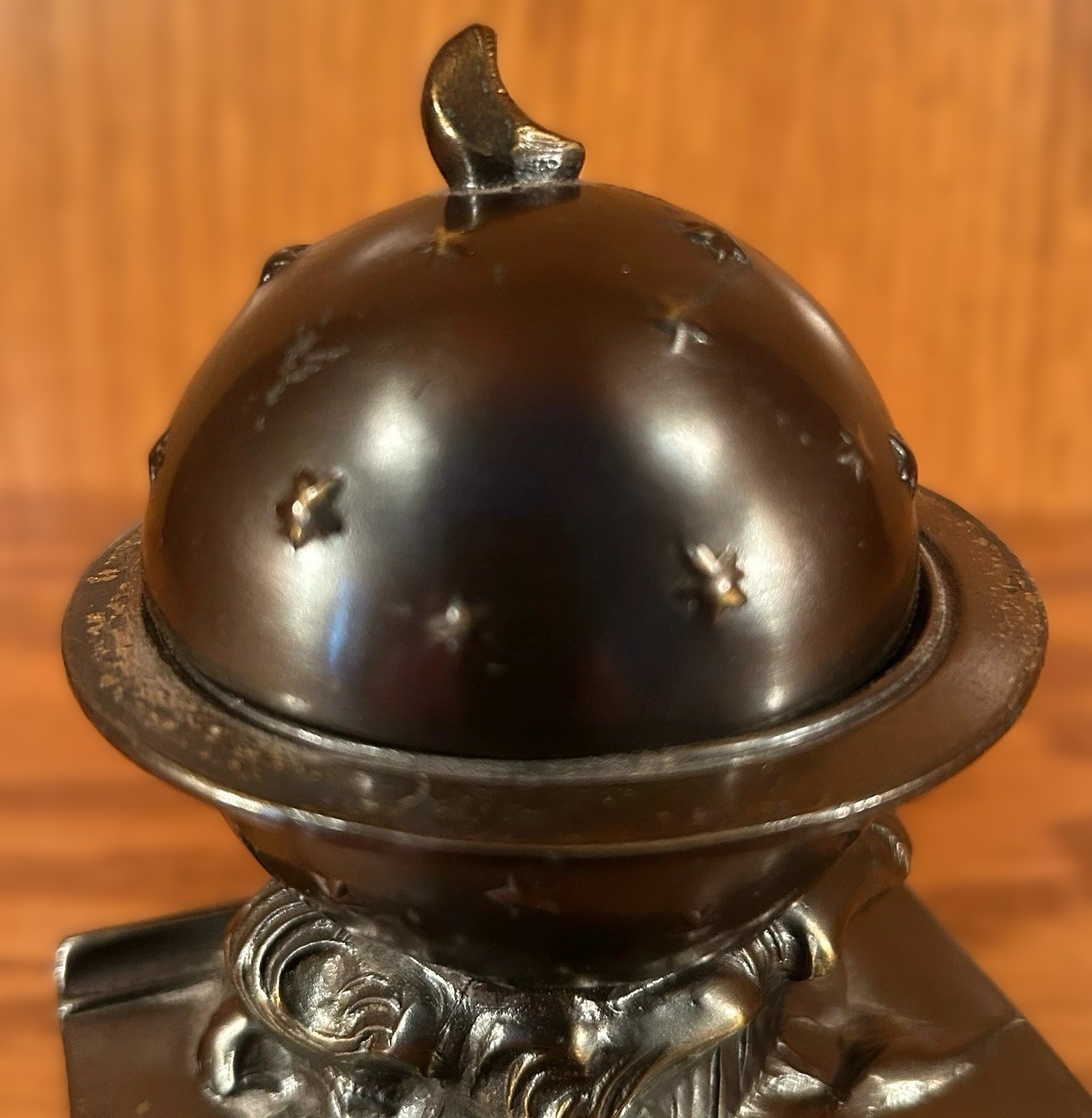 - The Sculptural Base: The base features high-relief, stylized billowing clouds. In celestial iconography, the heavens are often depicted resting upon or emerging from a bank of clouds, signifying that the globe exists in a space “above” the earthly realm.