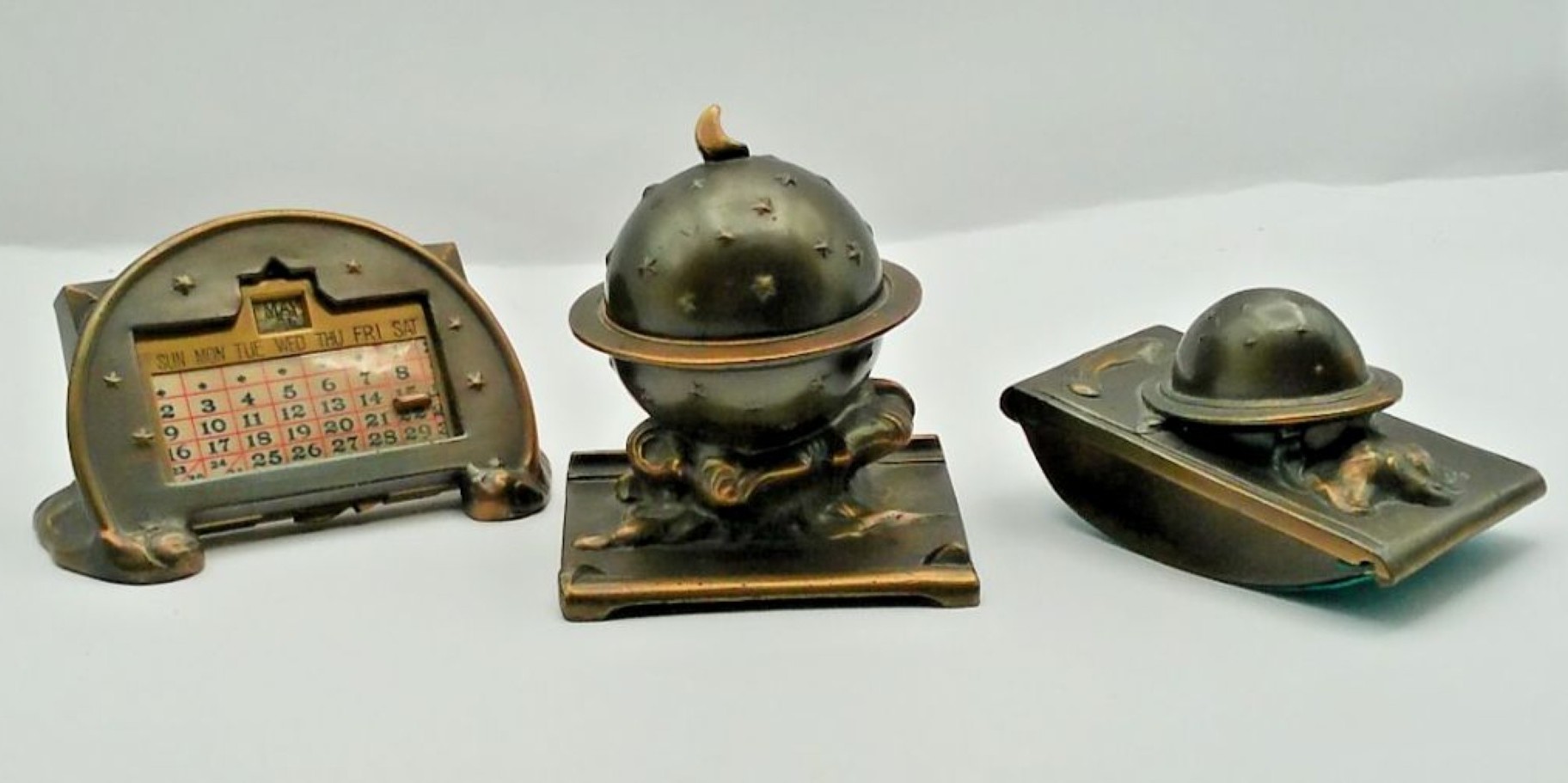 Because these were made of white metal (spelter) with a “bronze” or “antique” electroplated finish, they were high-style luxury items for the average American home, bringing the mysteries of the cosmos to the everyday writing desk.