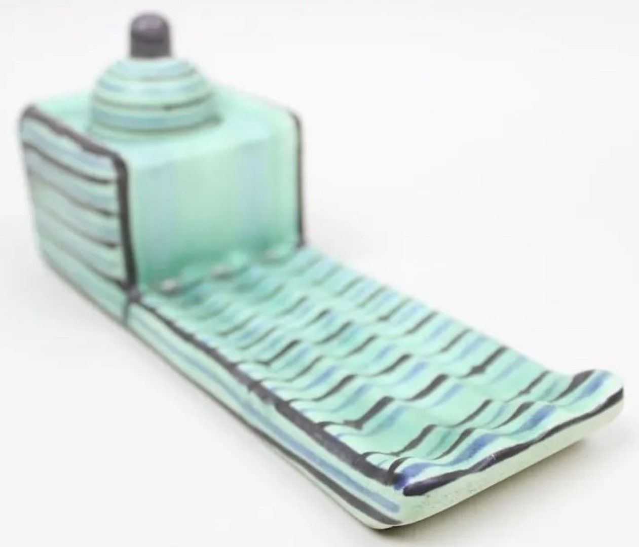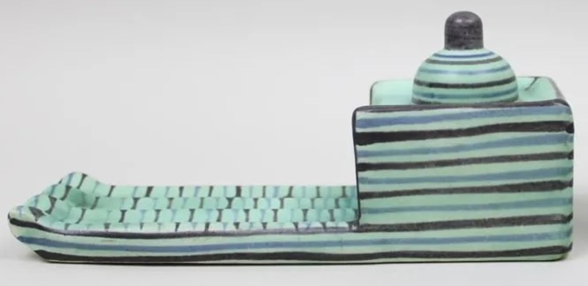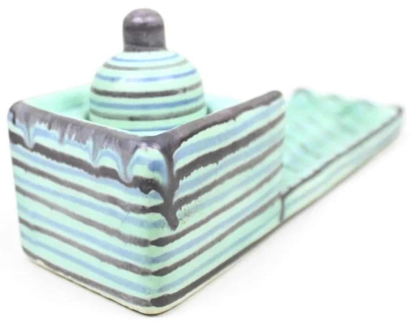 An elongated tray with grooves for pens is attached to an inkwell with a separate lid. This turquoise inkstand is decorated with a pattern of irregular black and blue stripes. The underside is marked “Germany” and has an unidentified mark.