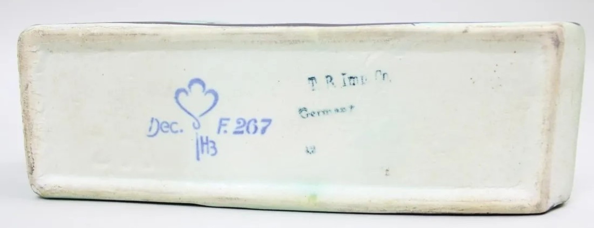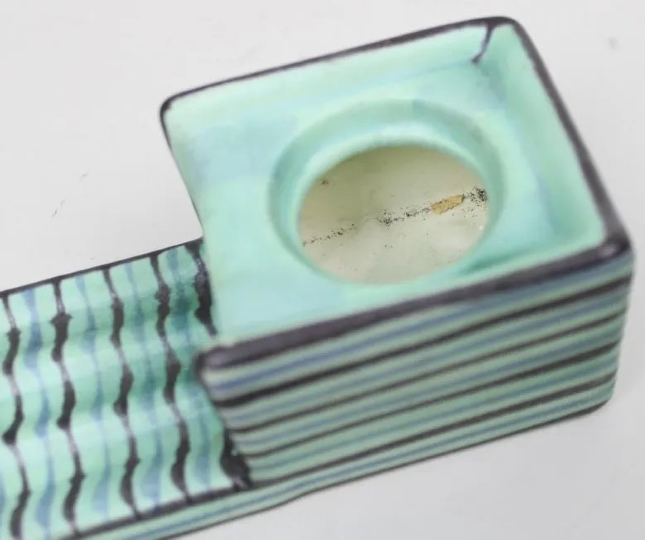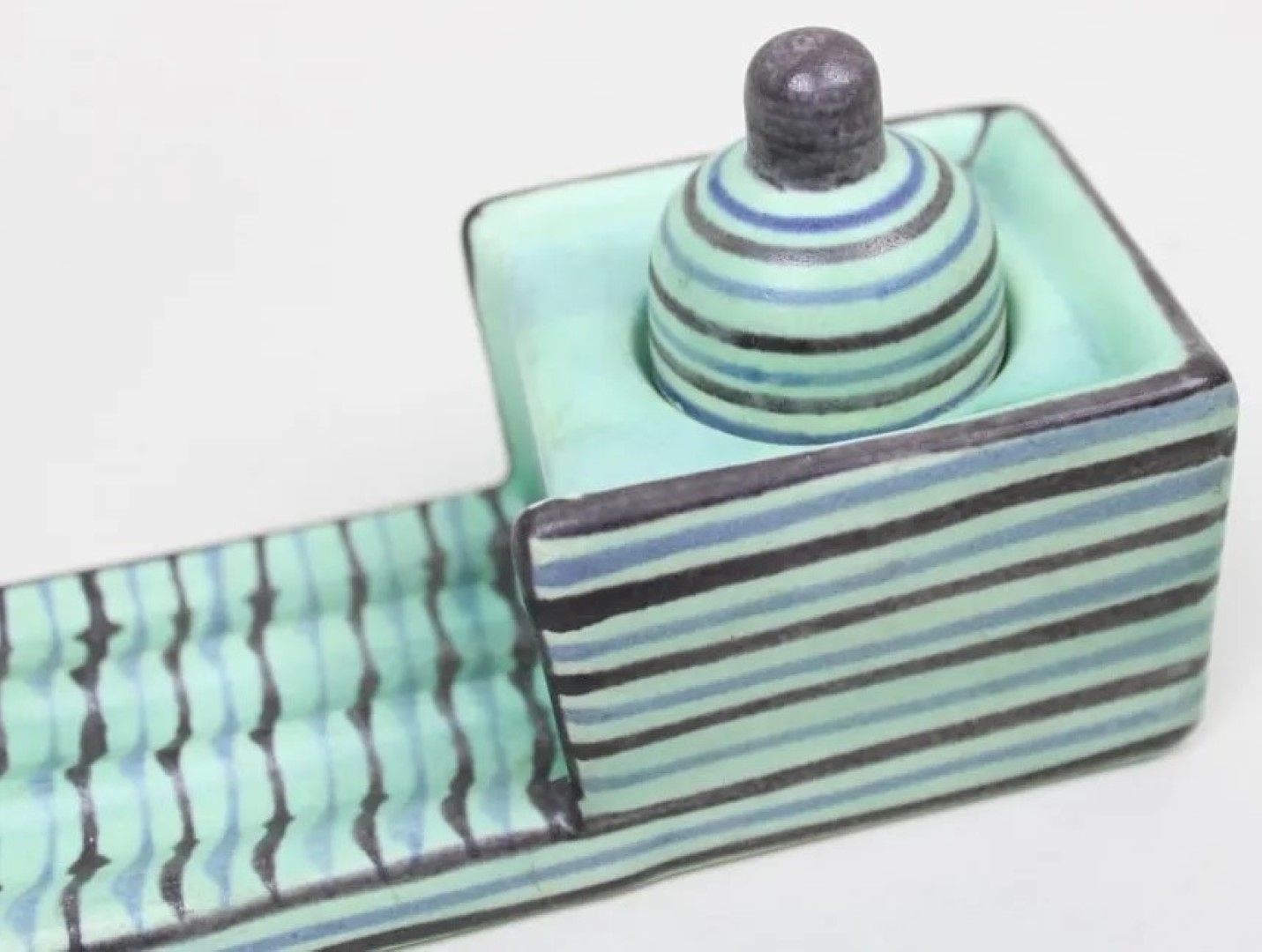 An elongated tray with grooves for pens is attached to an inkwell with a separate lid. This turquoise inkstand is decorated with a pattern of irregular black and blue stripes. The underside is marked “Germany” and has an unidentified mark.