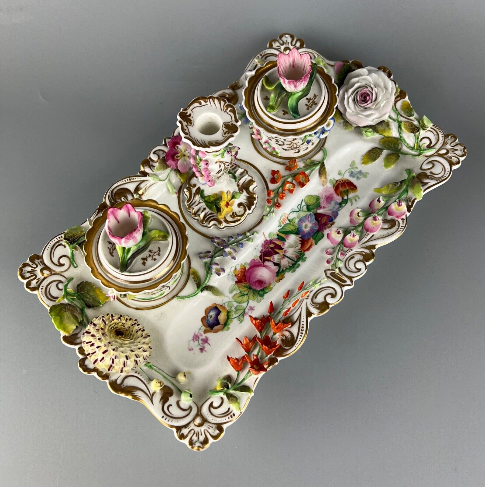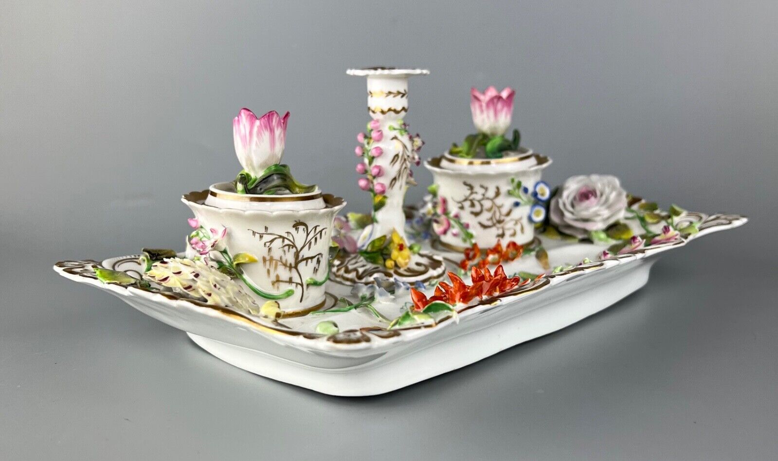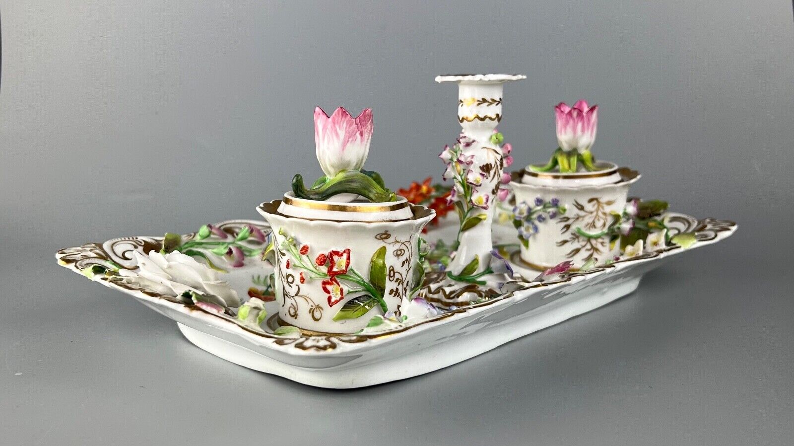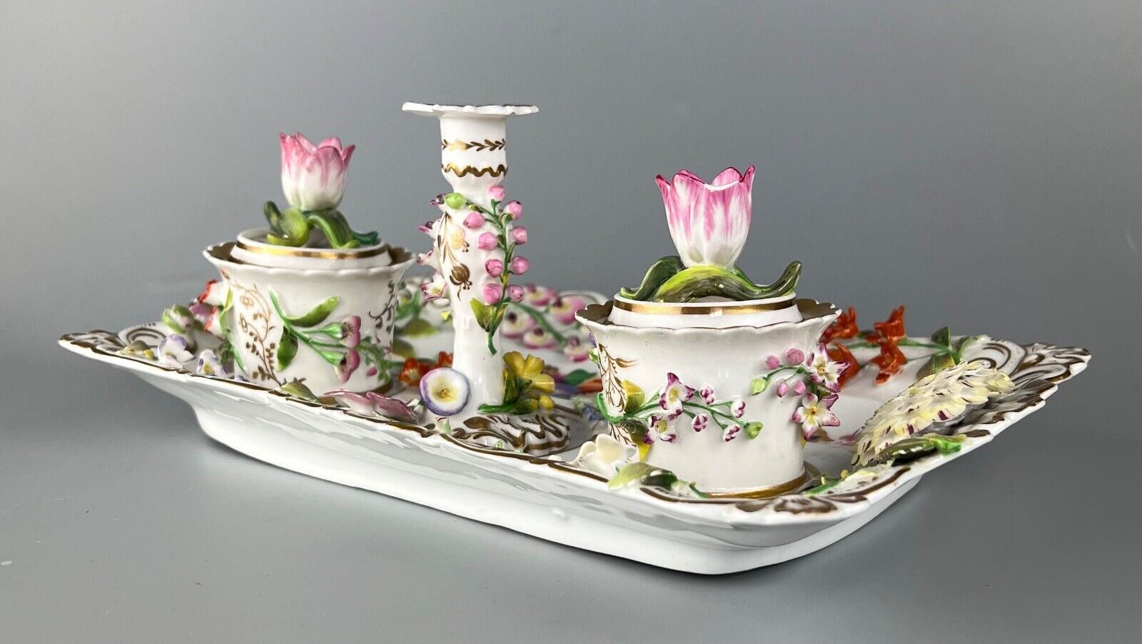 An elaborate porcelain inkstand, enriched with gilt, Coalbrookdale-style flowers, elaborately molded tulip-top inkwells, together with a free-standing, floral encrusted taperstick. Elaborately gilded, with finely painted floral sprays to the inkstand. Chamberlain marks on the base of the tray, tulip-top covers, and the underside of the taper stick.