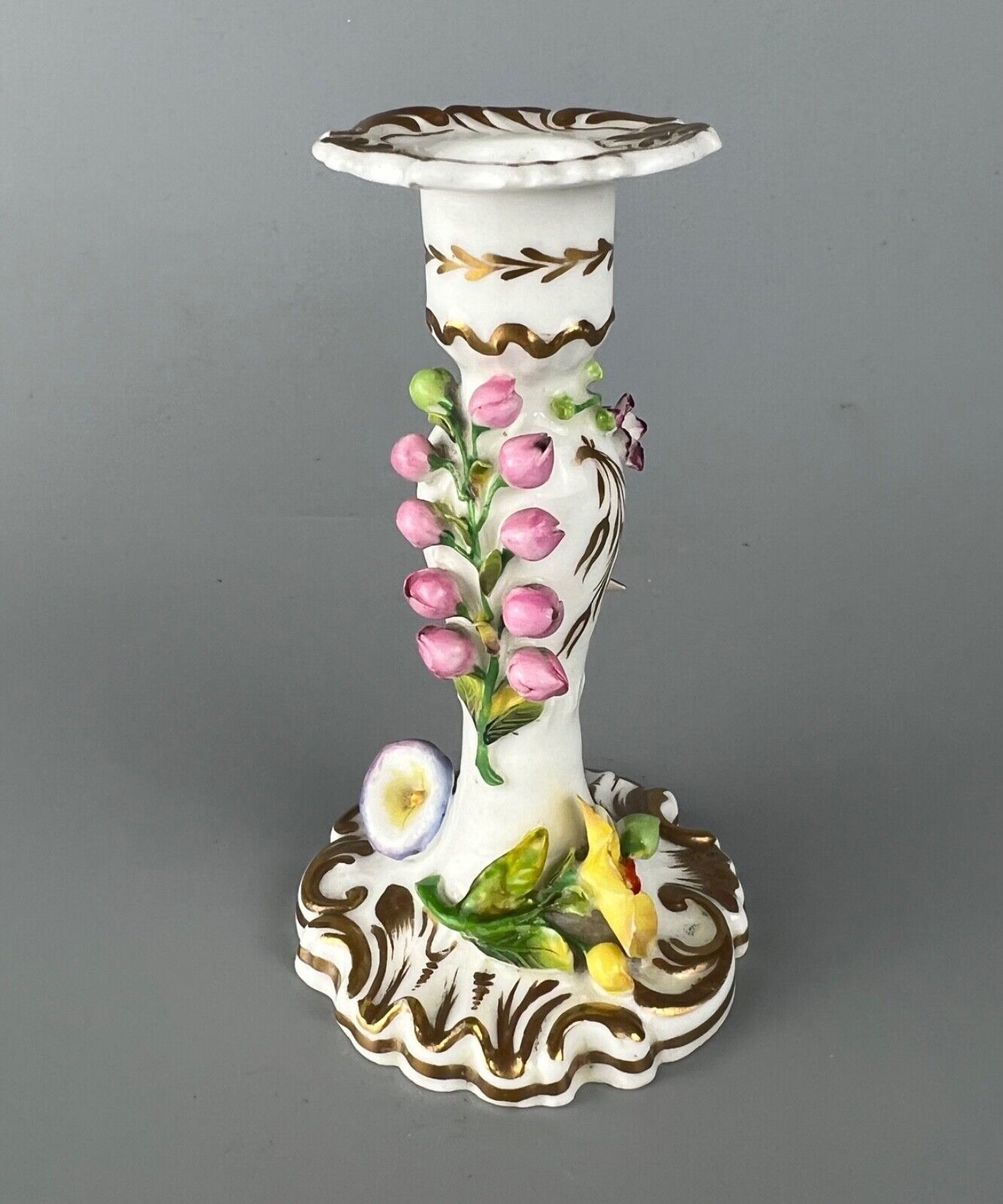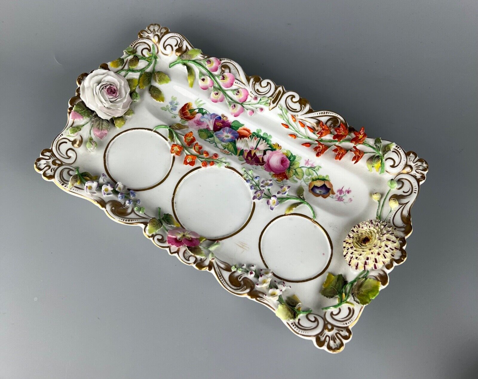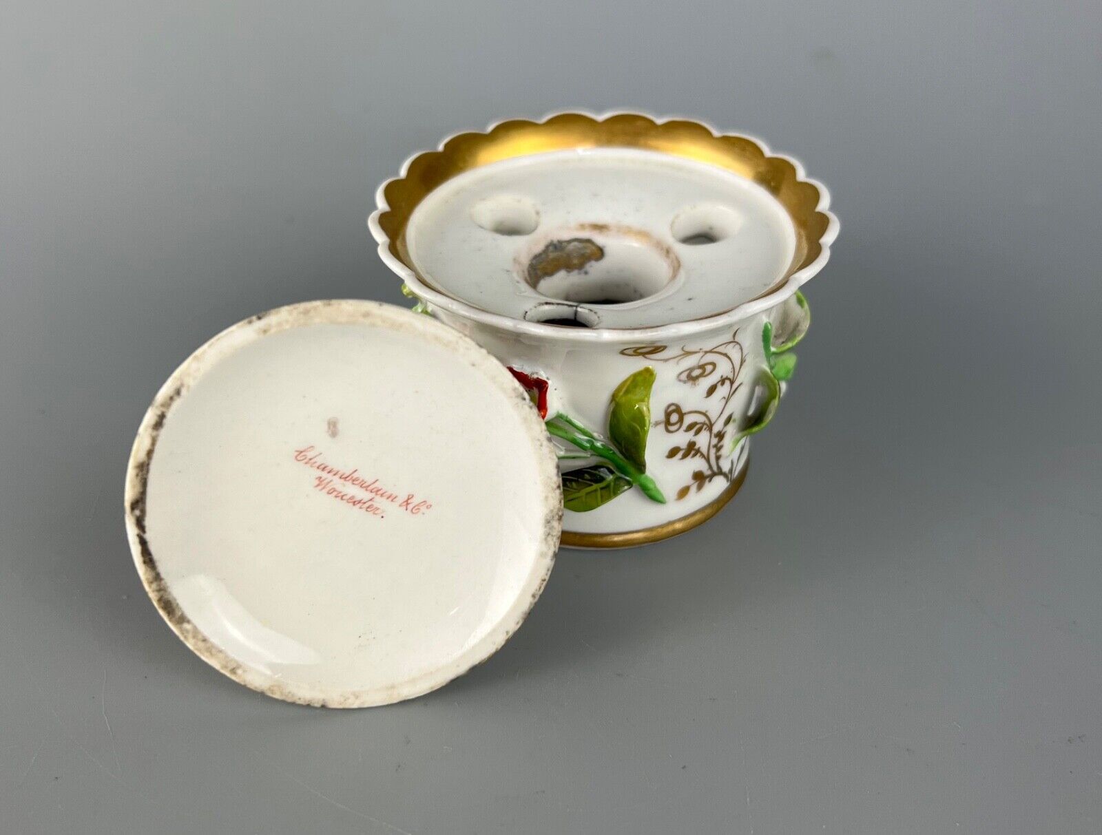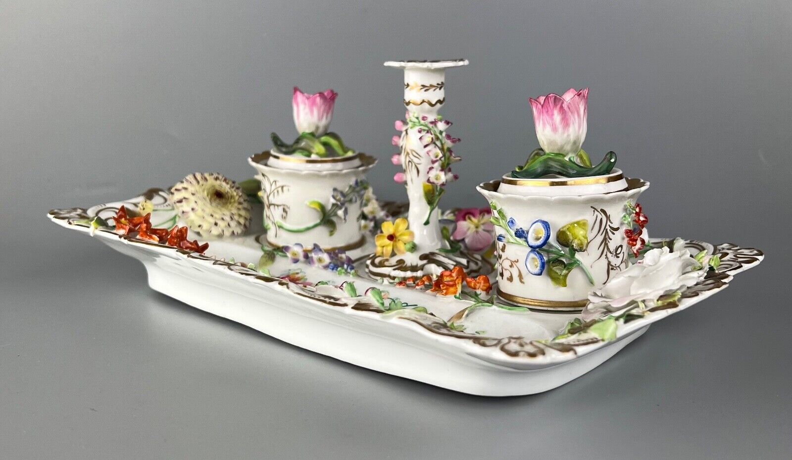 An elaborate porcelain inkstand, enriched with gilt, Coalbrookdale-style flowers, elaborately molded tulip-top inkwells, together with a free-standing, floral encrusted taperstick. Elaborately gilded, with finely painted floral sprays to the inkstand. Chamberlain marks on the base of the tray, tulip-top covers, and the underside of the taper stick.