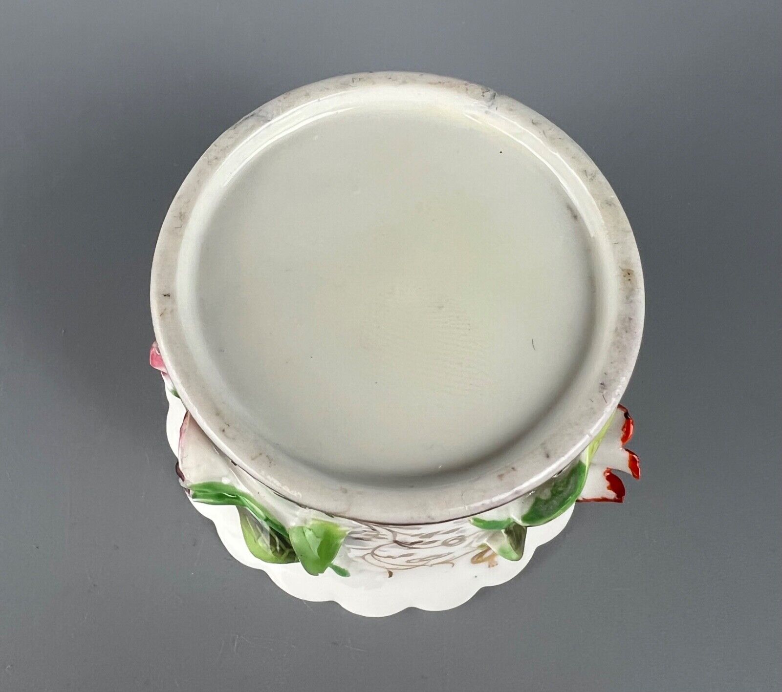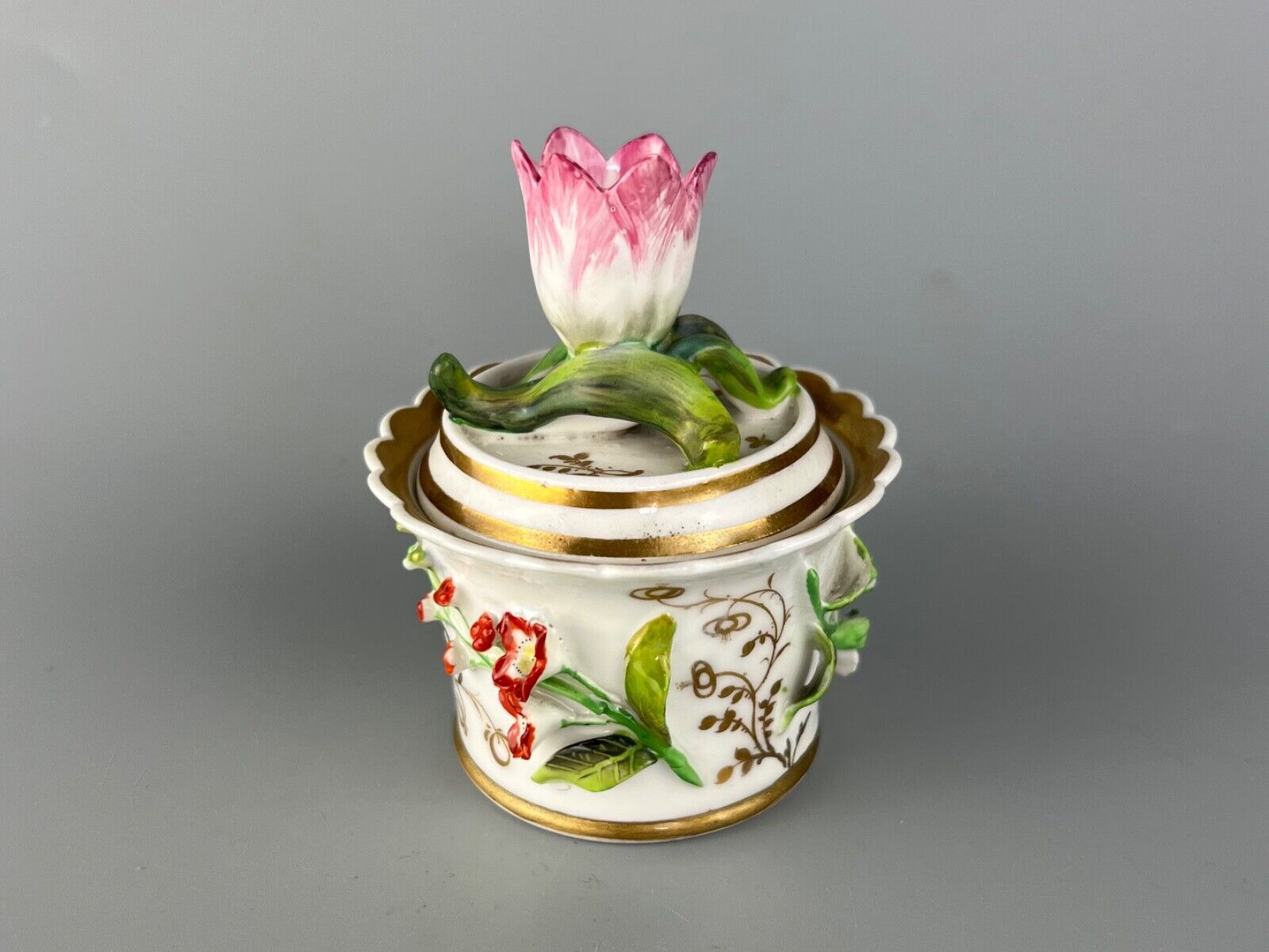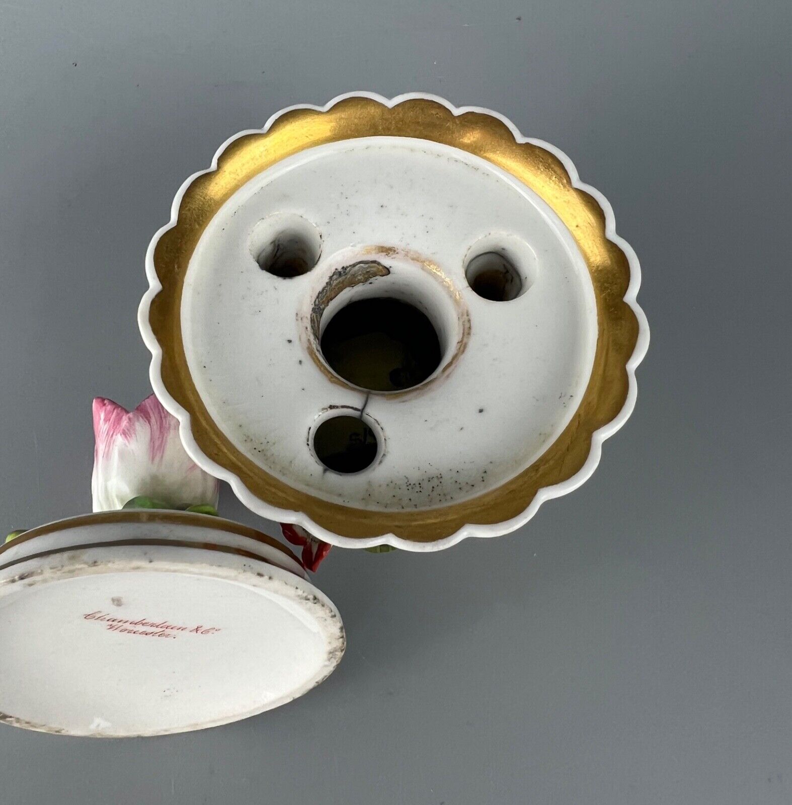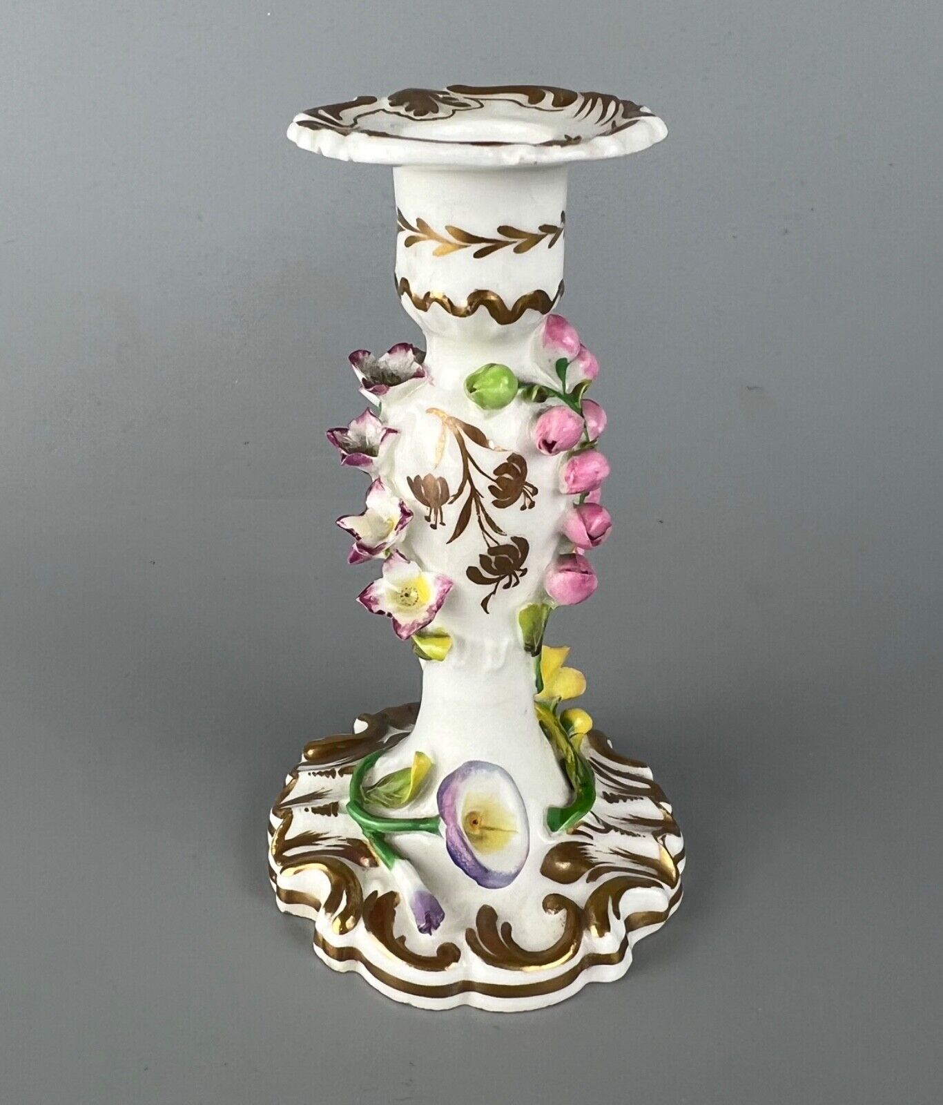 An elaborate porcelain inkstand, enriched with gilt, Coalbrookdale-style flowers, elaborately molded tulip-top inkwells, together with a free-standing, floral encrusted taperstick. Elaborately gilded, with finely painted floral sprays to the inkstand. Chamberlain marks on the base of the tray, tulip-top covers, and the underside of the taper stick.