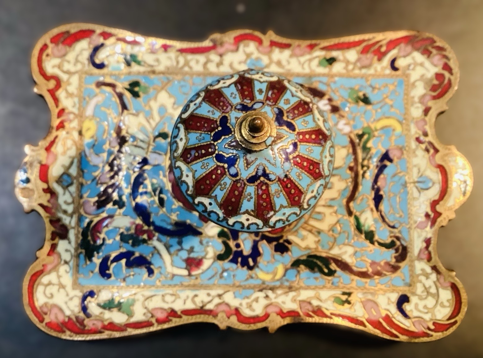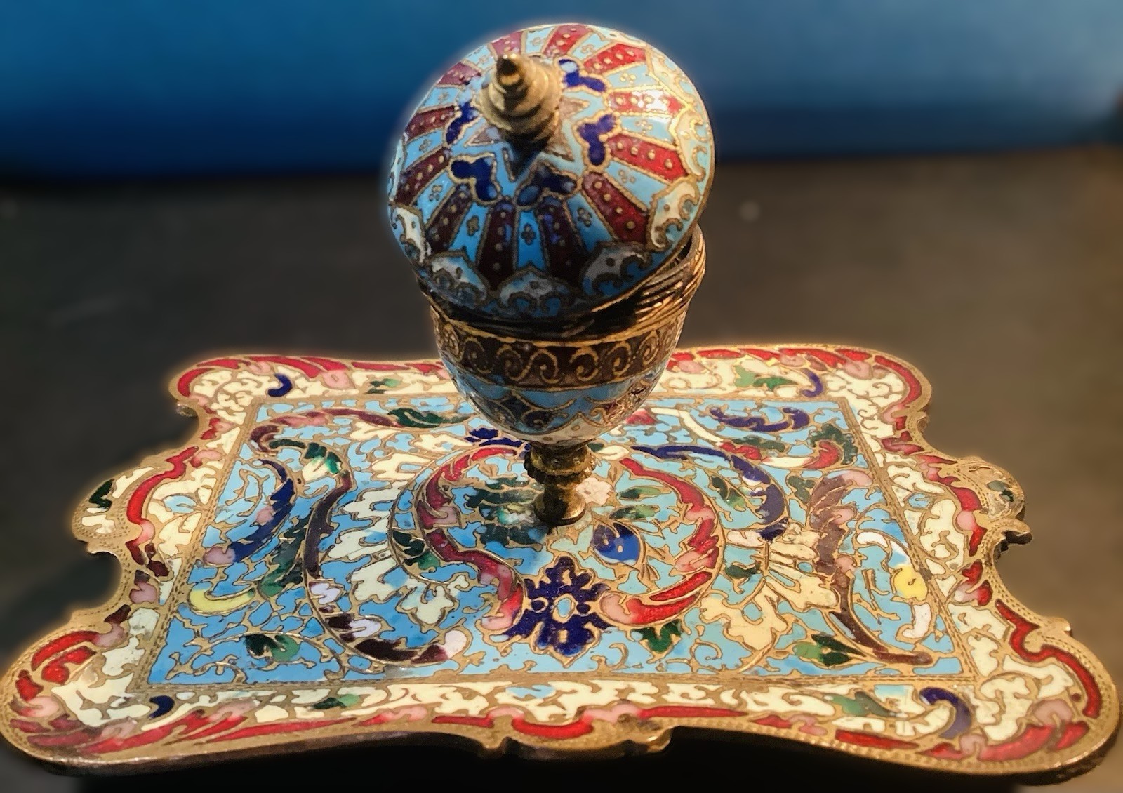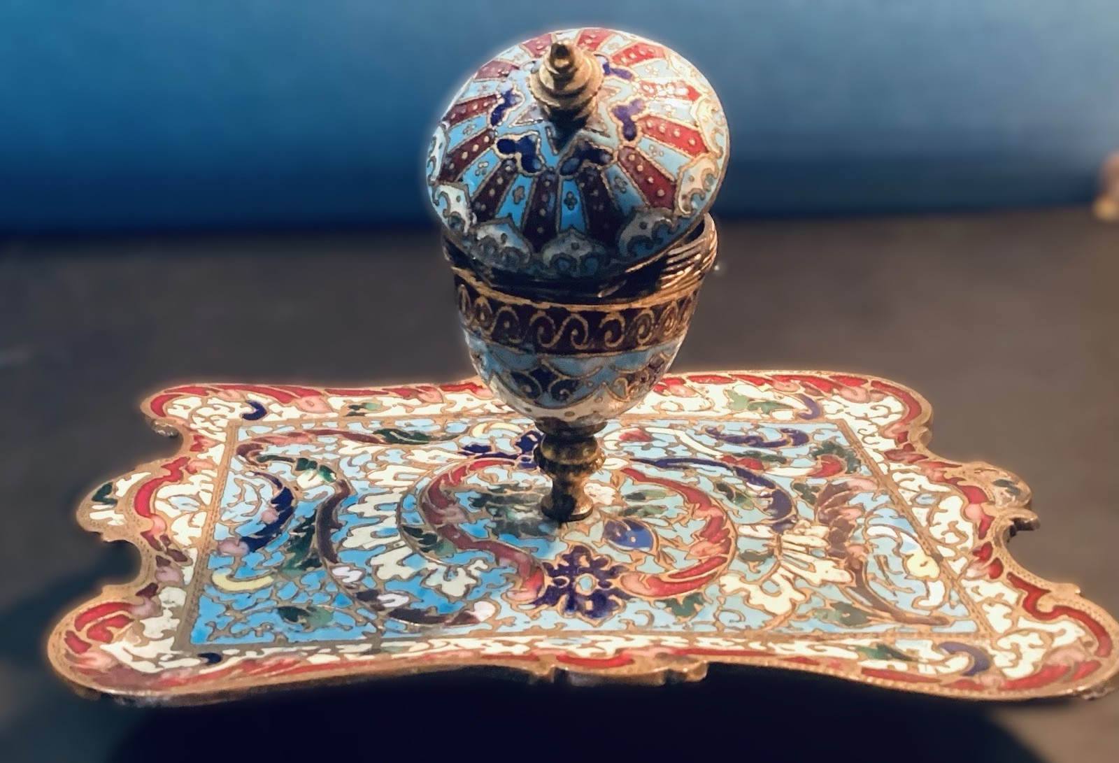 - The Inkwell: The vessel is adorned with intricate enamel patterns. The hinged lid features a radiating “starburst” or “petal” design in vibrant turquoise, deep red, and cobalt blue. It is topped with a simple, turned brass finial. The insert is missing.