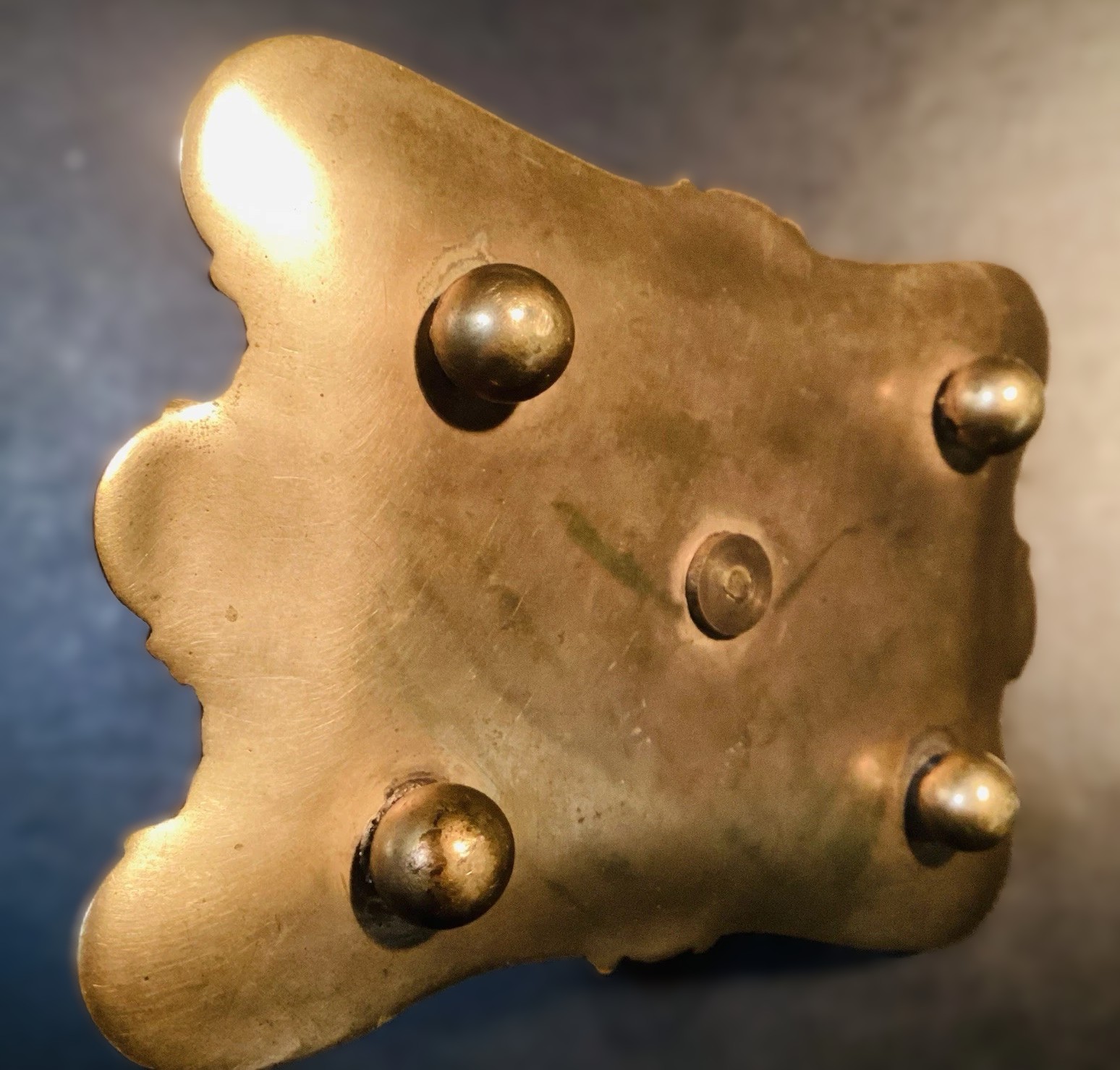 - The Underside: The base is supported by four classic “bun” feet made of solid brass, and the center shows the mounting screw that secures the inkwell to the tray.