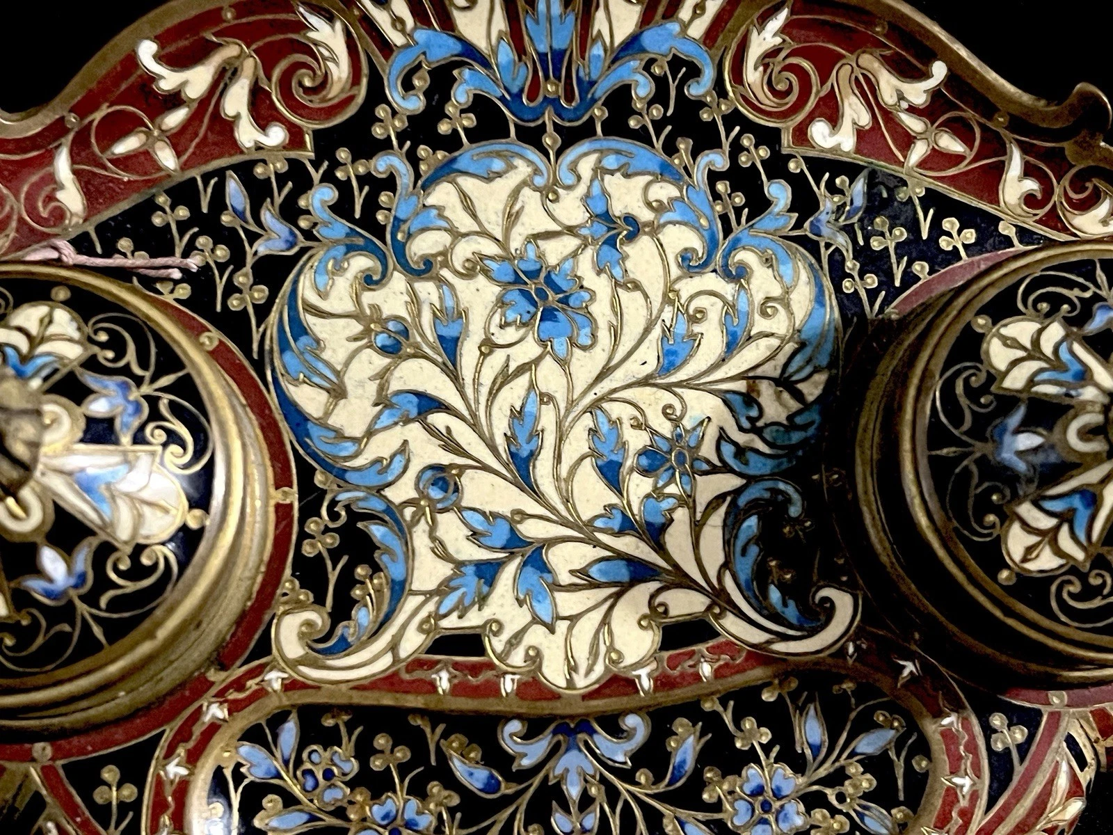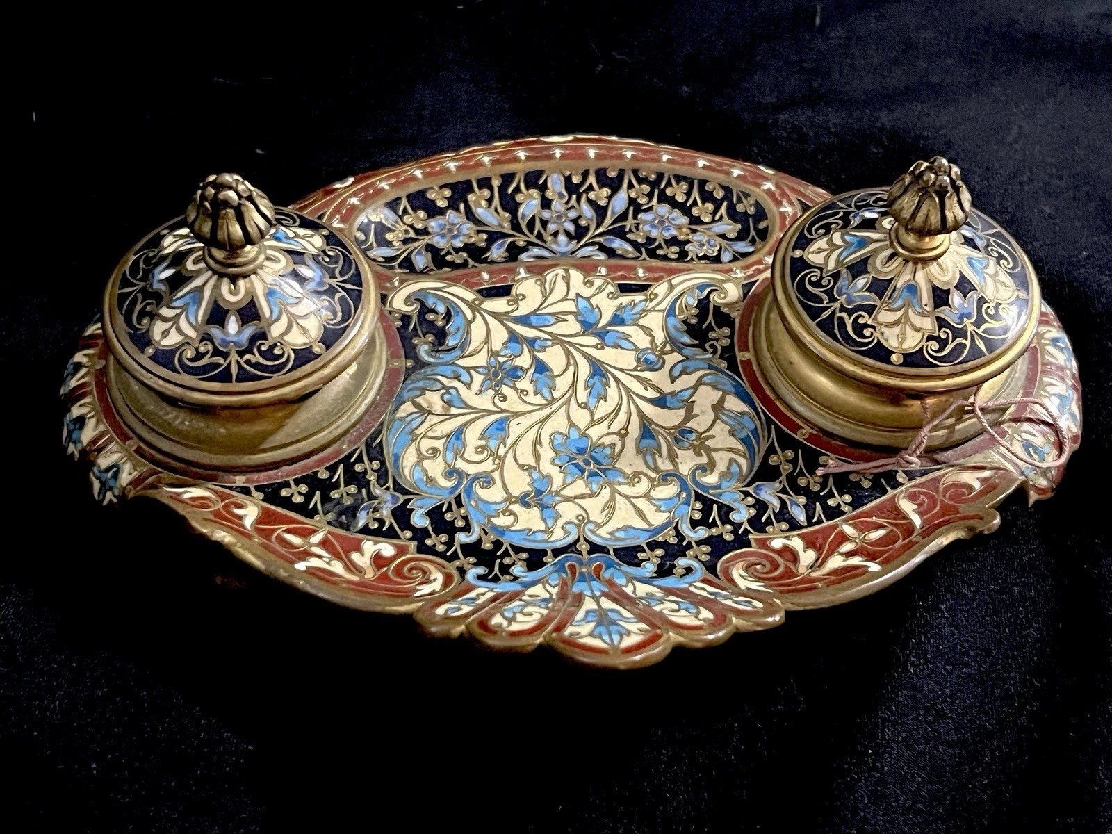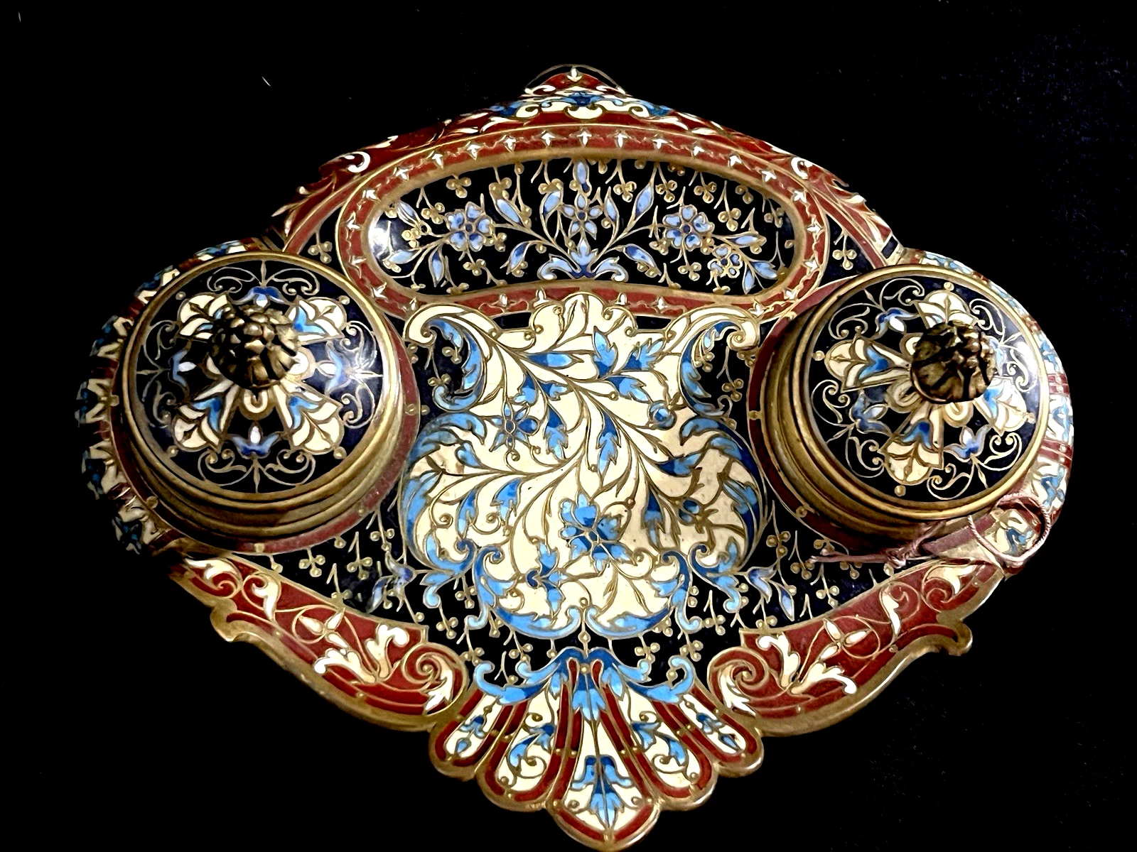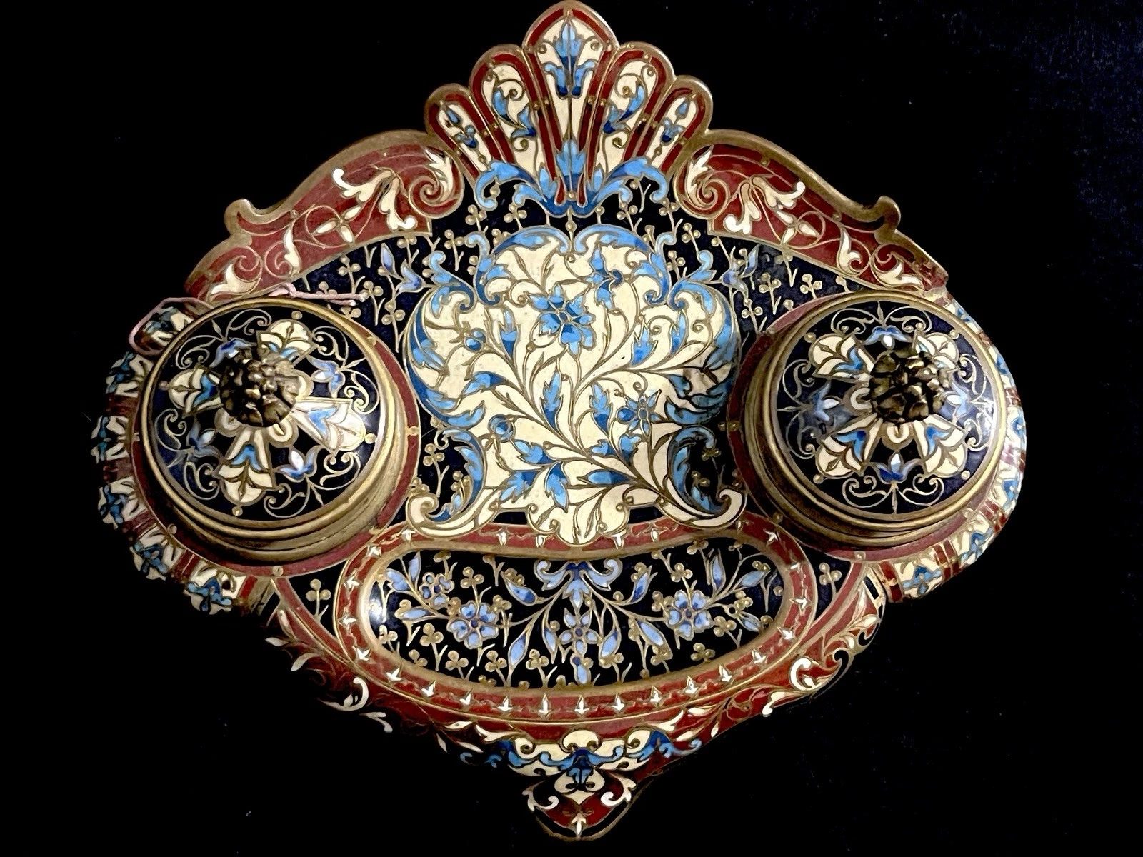- Between the inkwells lies a recessed tray, likely intended for pens or blotting tools, bordered by intricate enamel vines and blossoms.