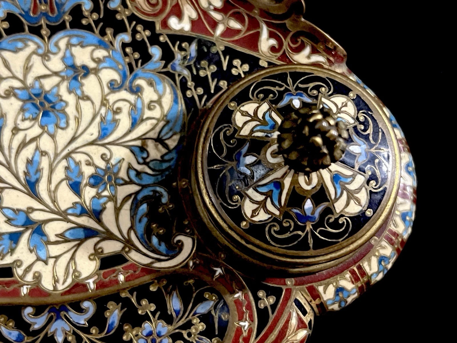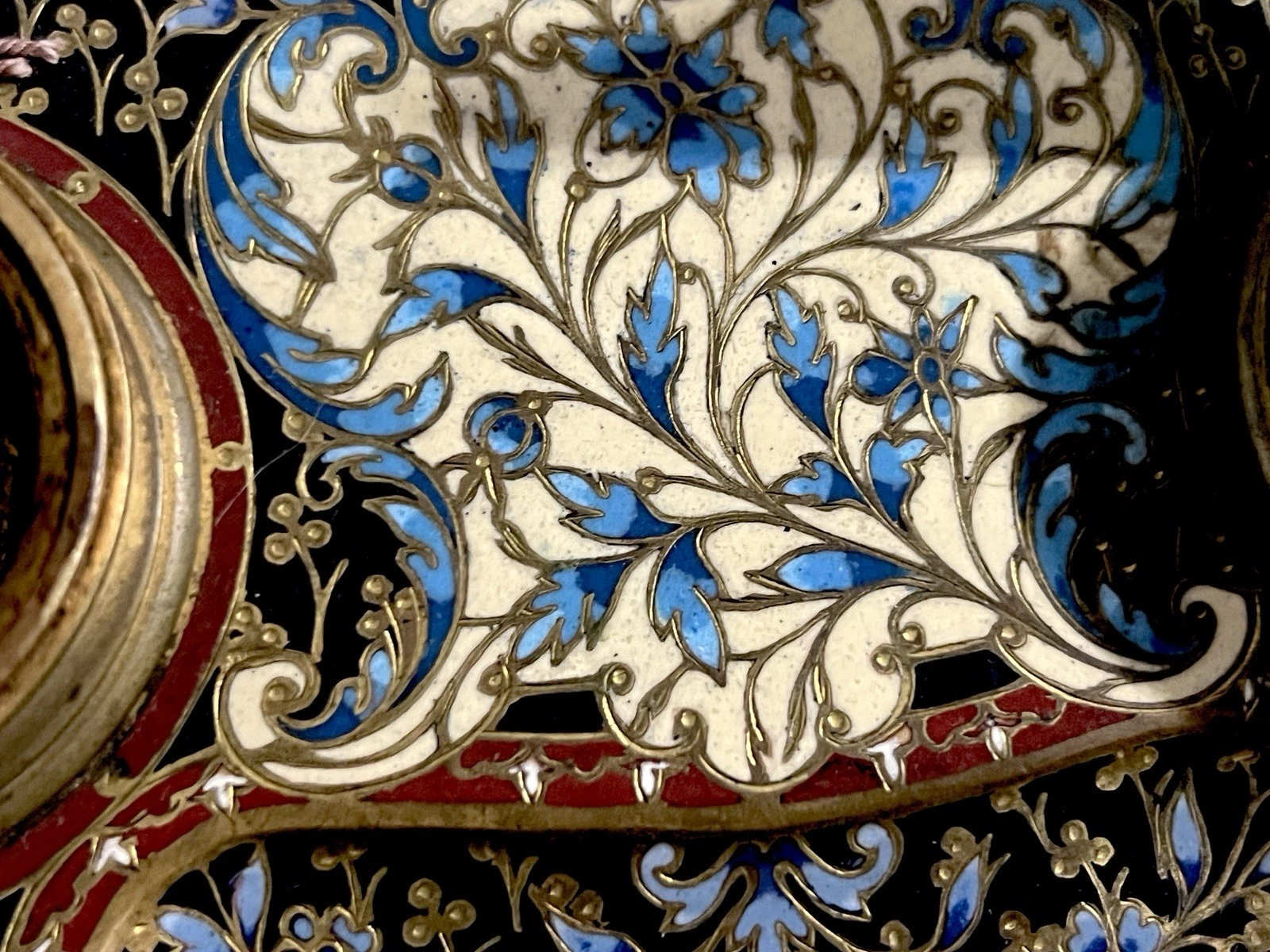 - The enamel work features a rich palette of cobalt blue, ivory white, crimson red, and gold.