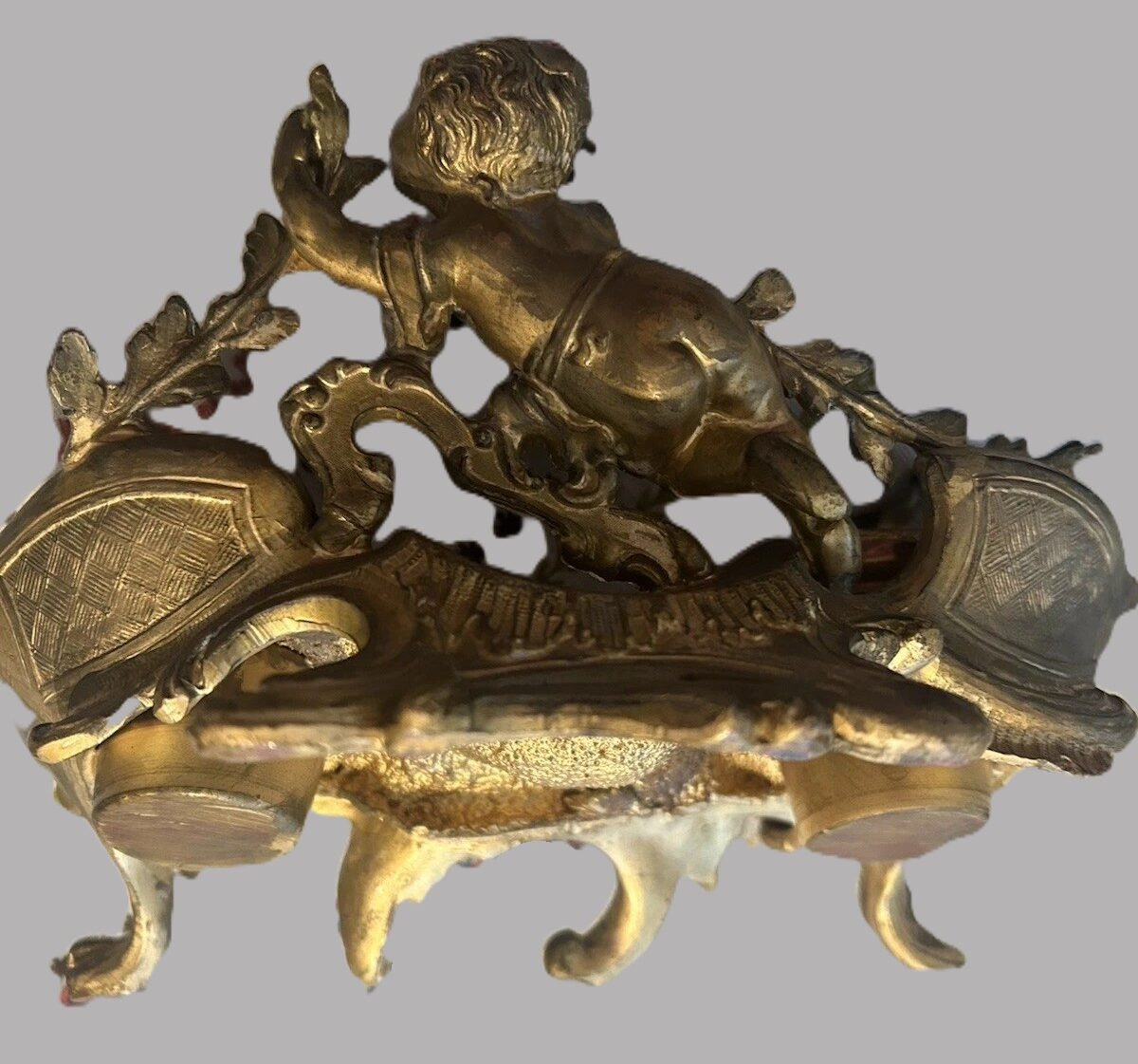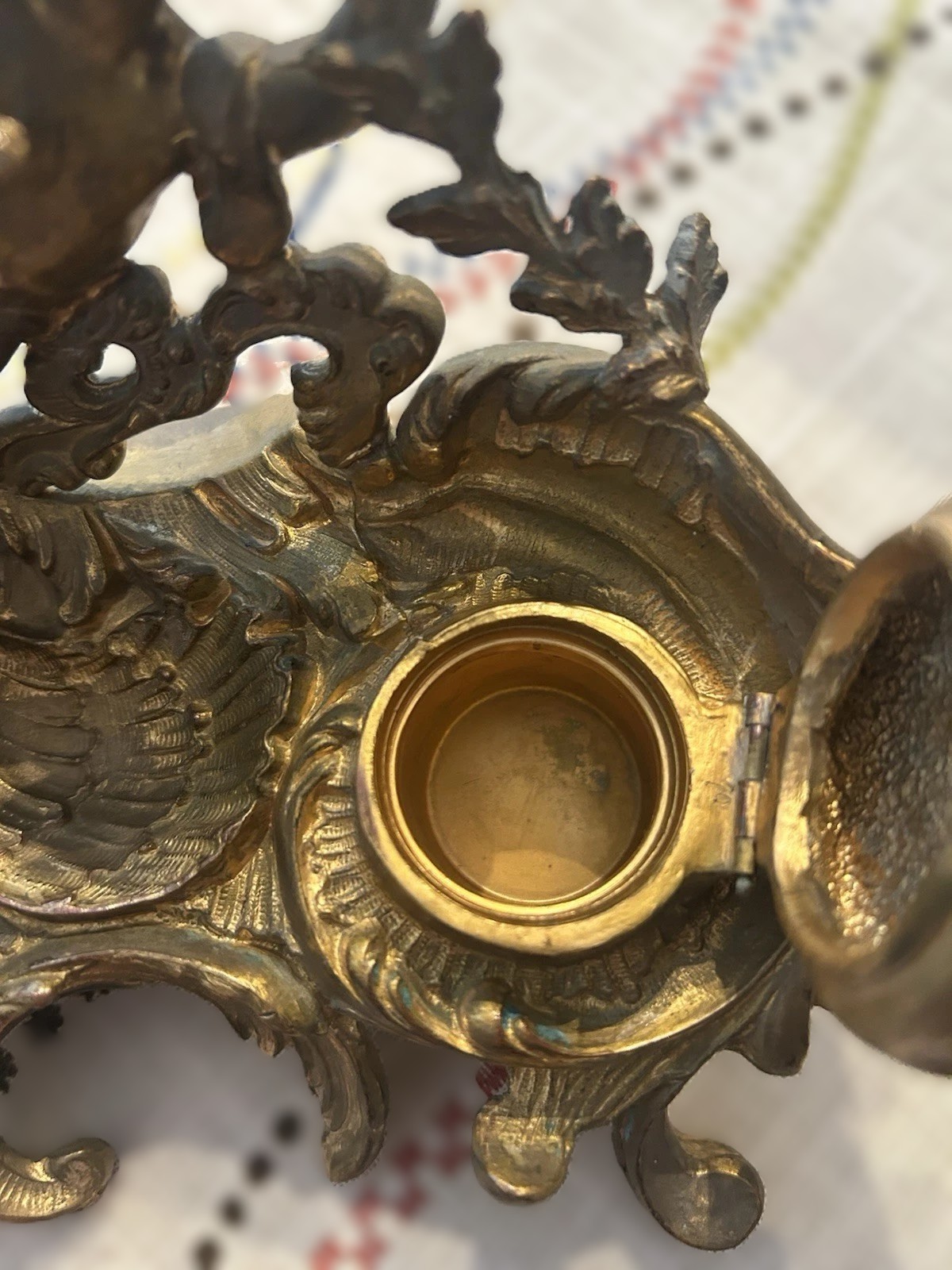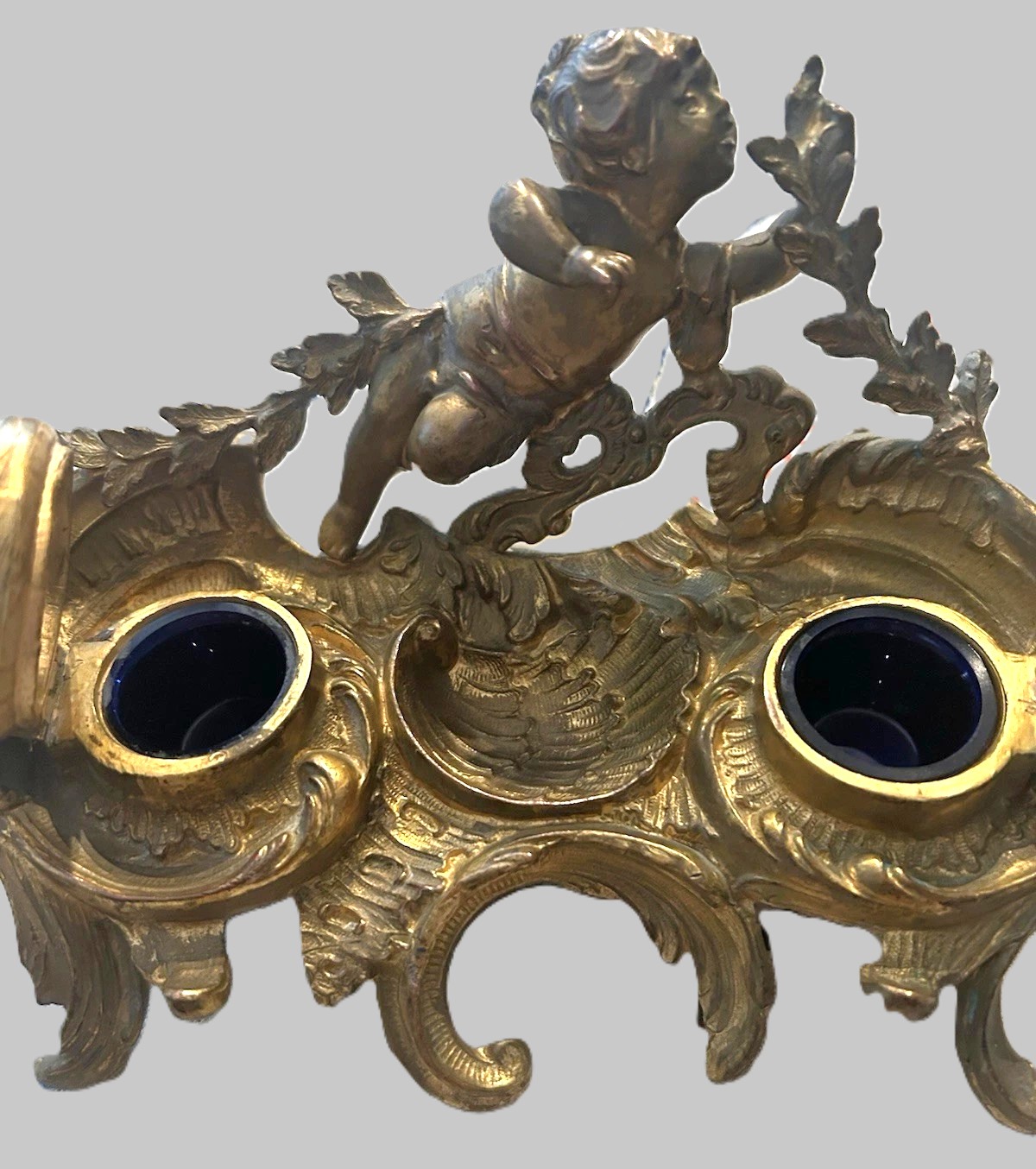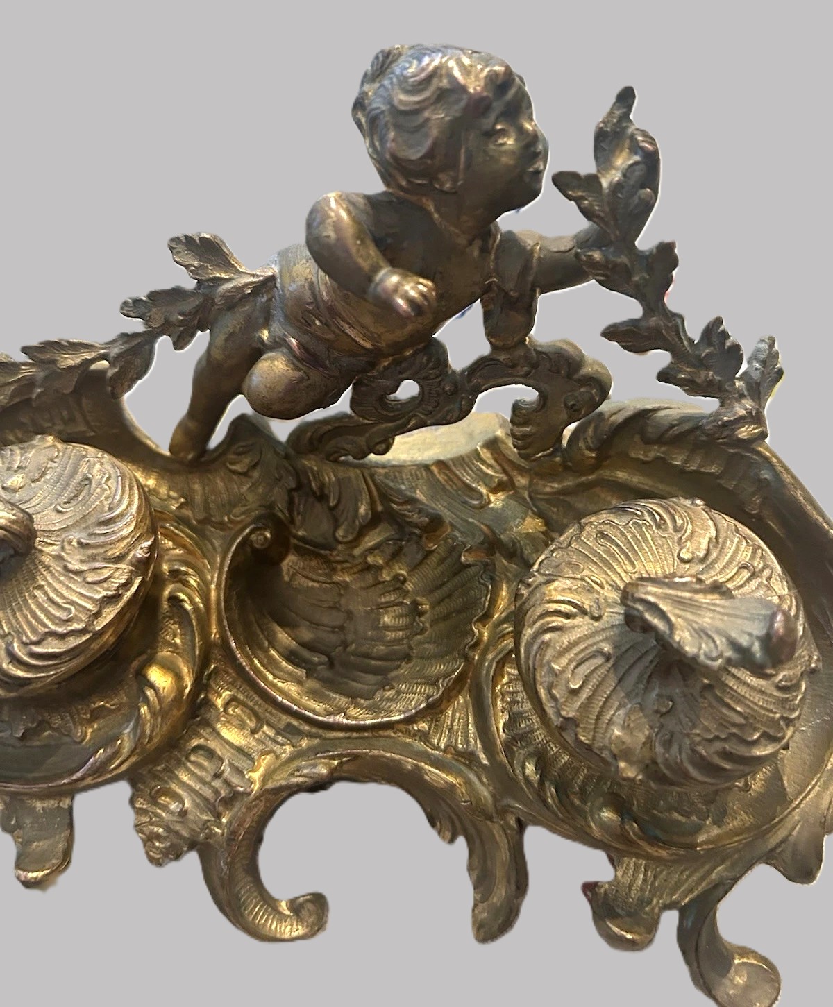 - The Cherub Figure: Positioned centrally between the two inkwells is a cast metal cherub (or putto). The figure is depicted in a playful or symbolic pose, such as holding a garland.