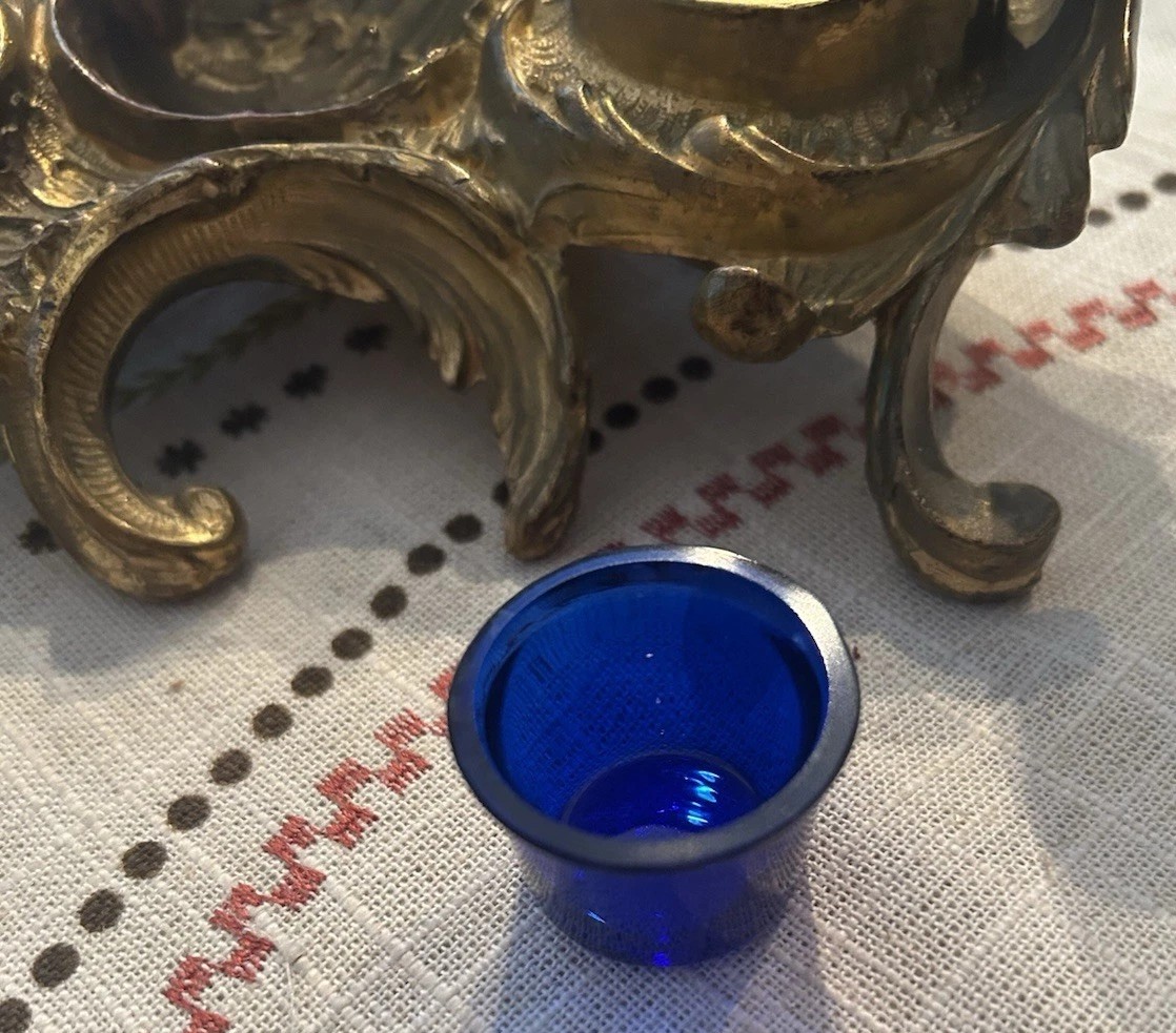 - Where it was made: This style of inkstand, combining gilded metal with cobalt glass and figurative sculpture, was a specialty of French Parisian workshops. France led the market for these luxury “standishes” throughout the 19th century.