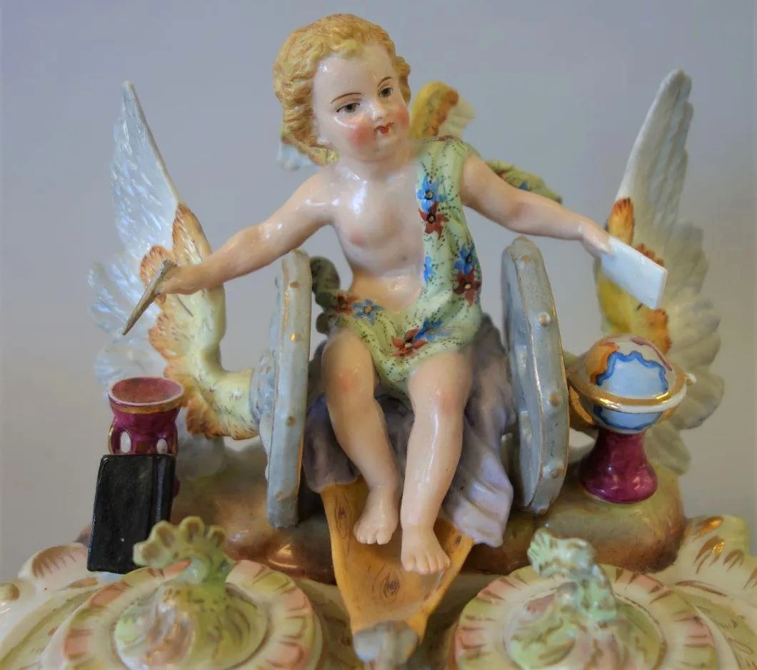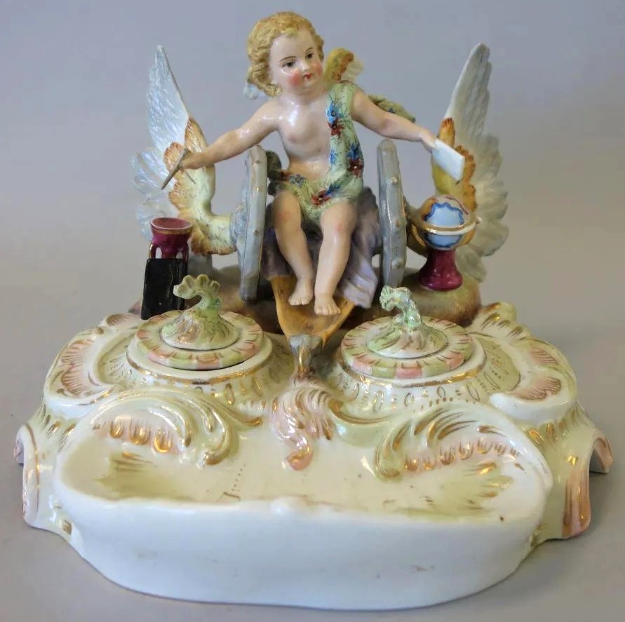 This porcelain inkstand with two inkwells features a winged cherub / putto resting on a winged chariot, a world globe on one side and a chalice with a book on the other side. The underside has an unidentified maker’s mark in underglaze blue.