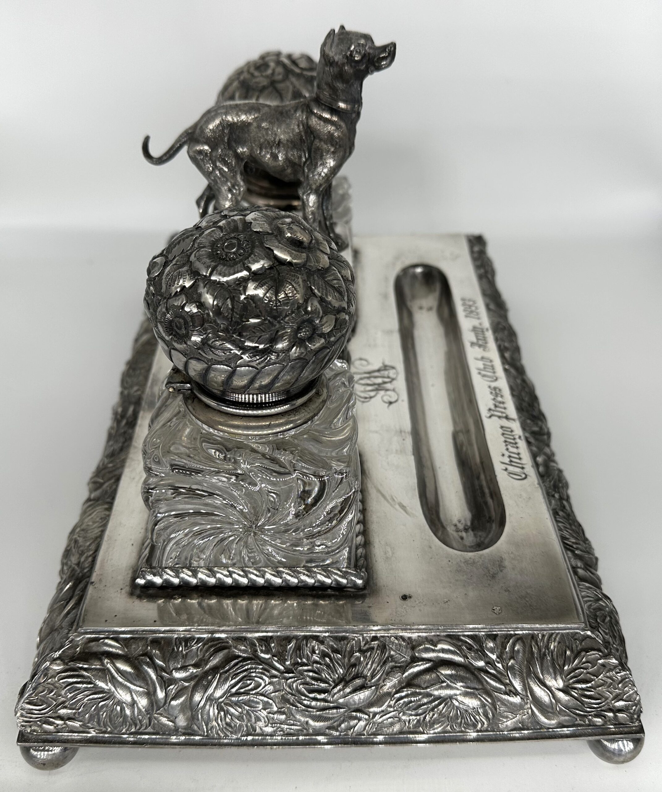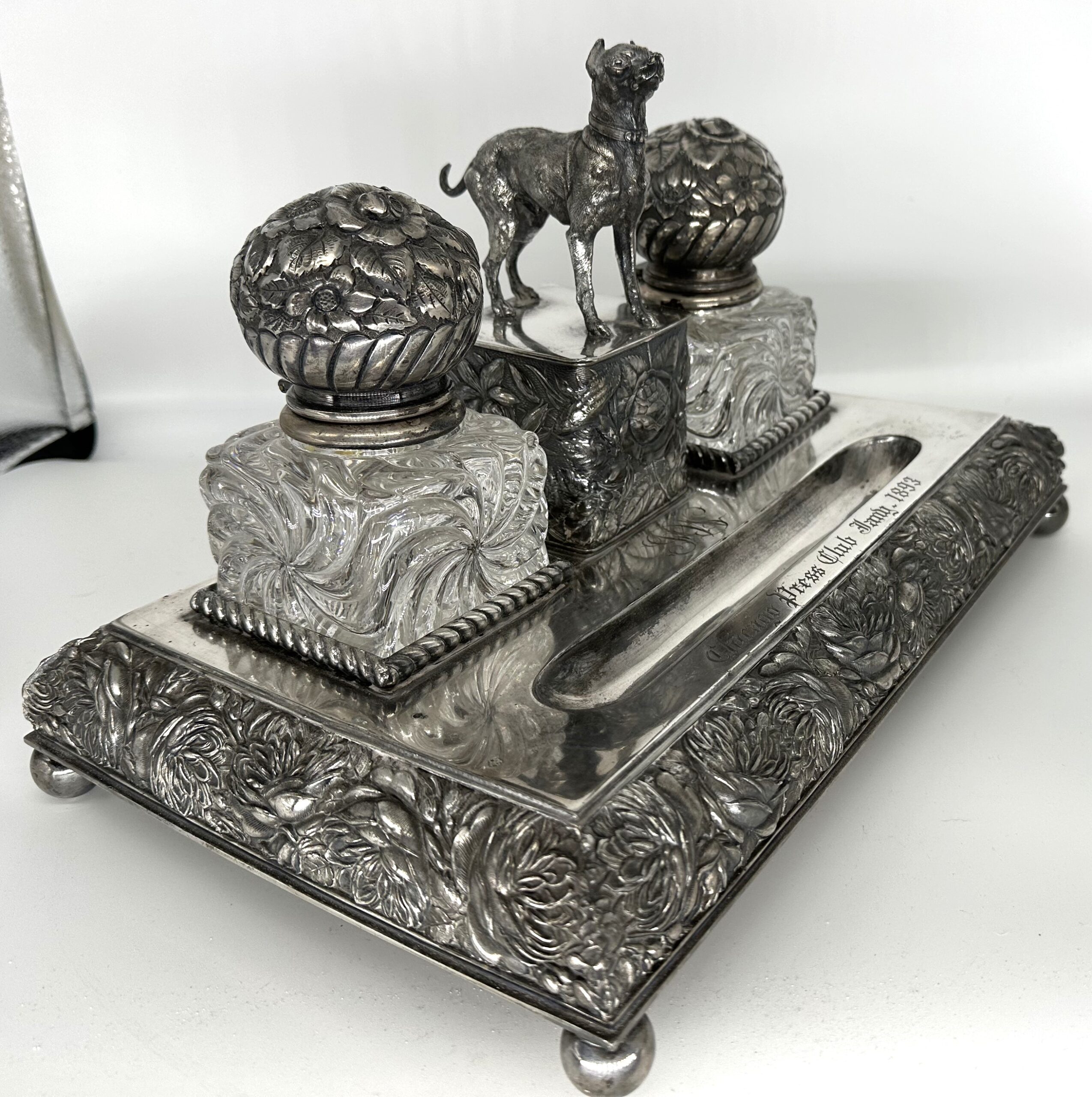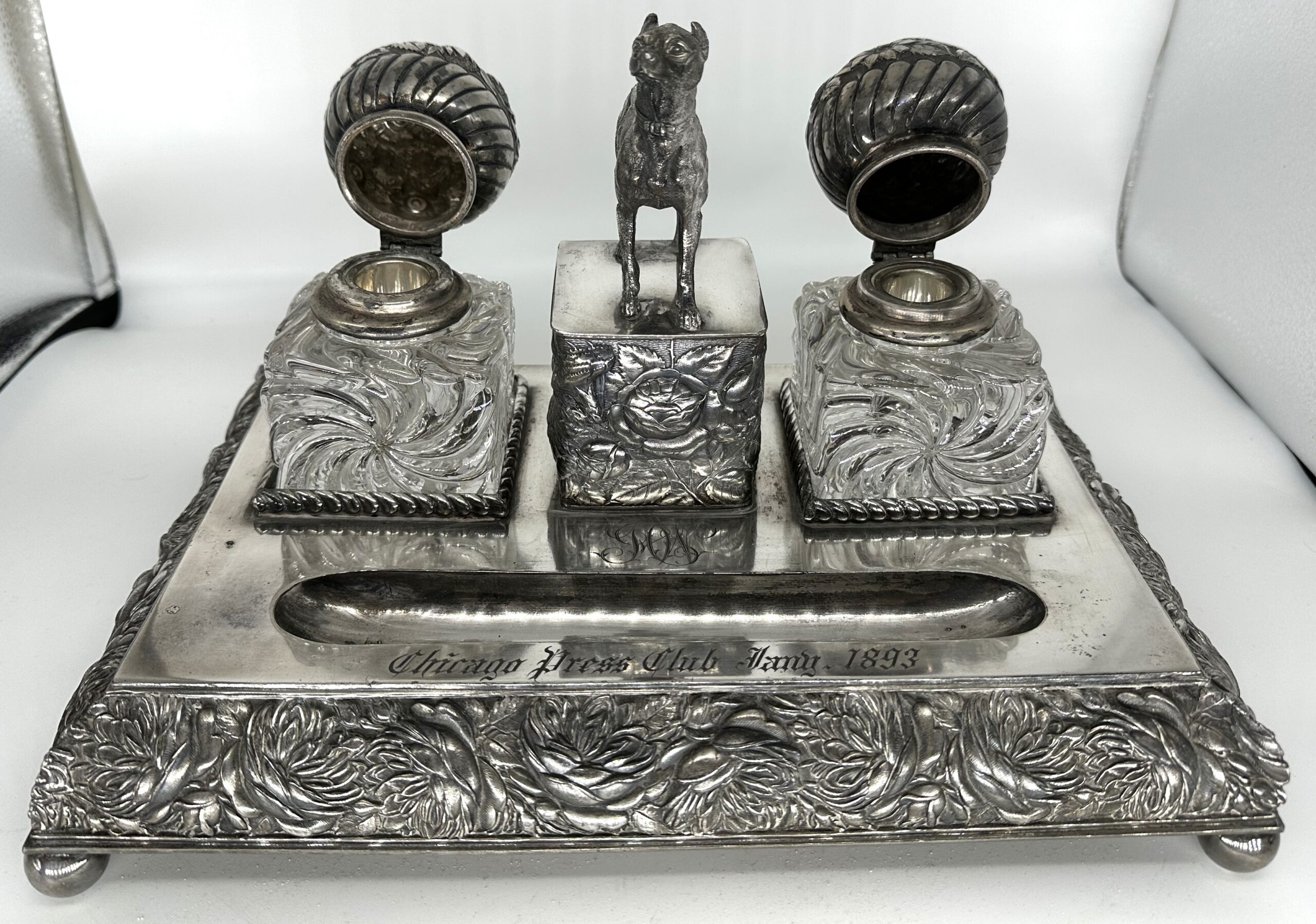 1893 Chicago Press Club historical memorabilia likely presented to Mr. Charles H. Wacker. A rare and handsome (possibly one-of-a-kind) presentation double inkwell (standish) featuring two fancy heavy crystal glass containers with detailed globe lids plus a center compartment and lid with a proud canine mounted on top. Ornate and detailed metal work throughout is silver plated.