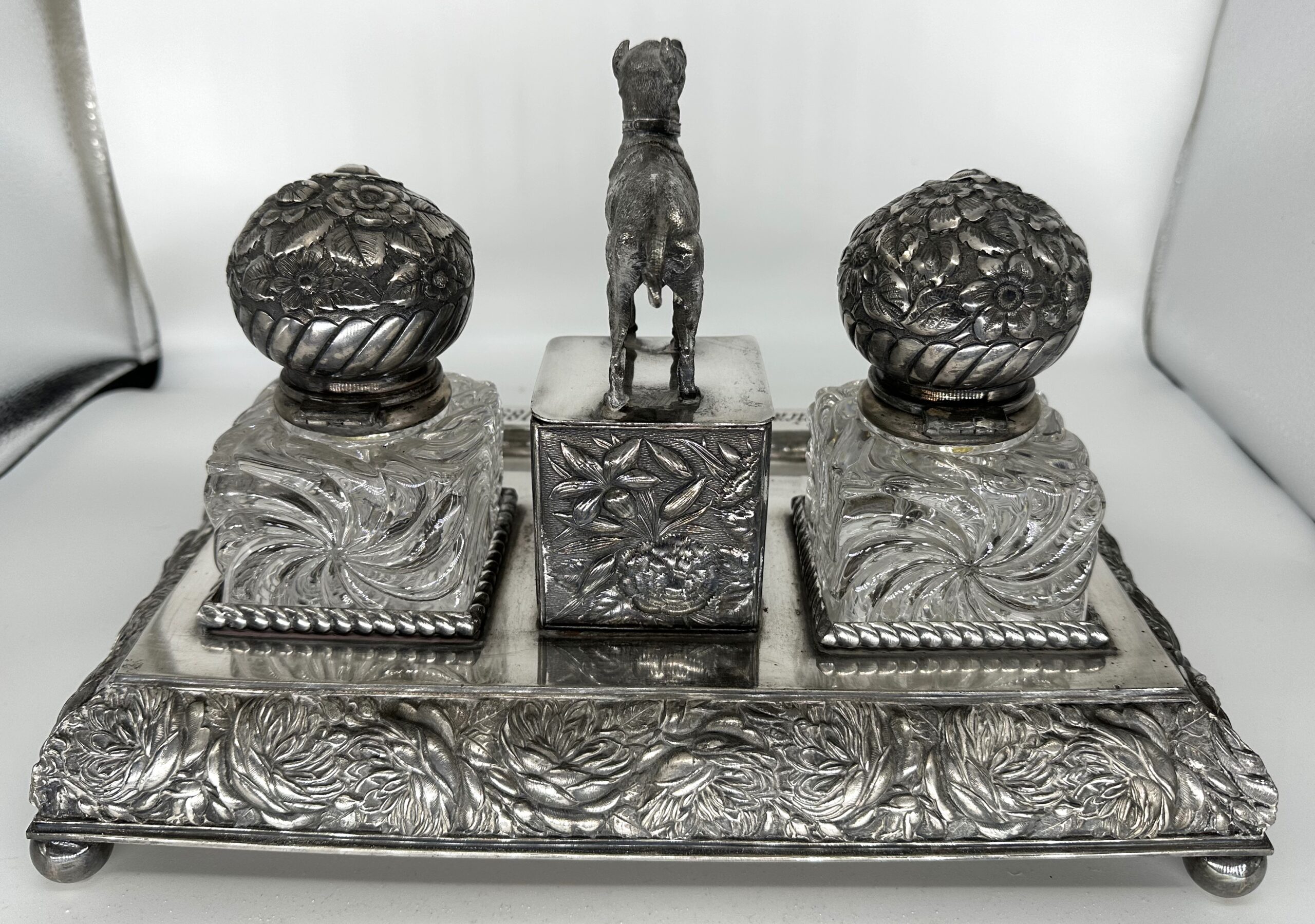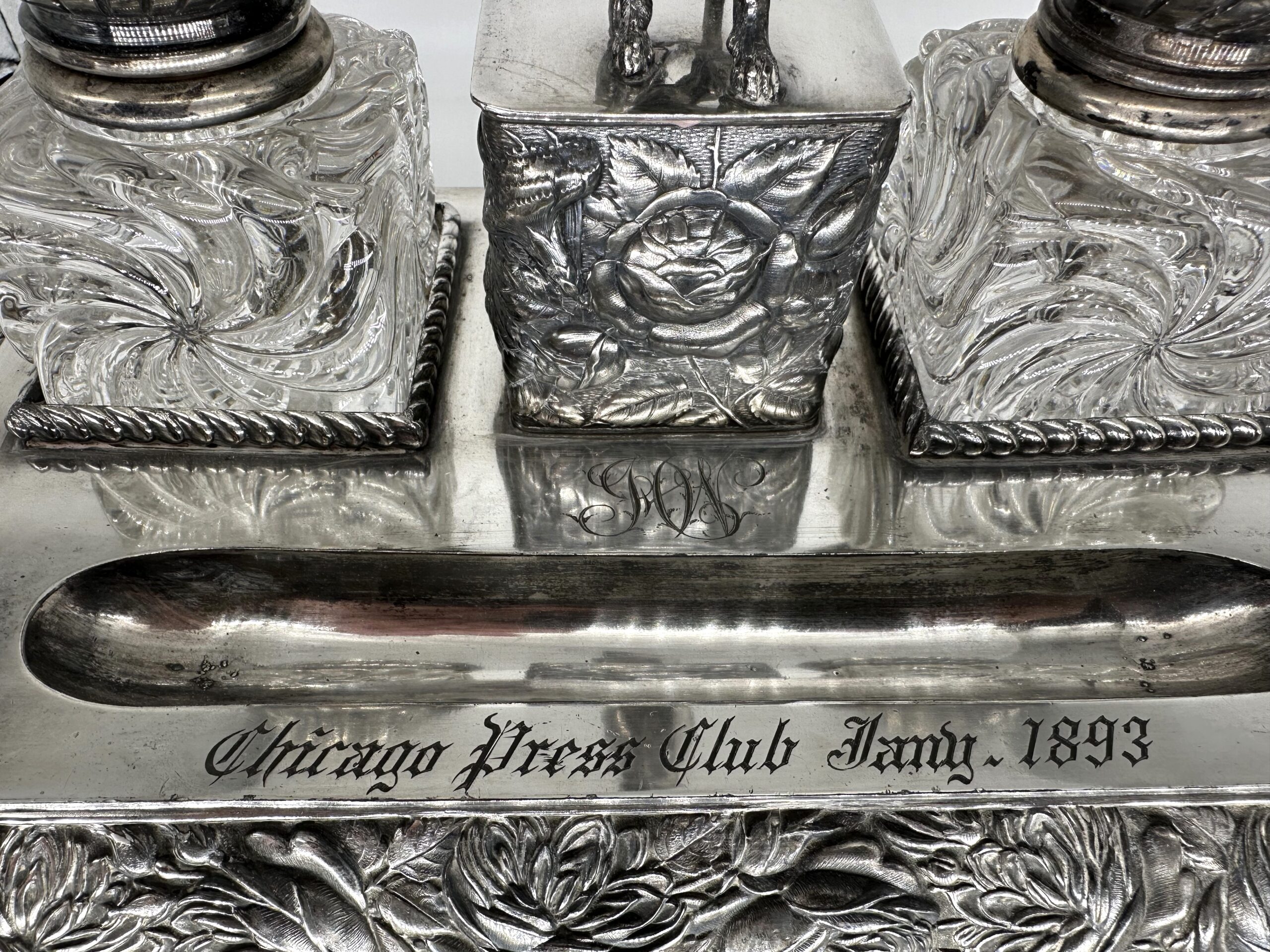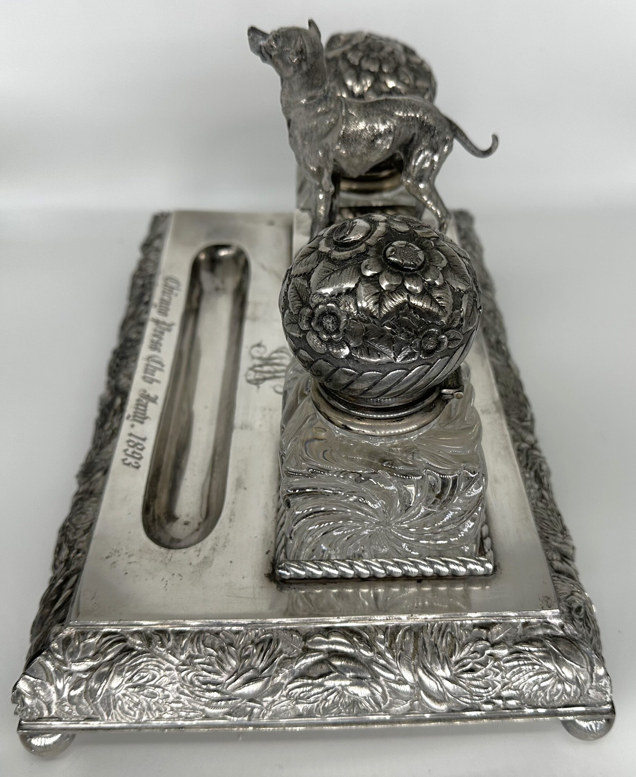 1893 Chicago Press Club historical memorabilia likely presented to Mr. Charles H. Wacker. A rare and handsome (possibly one-of-a-kind) presentation double inkwell (standish) featuring two fancy heavy crystal glass containers with detailed globe lids plus a center compartment and lid with a proud canine mounted on top. Ornate and detailed metal work throughout is silver plated.