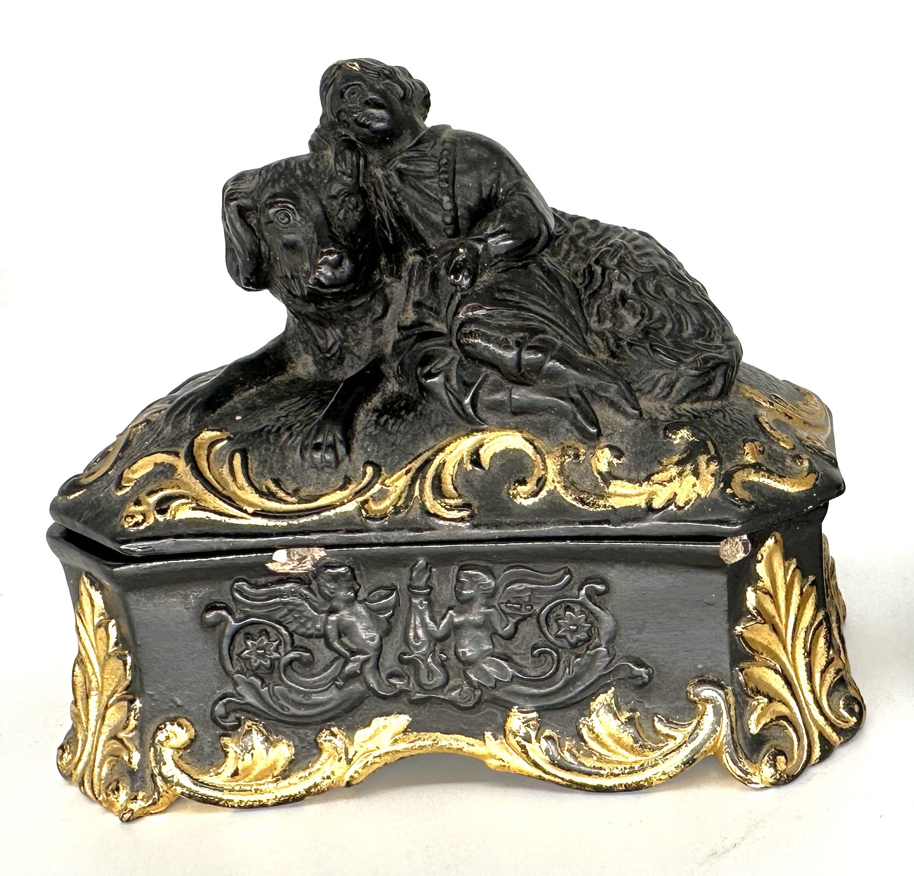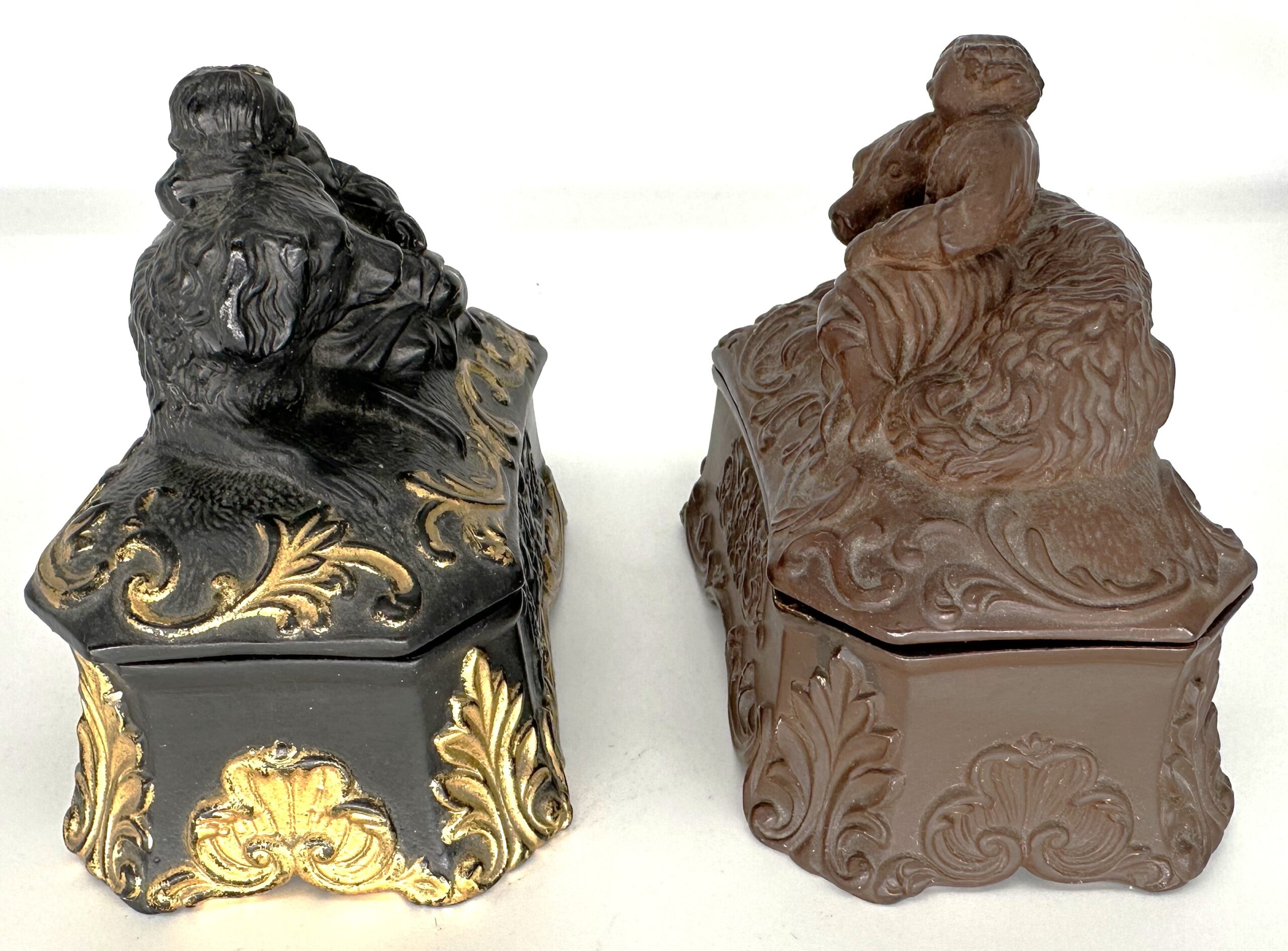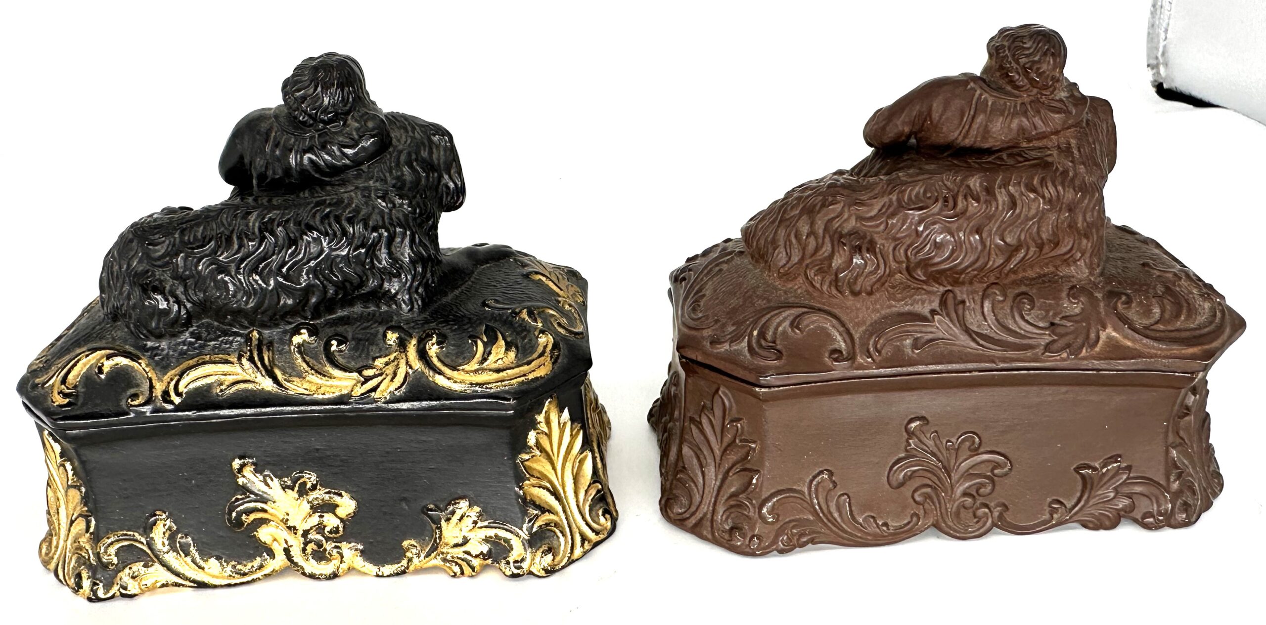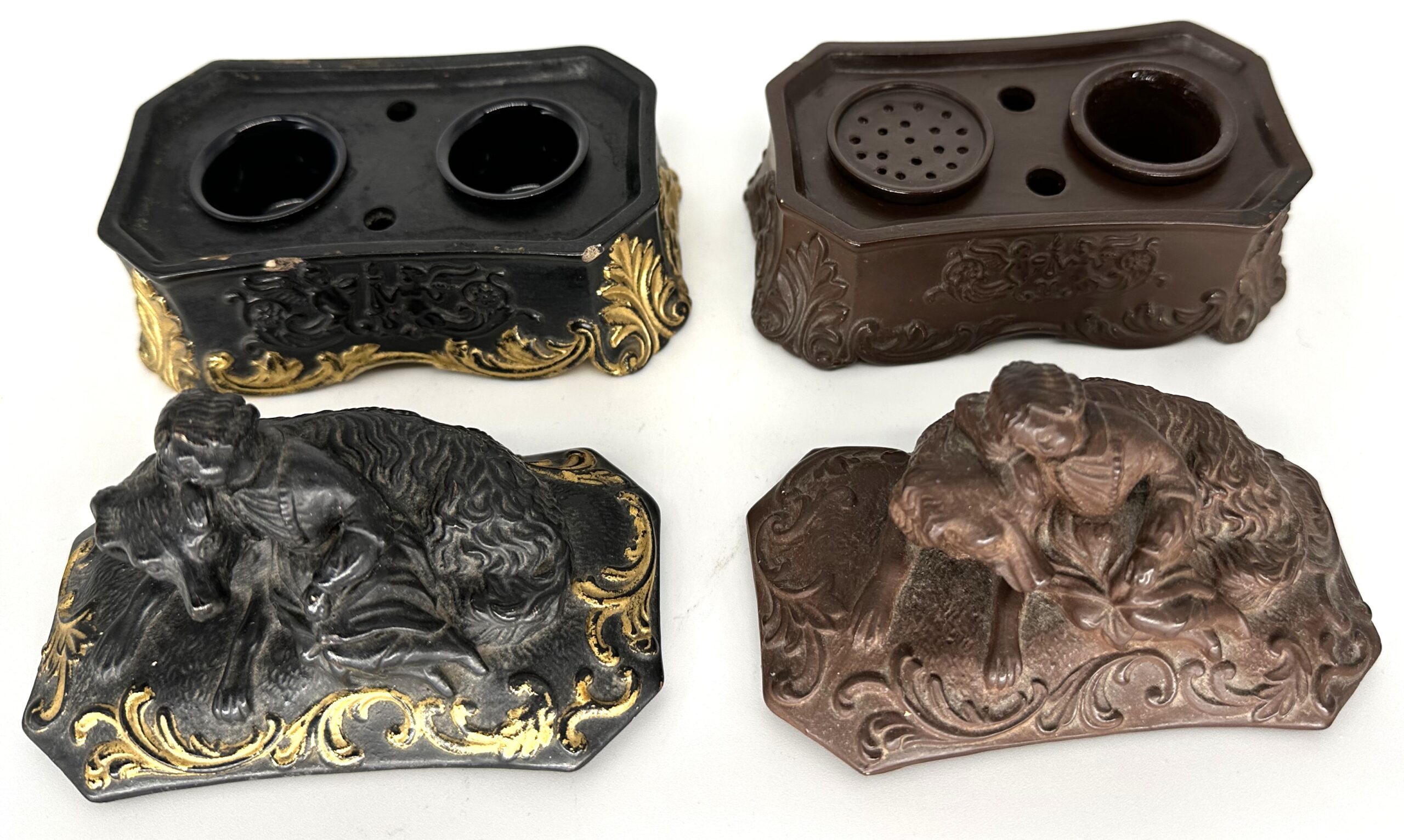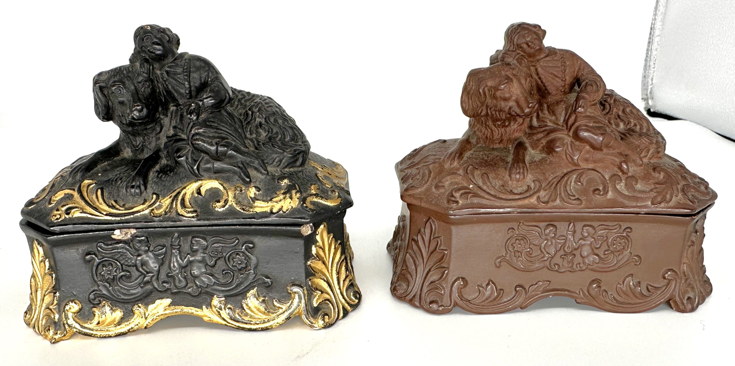 Child resting on a dog – two versions. Both are made of pottery, depict the same scene, and have the same decoration. The black with gold trim contains two inkwells. The earthen brown piece has an inkwell and a sander.