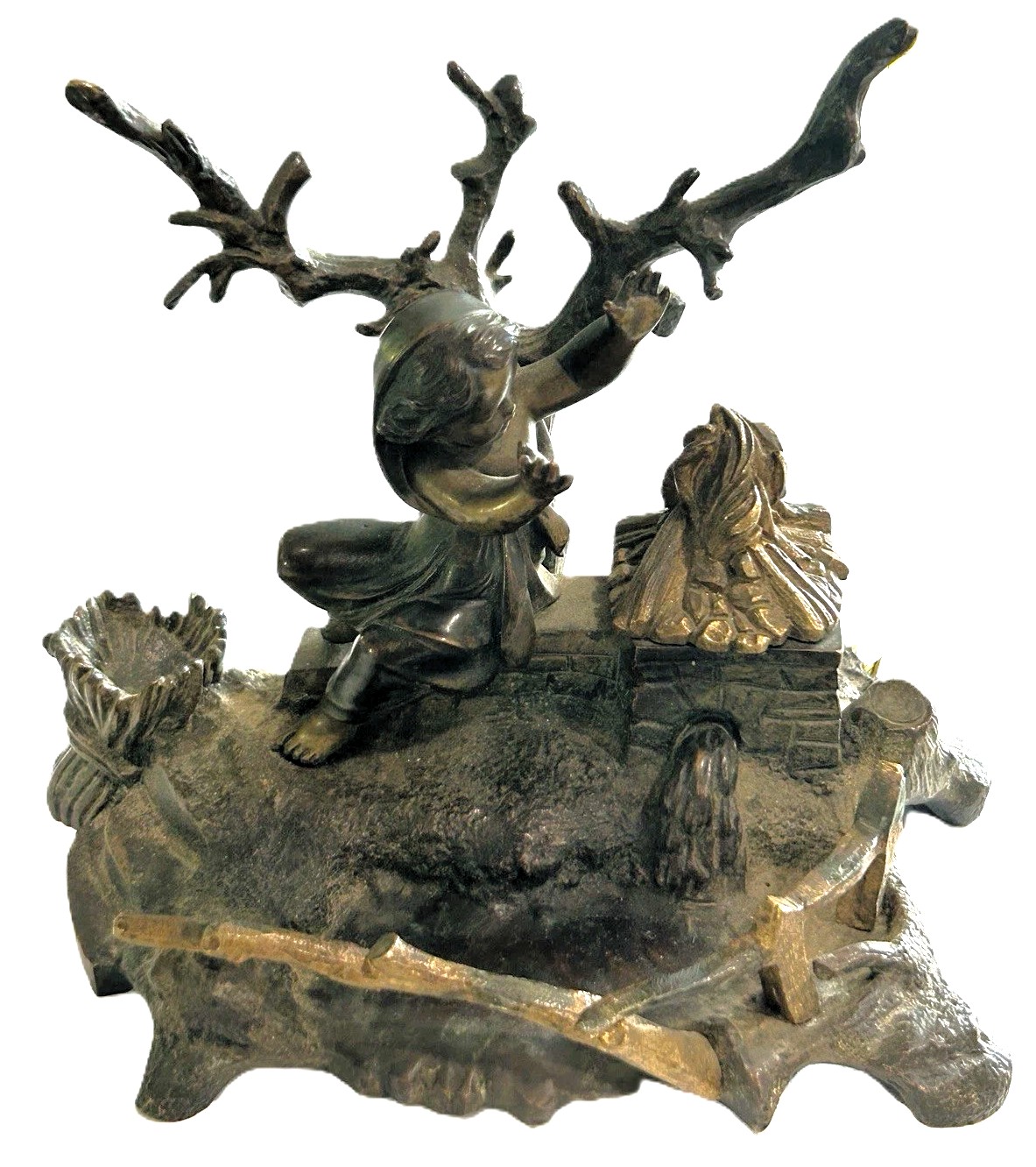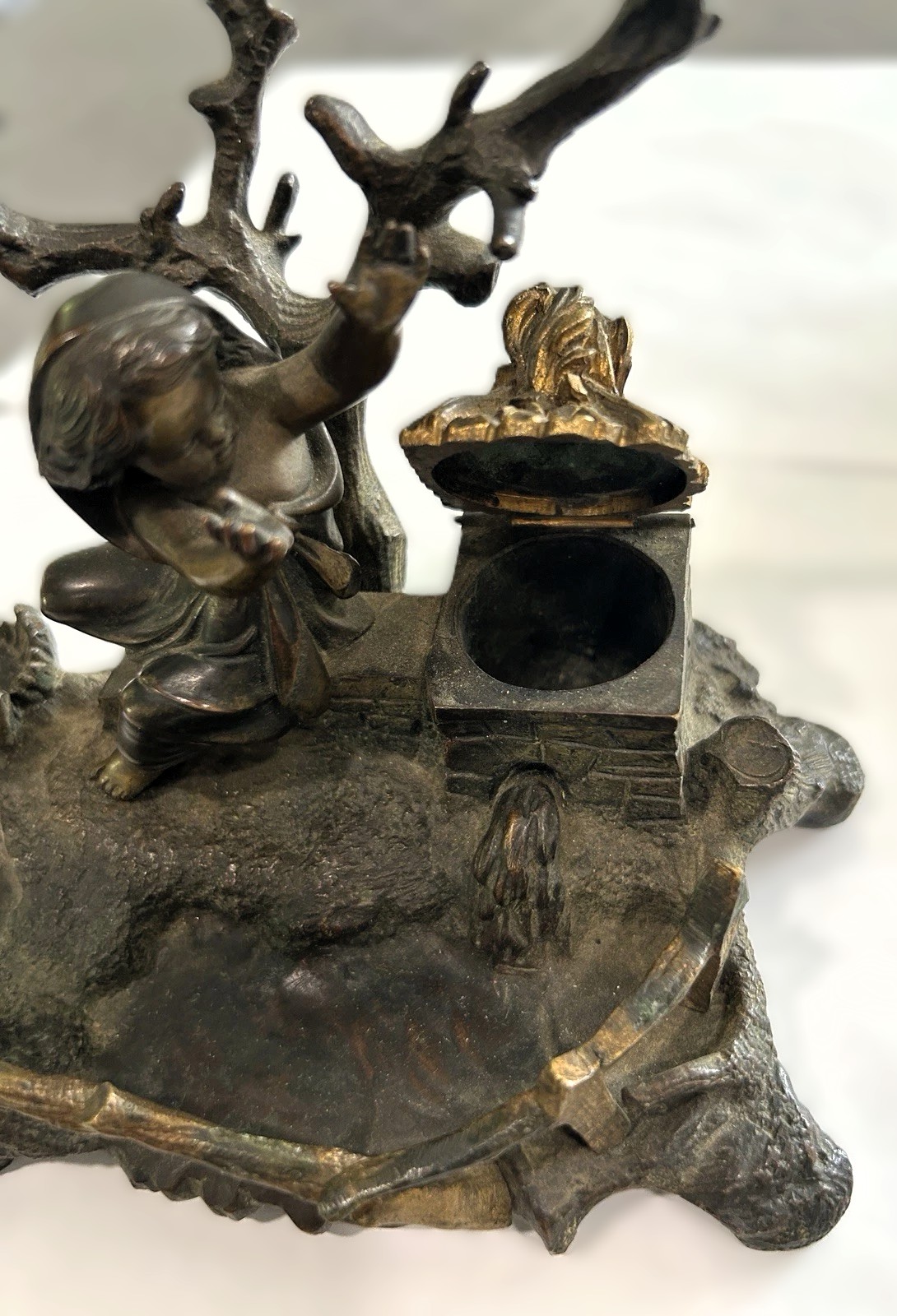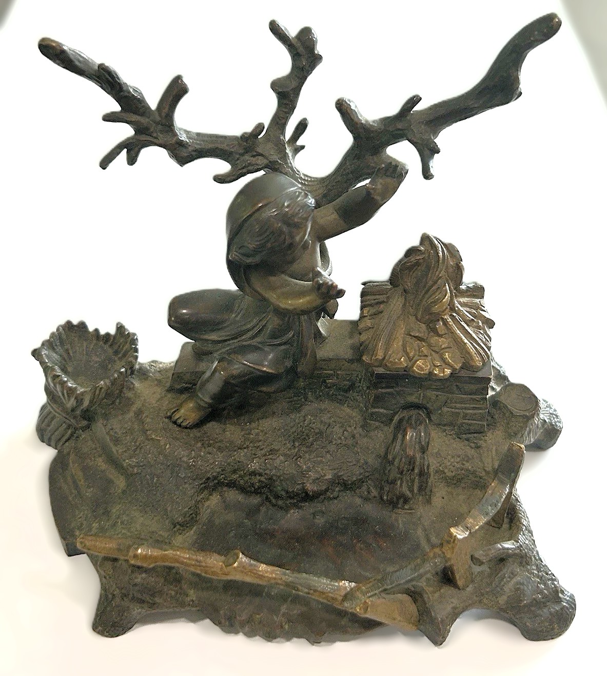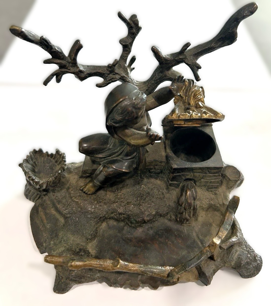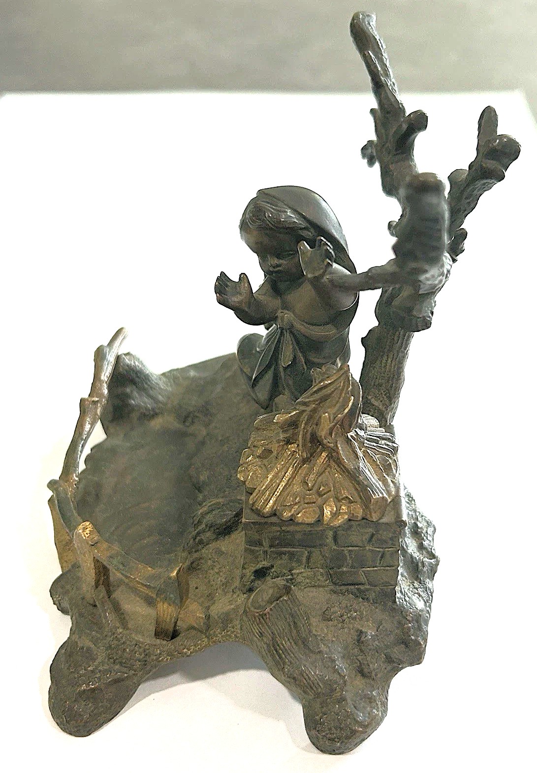 This figural inkstand, made of spelter with a bronze finish, presents a narrative scene in a rustic setting. A child, wearing a simple tunic-like garment in bare feet, enjoys the warmth of a fire – hands raised and held out.