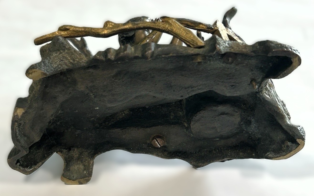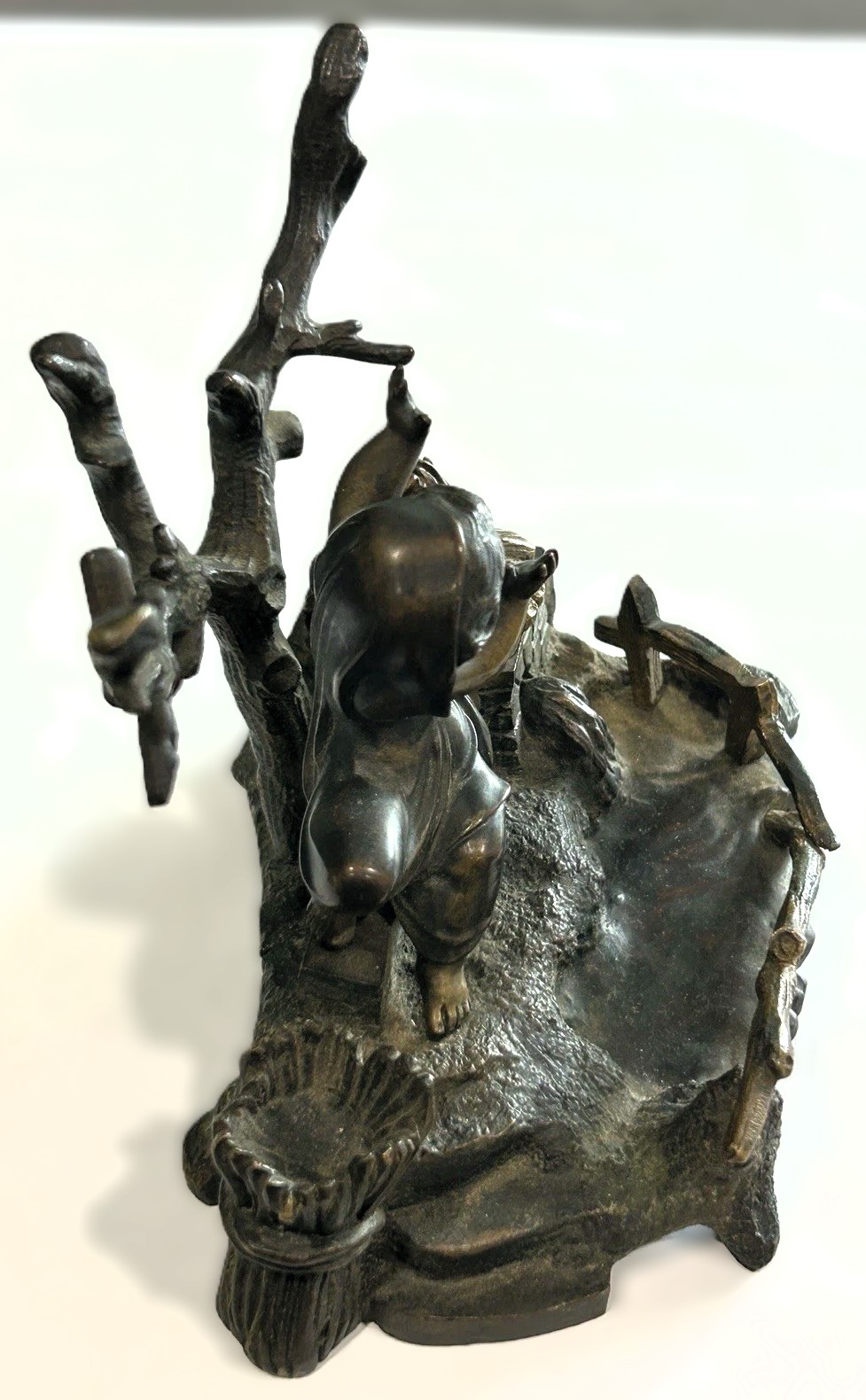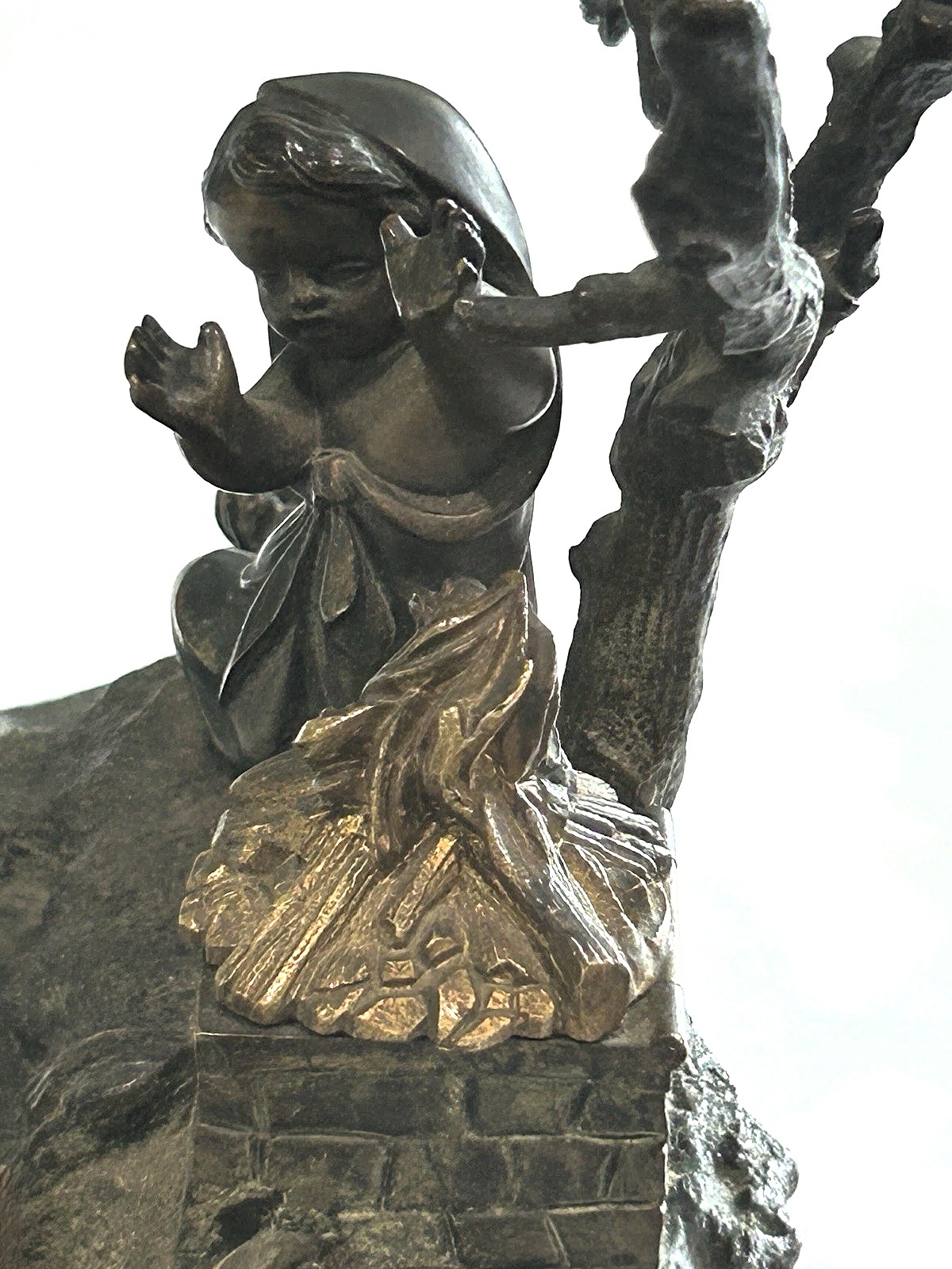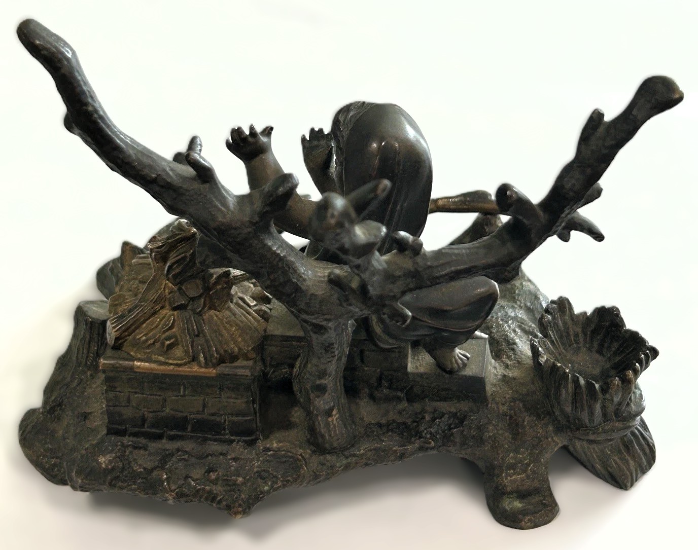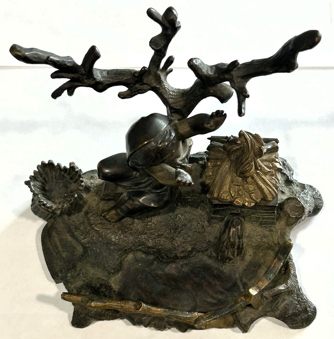 This figural inkstand, made of spelter with a bronze finish, presents a narrative scene in a rustic setting. A child, wearing a simple tunic-like garment in bare feet, enjoys the warmth of a fire – hands raised and held out.