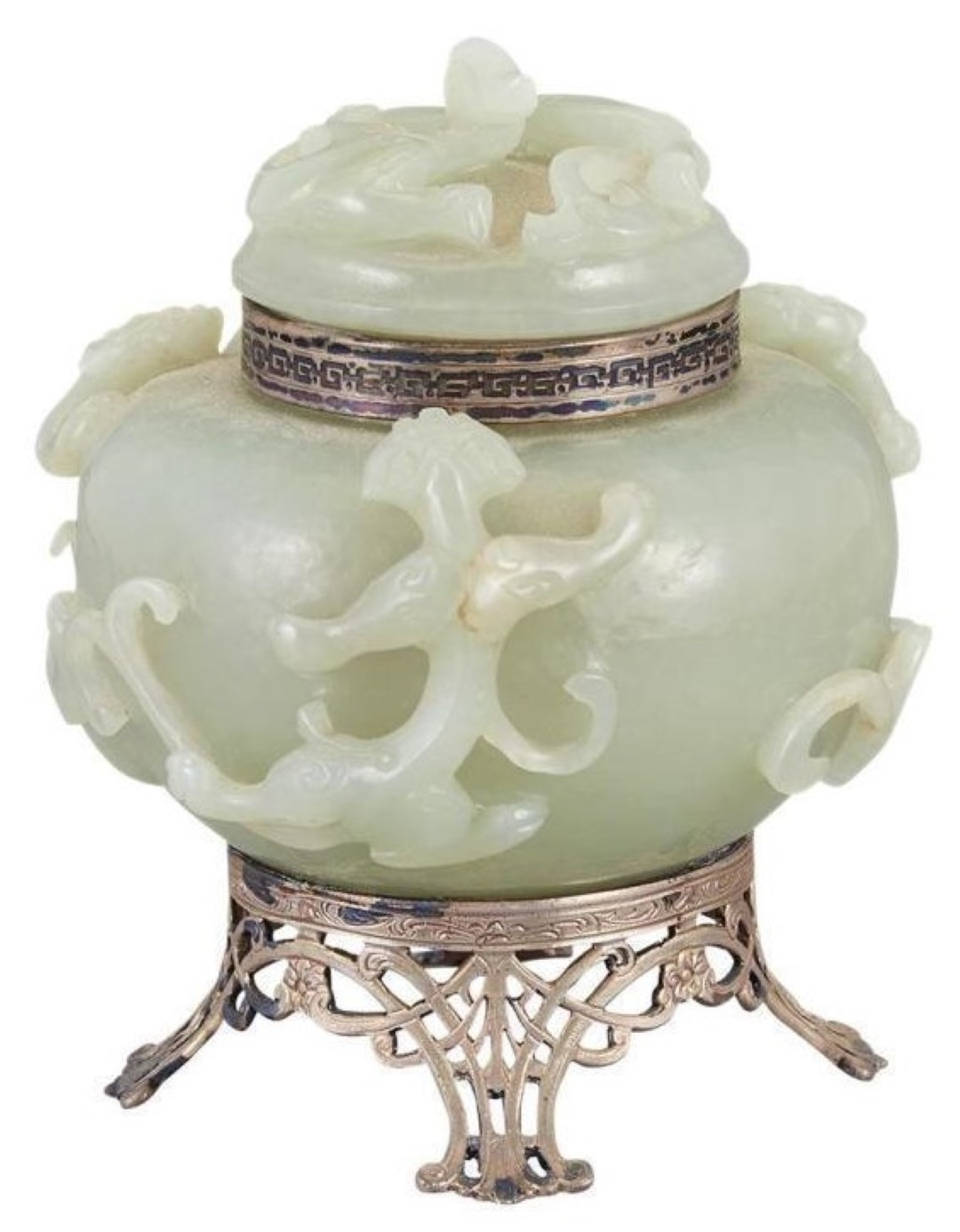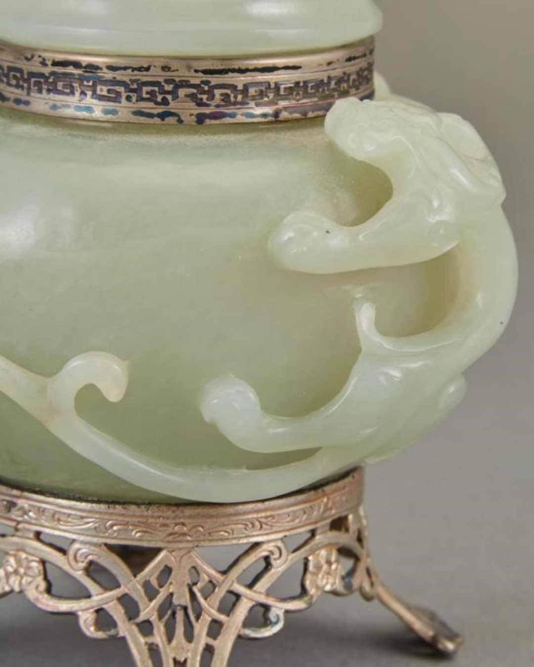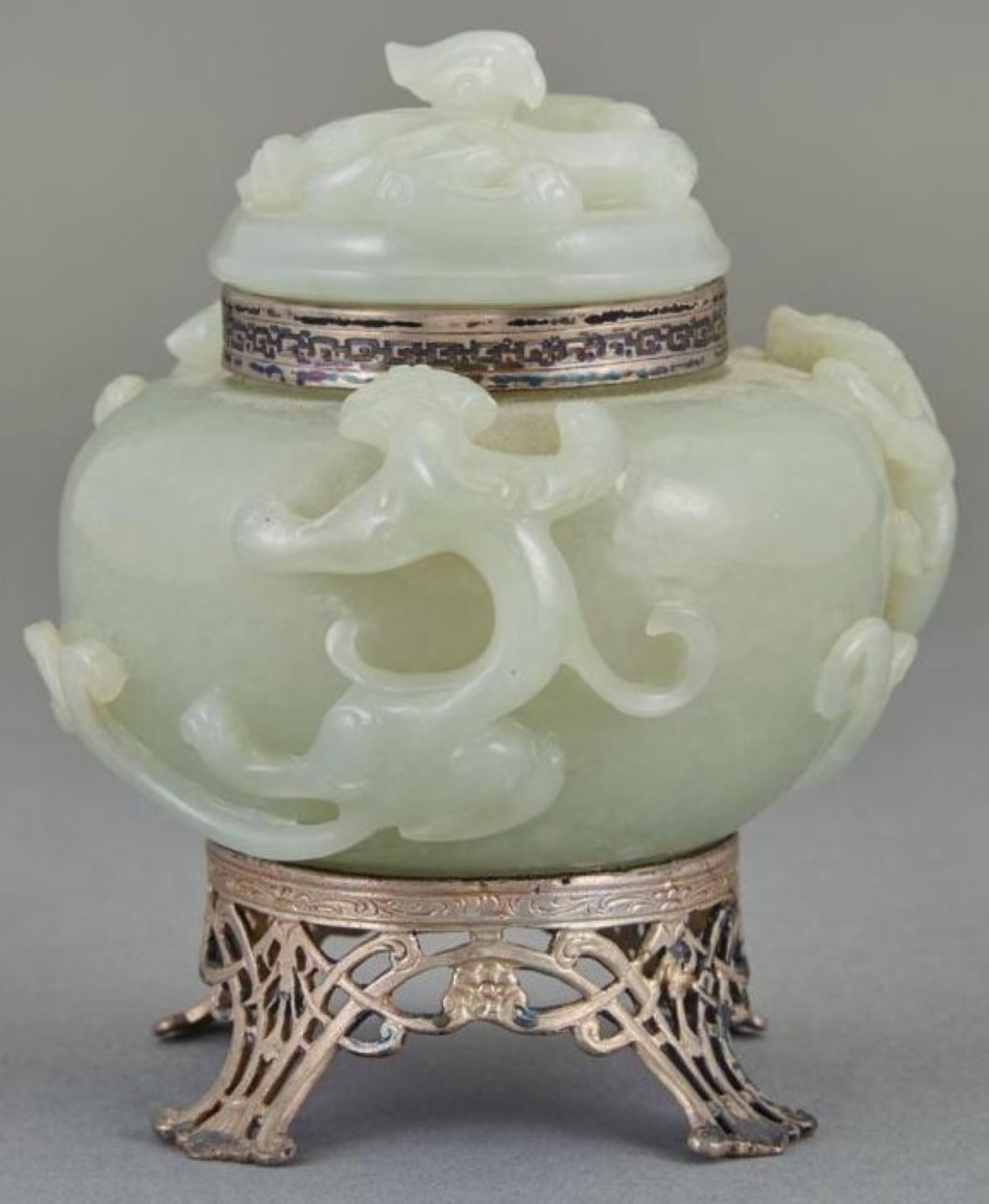 This celadon jade inkwell is mounted on a reticulated silver stand that is stamped “Edward I. Farmer / New York / Sterling. The silver base is screwed in through the base of the jade. The body of the inkwell is carved in relief with three sinuous chilong dragons. The fitted lid is surmounted with a writhing dragon.