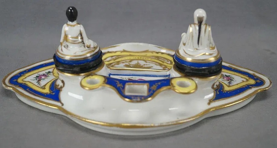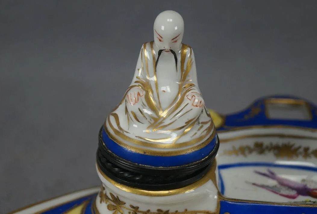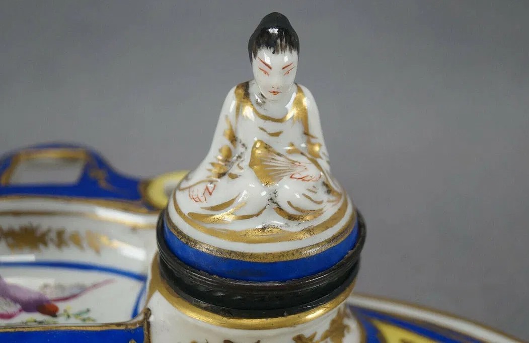 This inkstand, an example of the European taste Chinoiserie decorative arts, is made of high-quality porcelain and is meticulously hand-painted with a vibrant color palette of cobalt blue and yellow, accented with raised gold scrollwork. The painted scenes depict delicate flowers and birds, which are consistent with the “oriental” style popular in Europe at the time. The raised gold scrollwork is highly ornate, featuring a quiver and arrows, a common mythological symbol often associated with Cupid, which was also a popular motif on decorative items from this period. The two inkwells are covered with elegant, hinged lids. The finials of these lids are finely modeled male and female figures in a traditional “Orientalist” or Chinese style. They are painted to represent a Chinese couple in traditional dress.