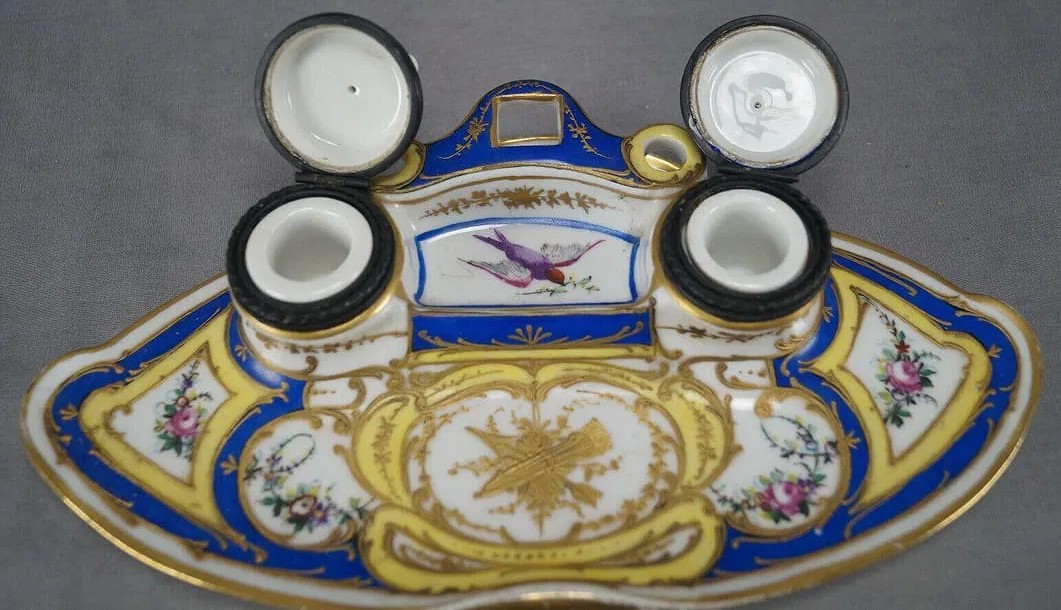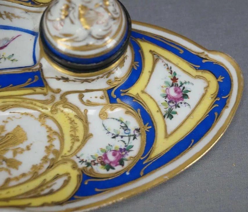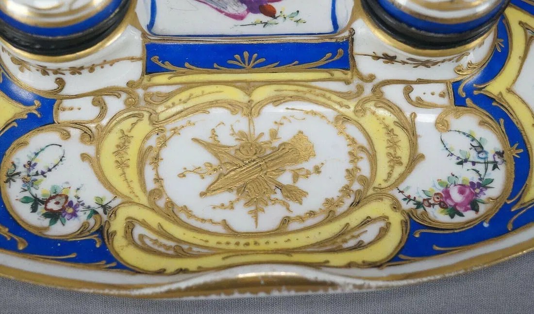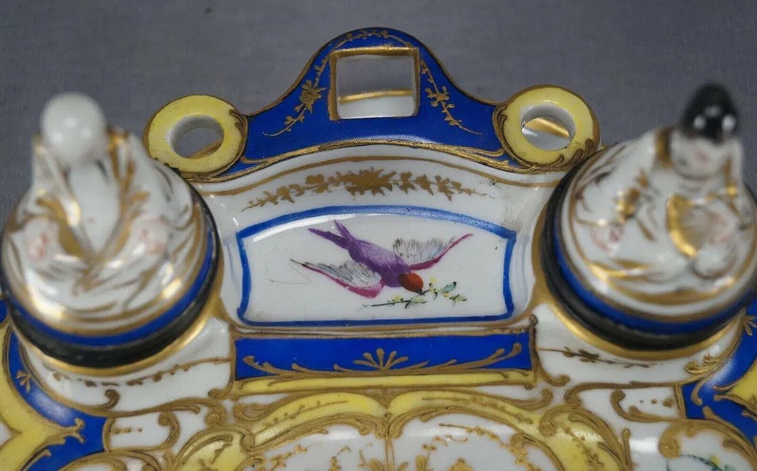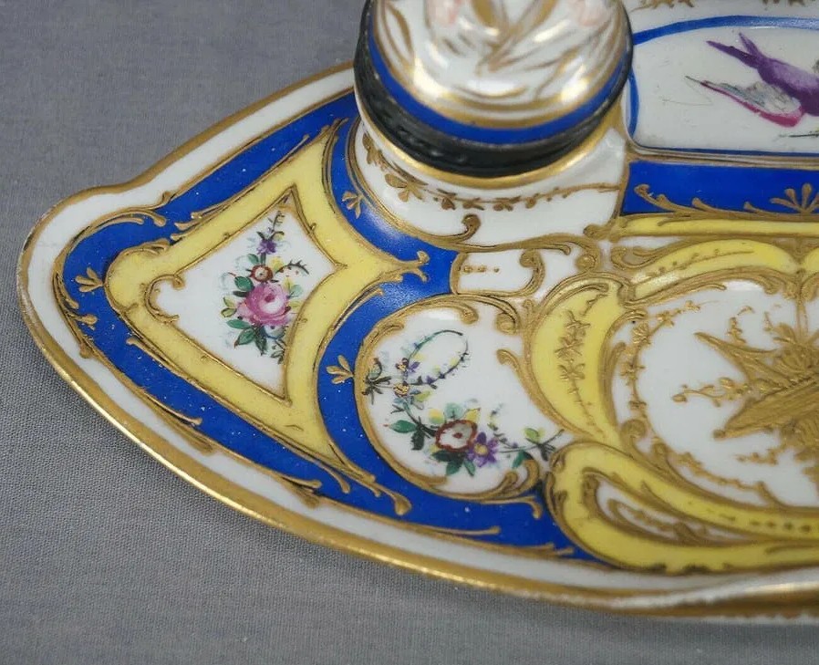 This inkstand was made in France during the late 19th century, a period of renewed interest in decorative arts from the 18th century. The style is often referred to as “Sèvres-style” or “Paris porcelain.” The Paris porcelain factories, in particular, created many pieces that emulated the high quality and intricate designs of the Sèvres factory, using similar marks and motifs. This piece’s use of a famous European mark alongside Chinese-inspired motifs is characteristic of the Chinoiserie style of the time. The attention to detail in the hand-painted birds and flowers and the raised gilding on this inkstand points to a high level of craftsmanship, even though it is not from the Sèvres manufactory itself.