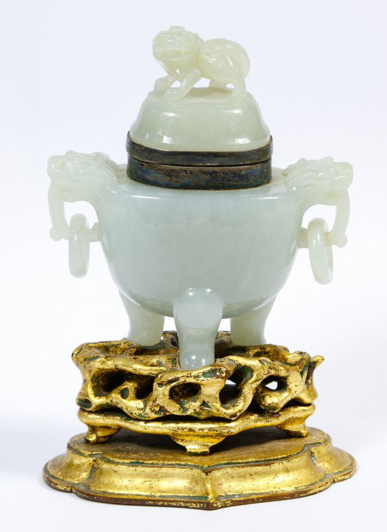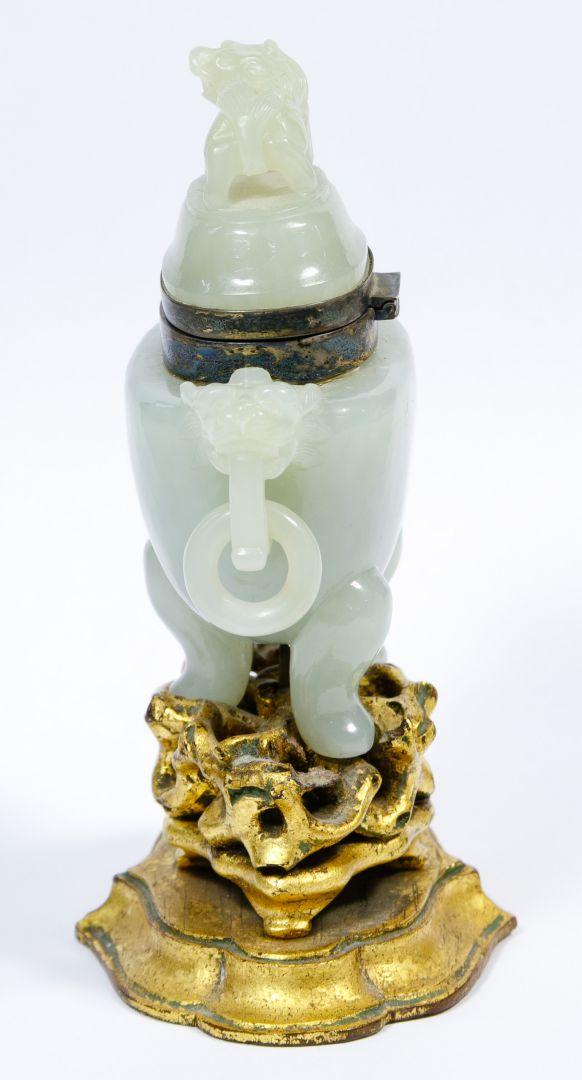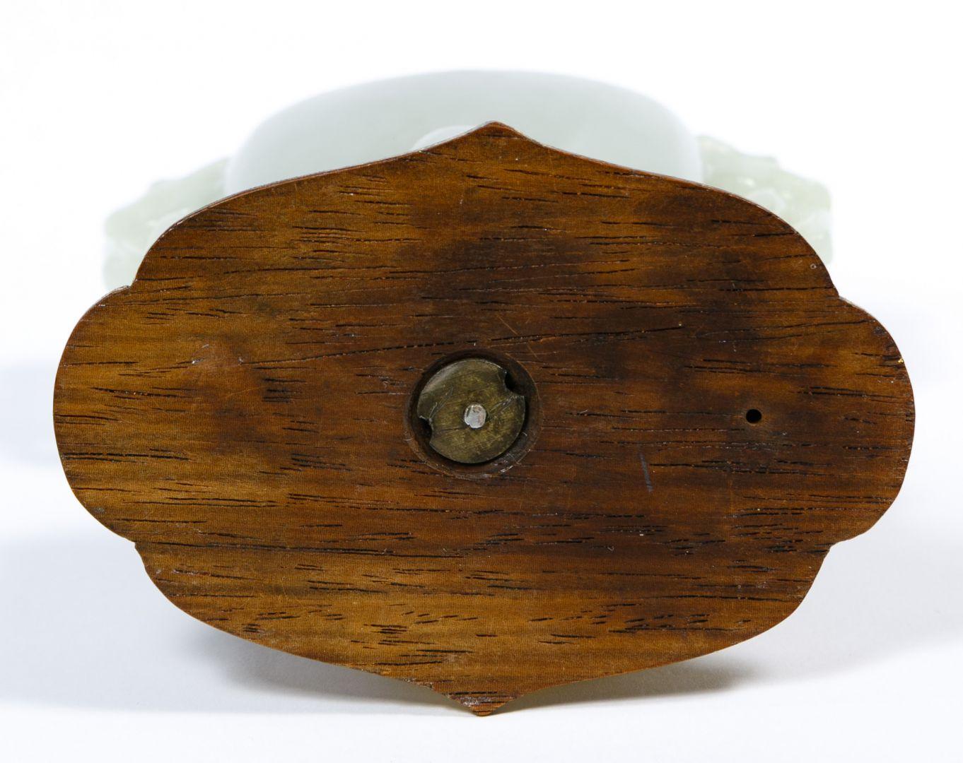 This jade inkwell with sterling silver fittings has a Foo dog on top and two Foo dog handles holding rings. It is mounted on a gold-colored wood base. Marked on the underside of the lid: Edward I. Farmer / N.Y. / Sterling.