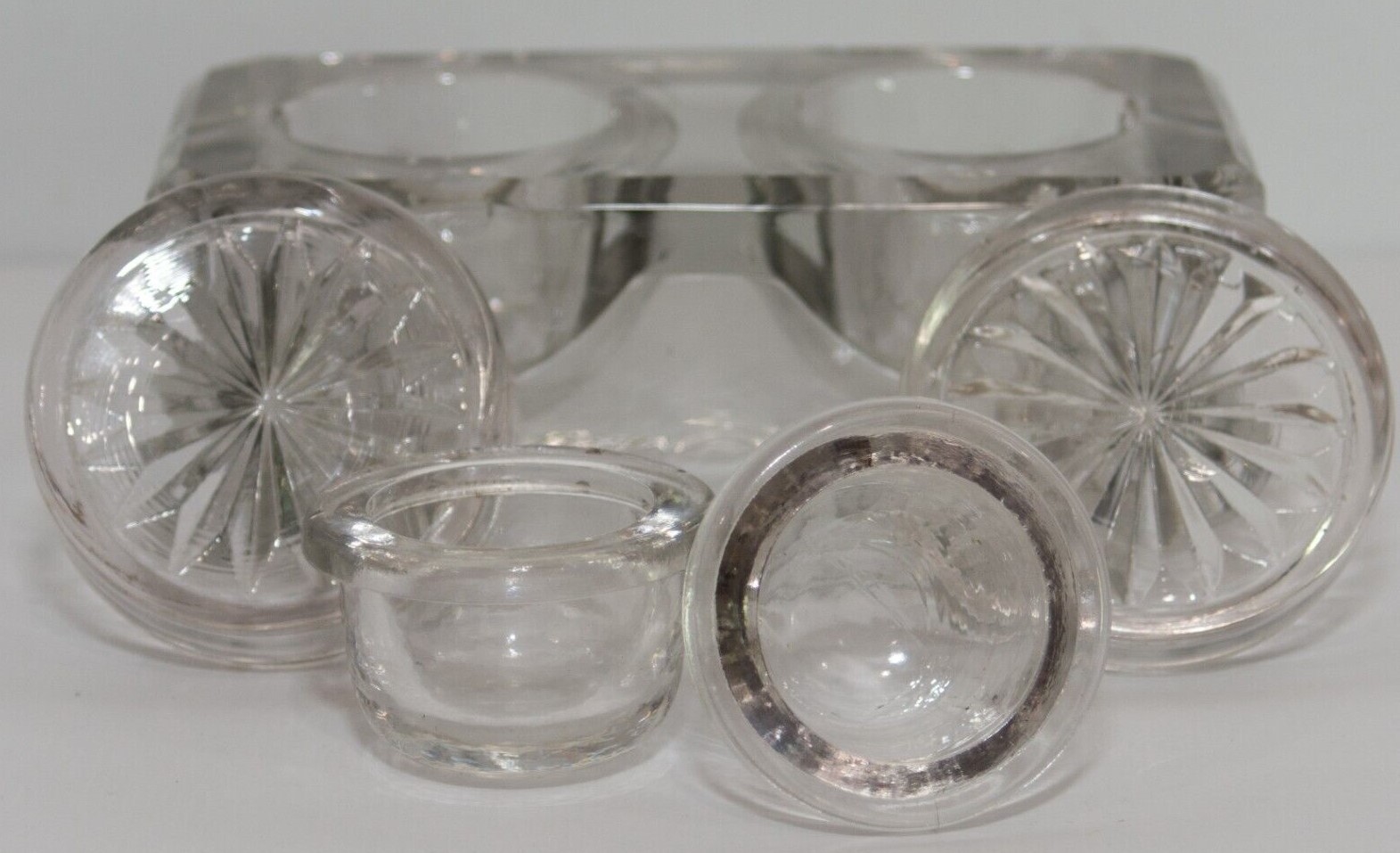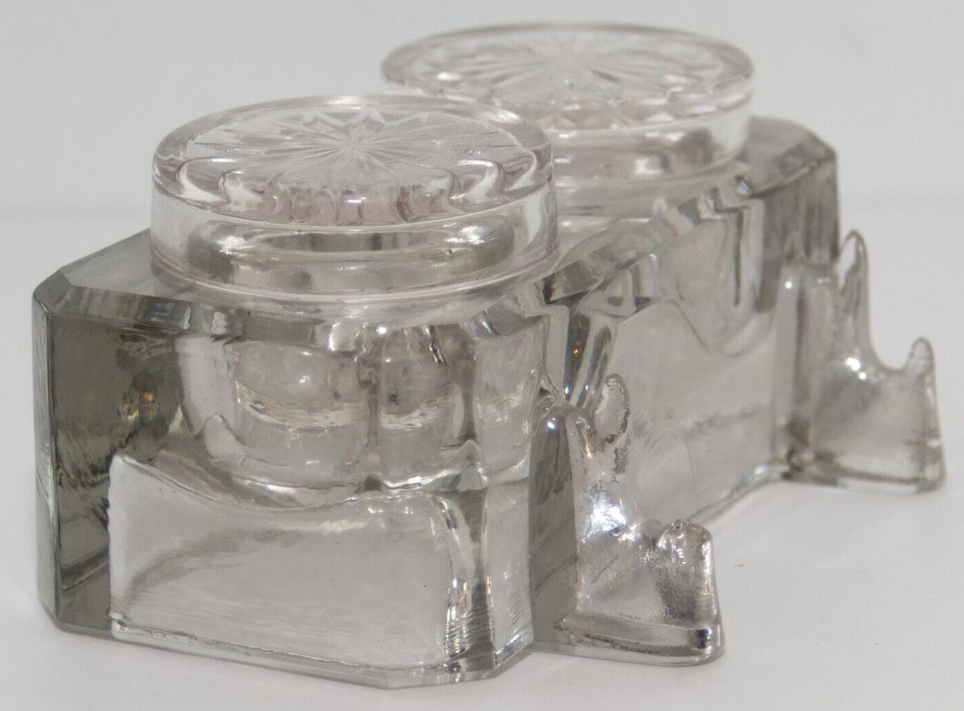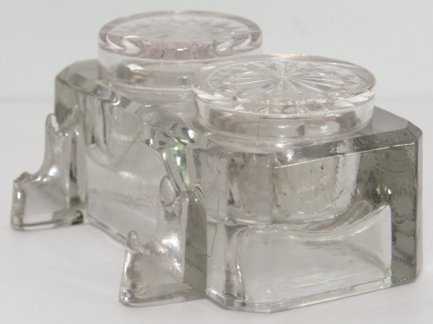A clear glass double inkstand with glass lids, inserts, and pen holder.