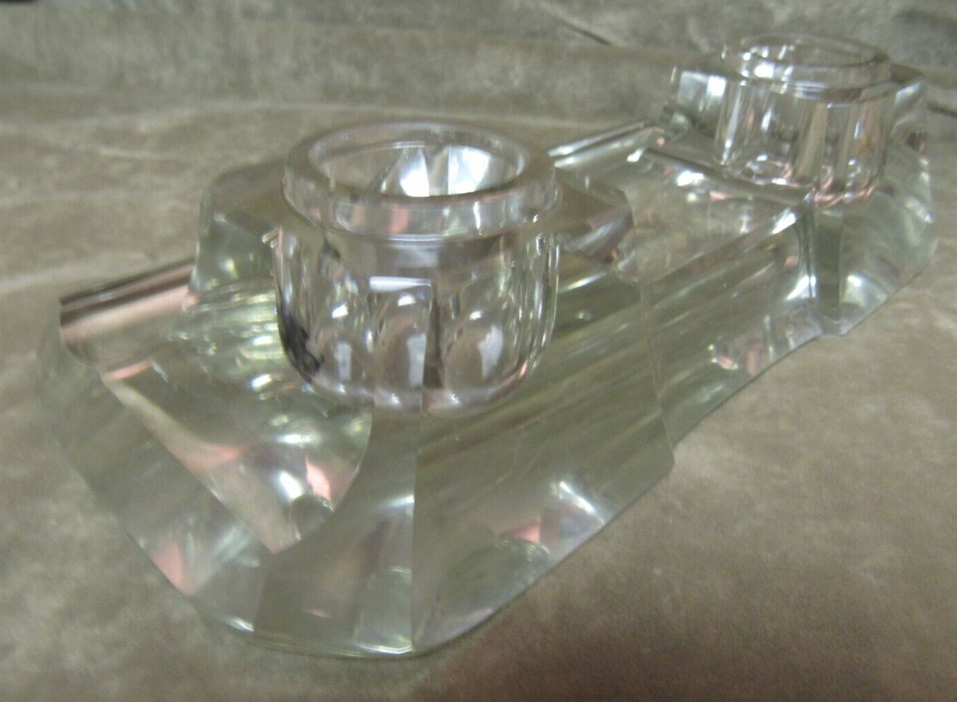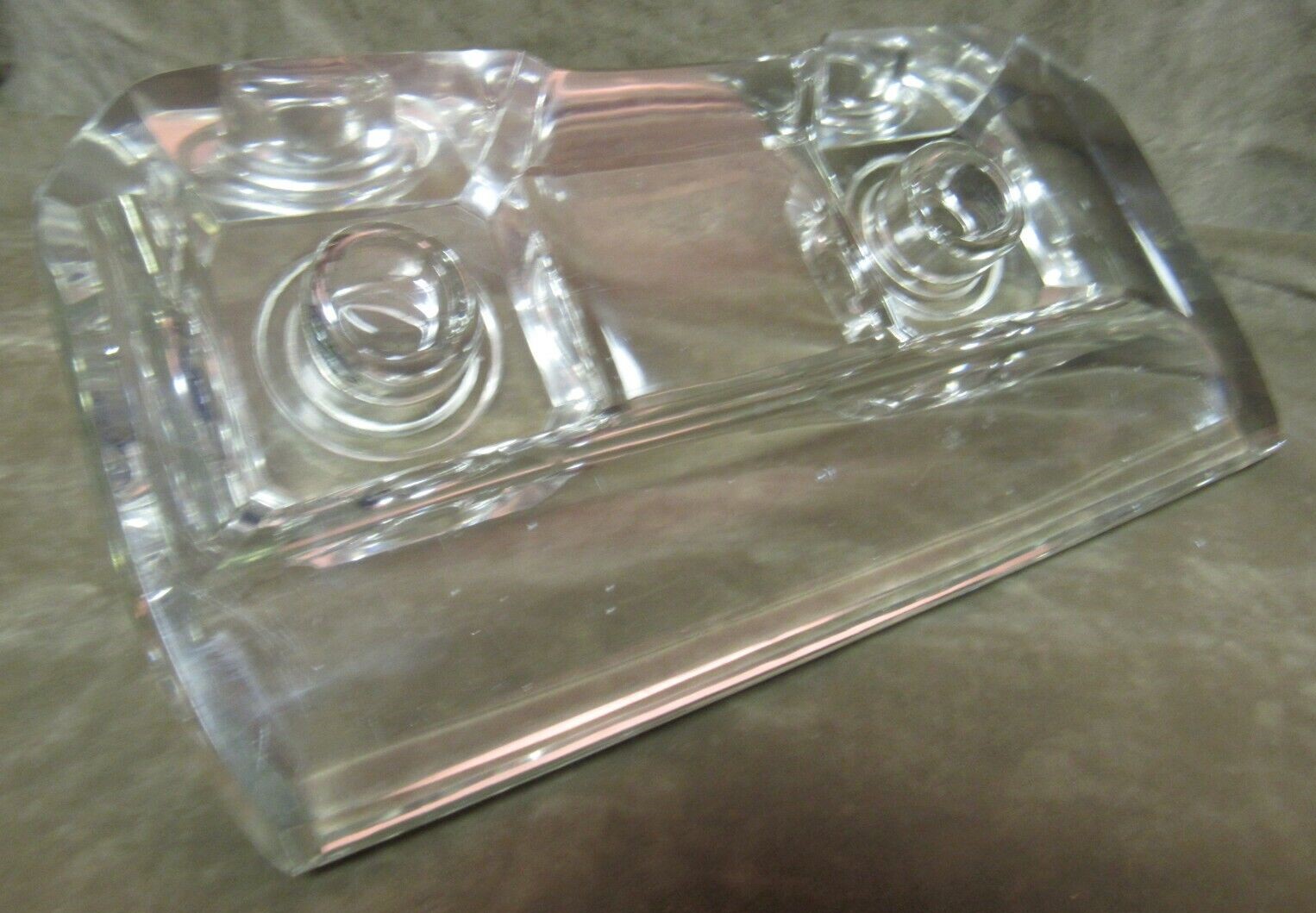 The base and bodies of two inkwells are all made in one piece of glass. The two glass lids were made separately.