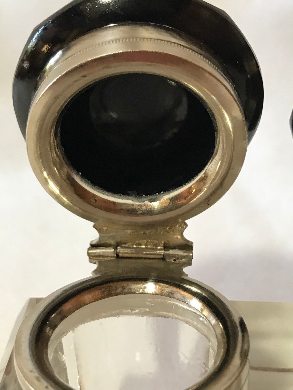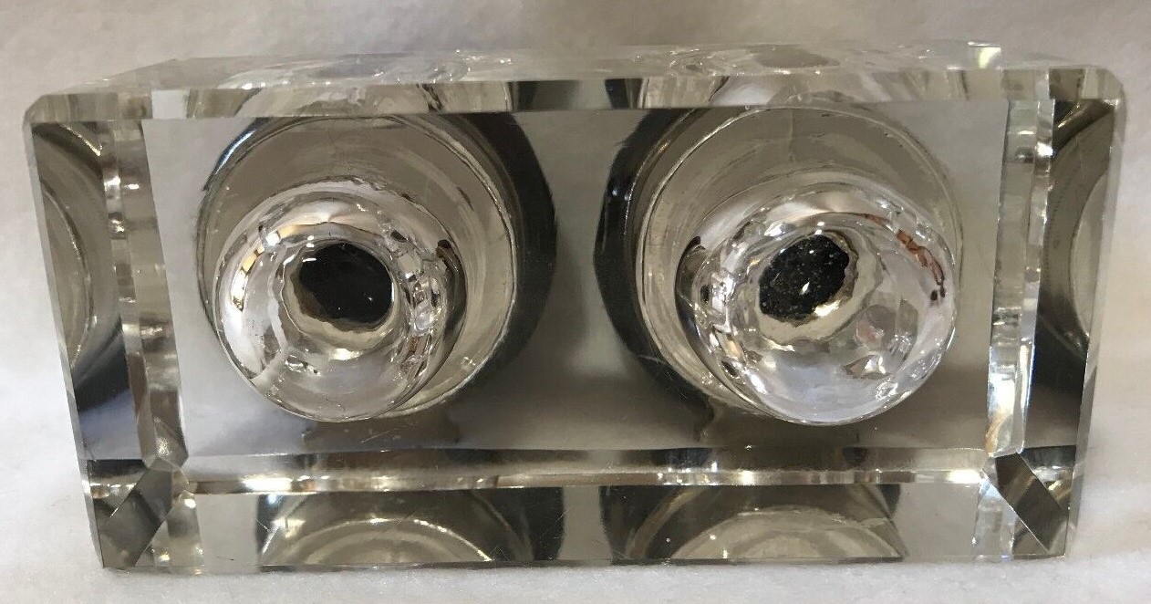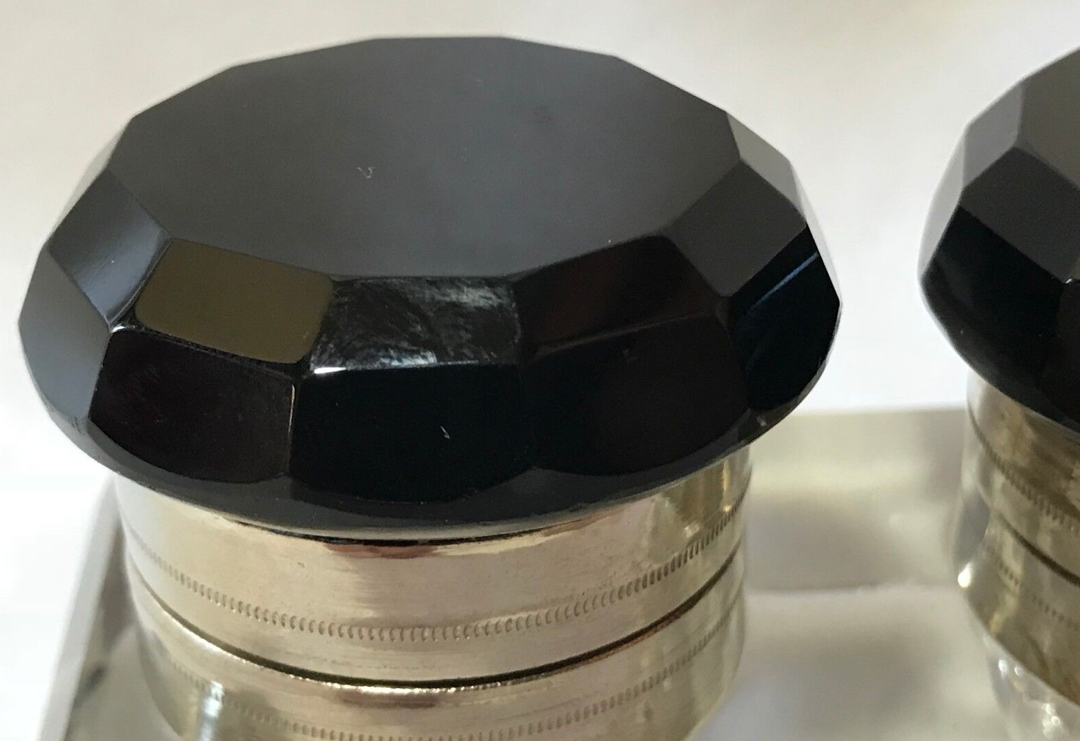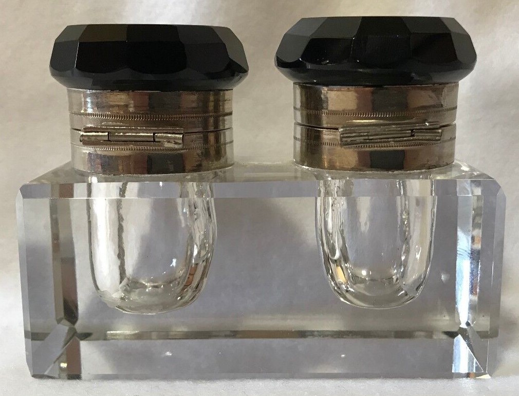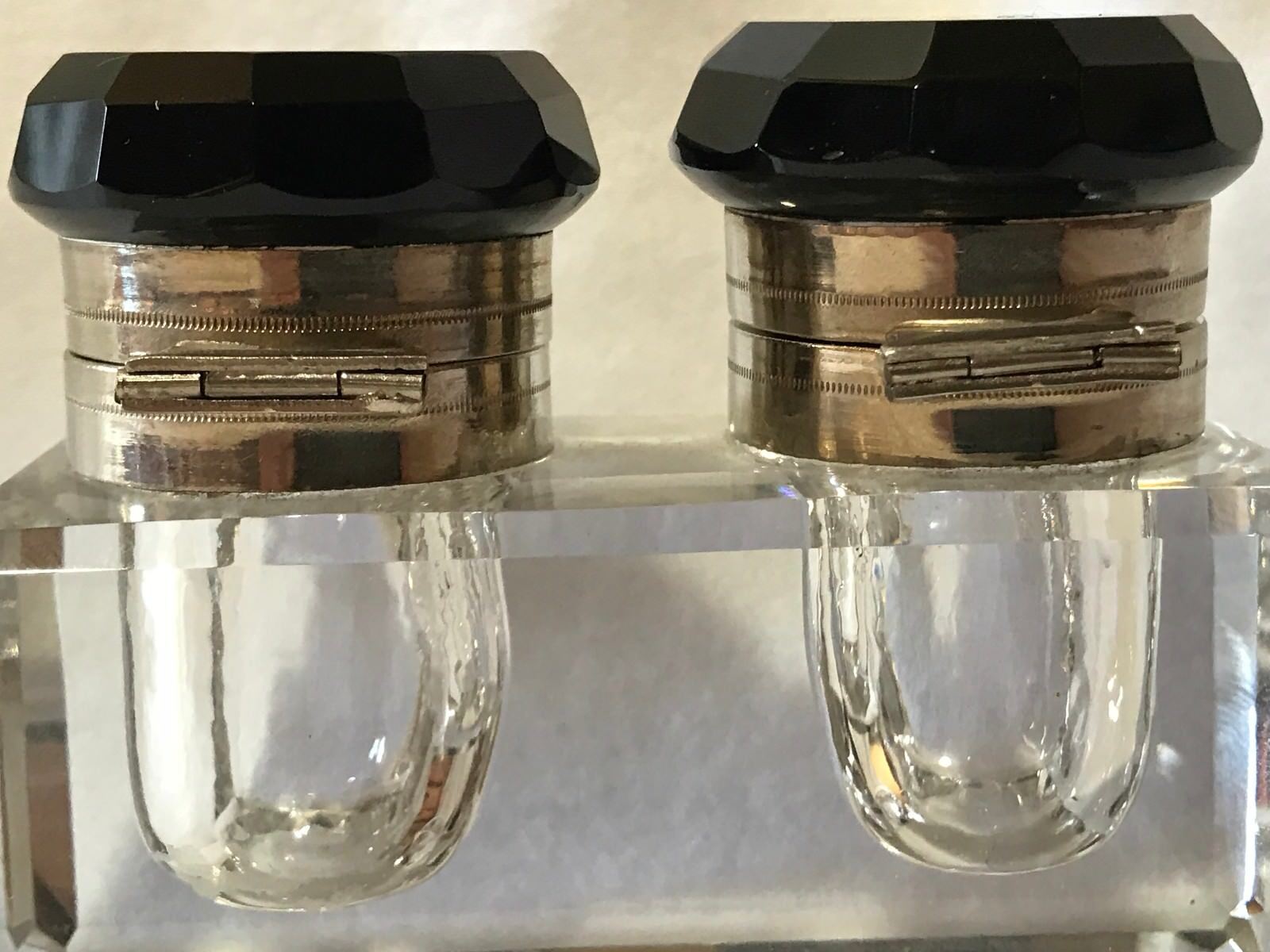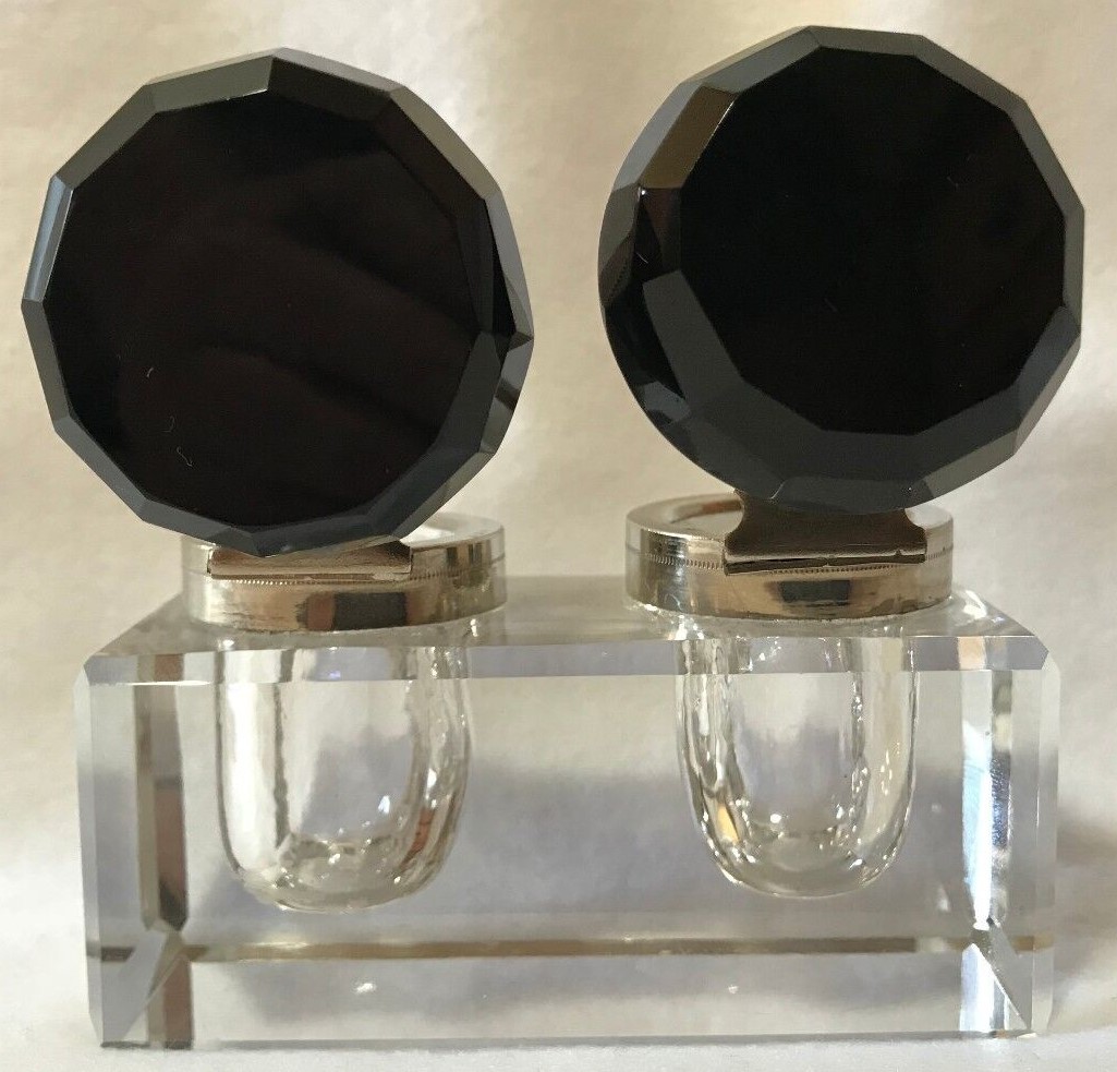 Beveled, cut glass crystal double inkwell with beveled 12-sided, faceted, hinged black glass lids with brass mounts.