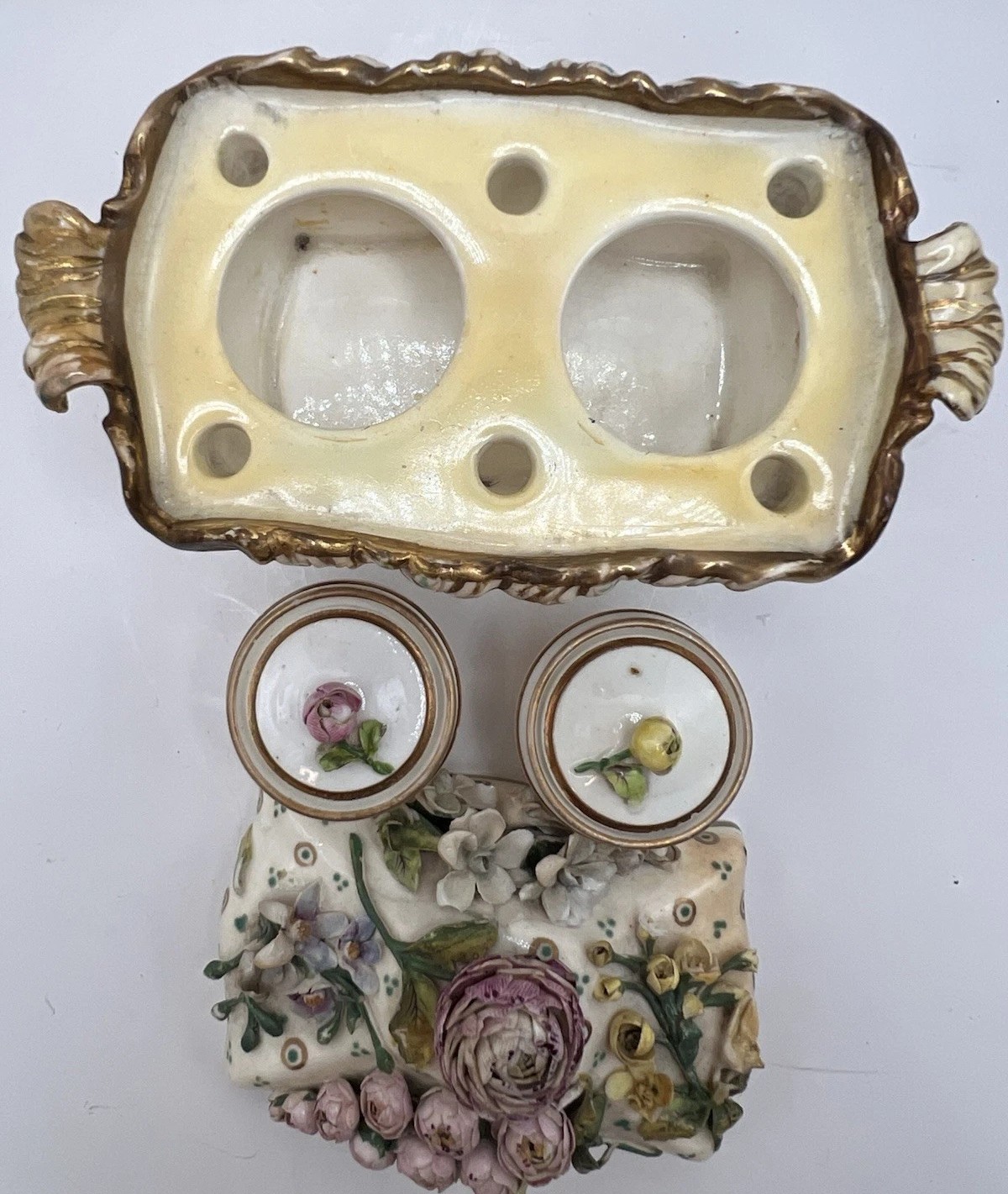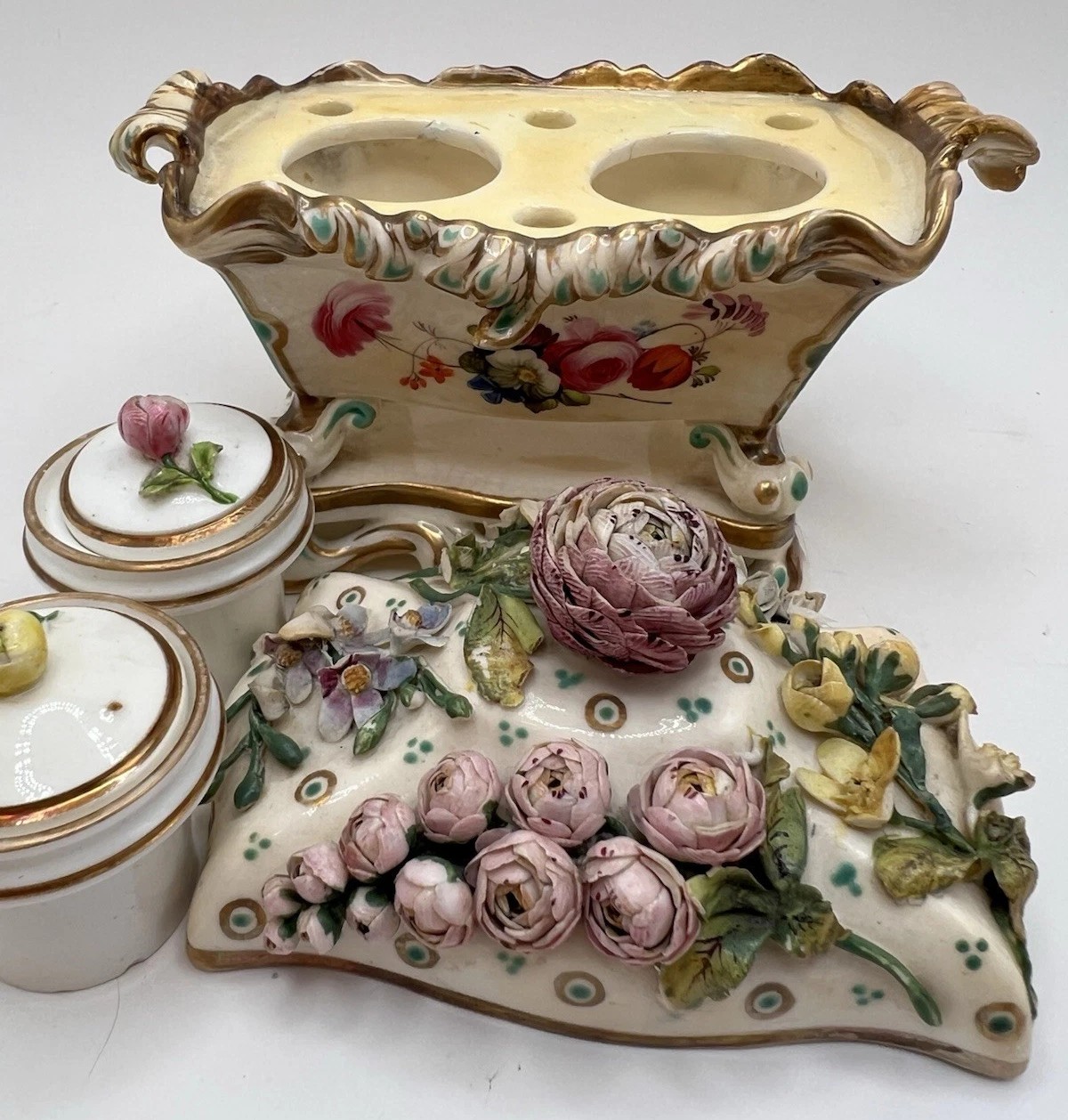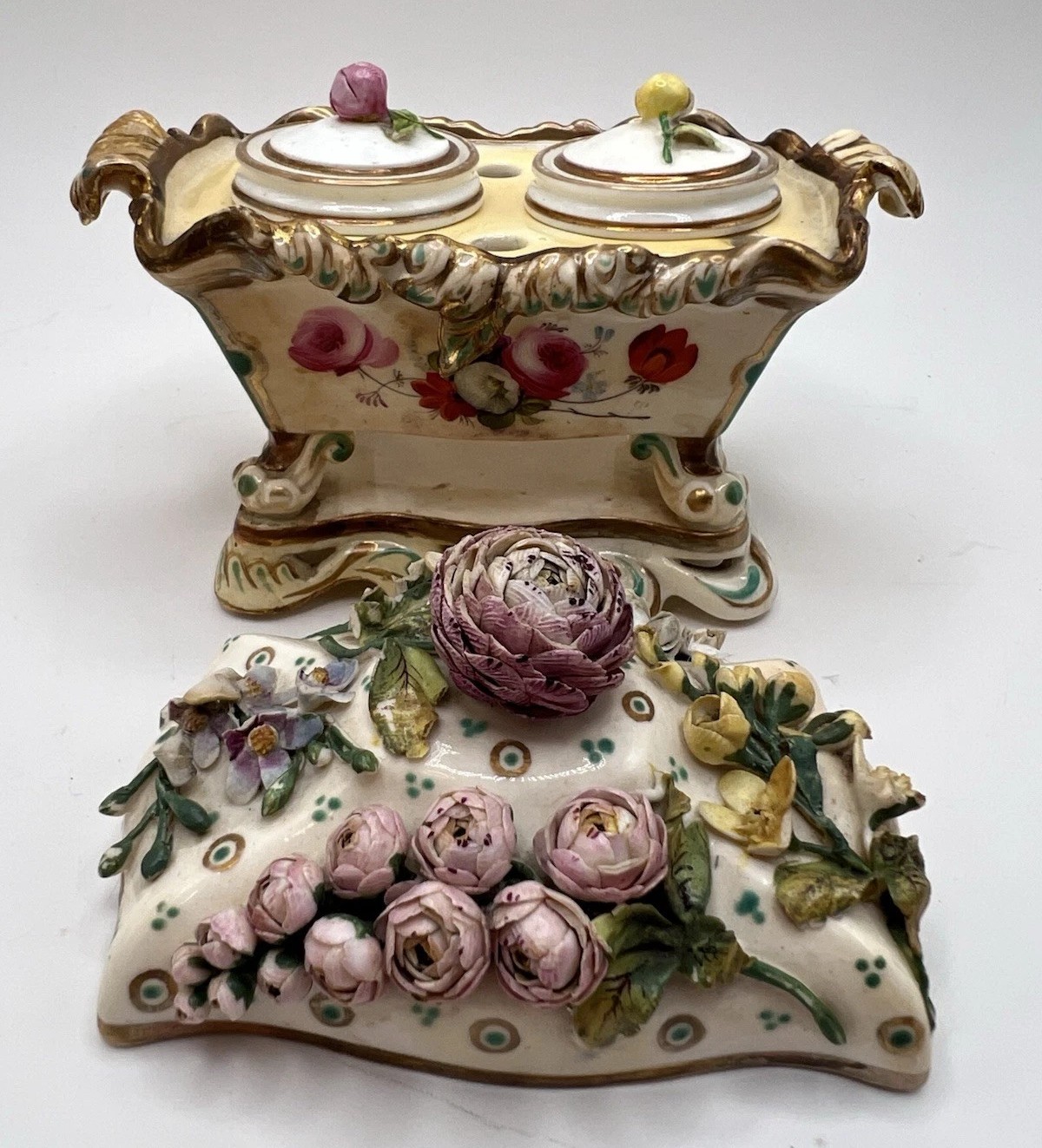 This is an exquisite Coalport lidded porcelain inkstand, a premier example of what is commonly known as “Coalbrookdale” style porcelain. This type of ware is celebrated for its lavish, three-dimensional floral ornamentation.