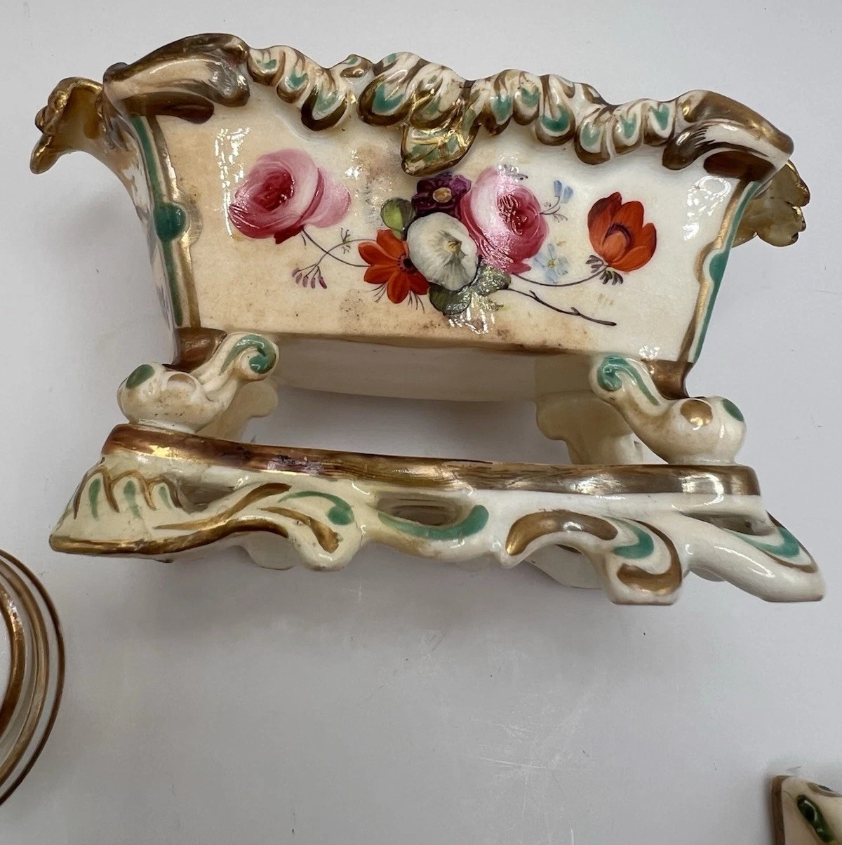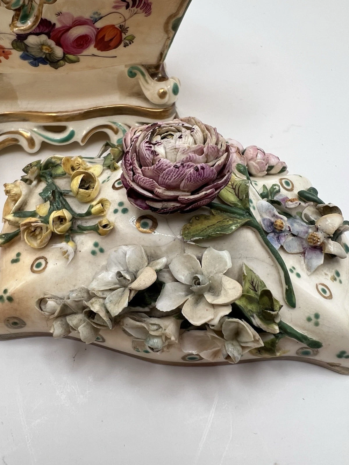 - Style Indicators: The scalloped, “C-scroll” edges, vibrant hand-painted floral bouquets, and the dense application of modeled flowers are hallmark features of Coalport’s production during the 1830s.