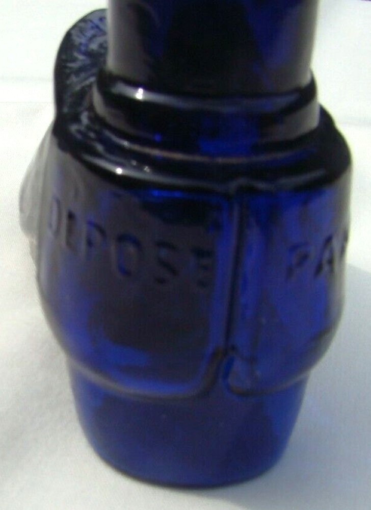This cobalt blue ink bottle is a product of the Adrien Maurin Co. of Paris. It is in the shape of a man’s shoe. There are three lace holes on each side. The top of the shoe is embossed “Adrien Maurin” with “Depose Paris” embossed on the upper heel.