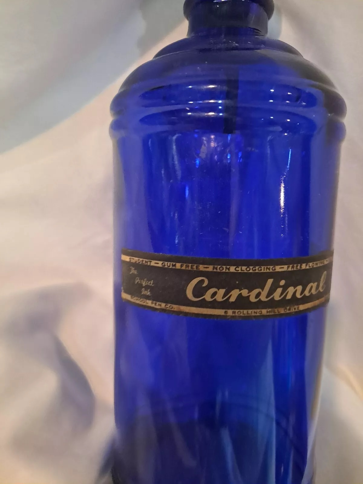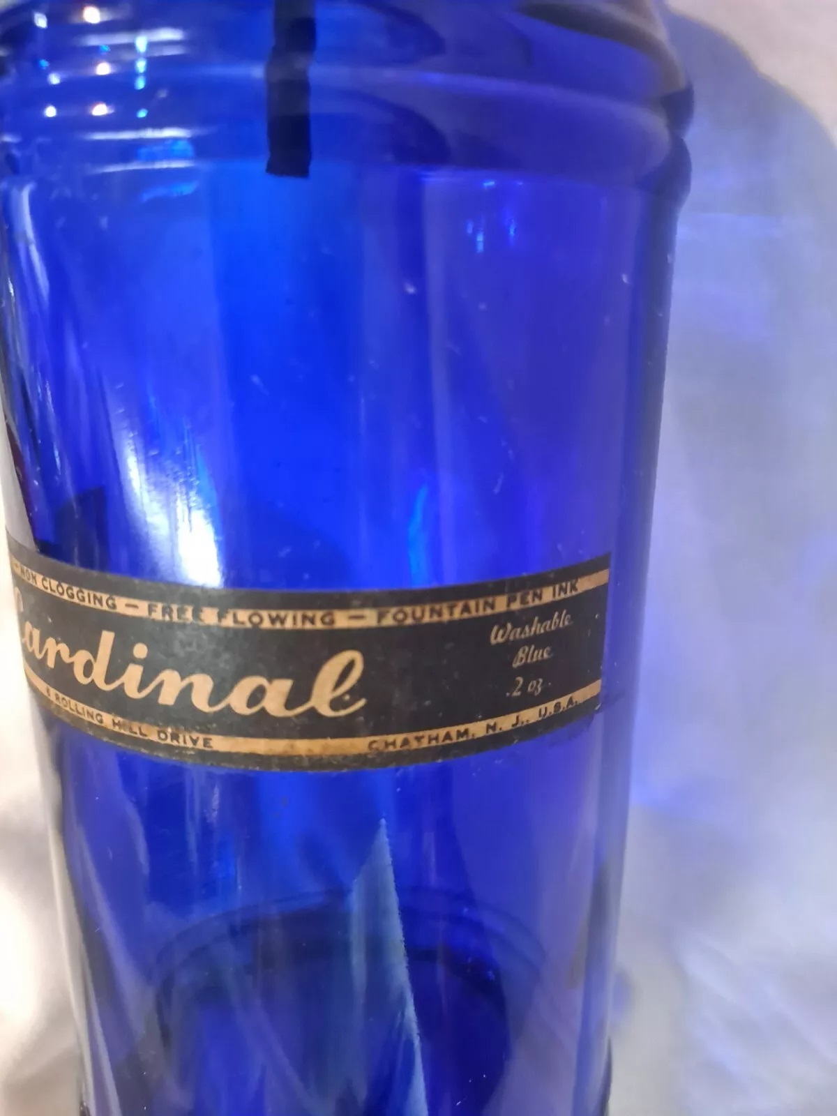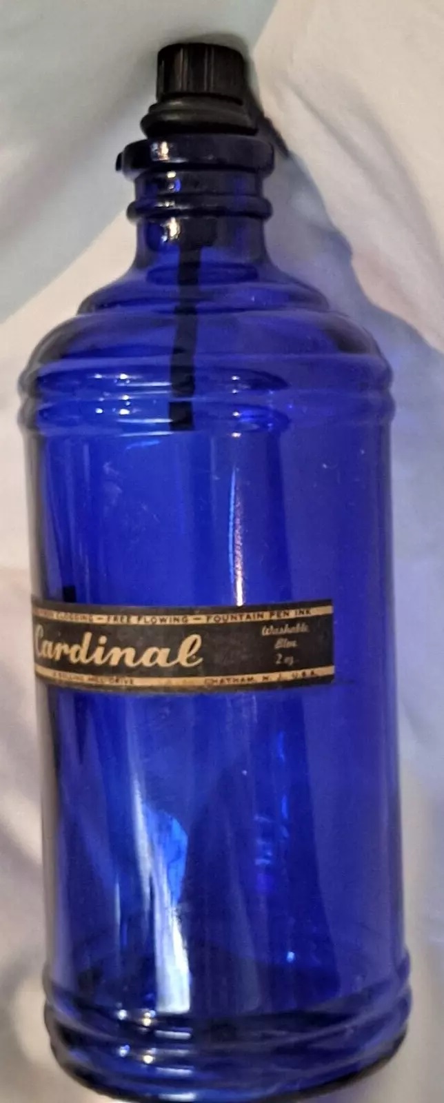 This cobalt blue ink bottle is cylindrical in shape and held ink to fill fountain pens. The bottom is embossed with the letter “M”. The original label features the word “Cardinal” in cursive script and was called “The Perfect Ink”. This was supplied by the School Pen Company, 6 Rolling Mill Dr, Chatam N.J. The label reads “Student – Gum Free – Non Clogging – Free Flowing – Fountain Pen Ink”. It appears that the School Pen Company was active from around the 1920s to the 1950s, focusing on producing ink and writing instruments for educational purposes.