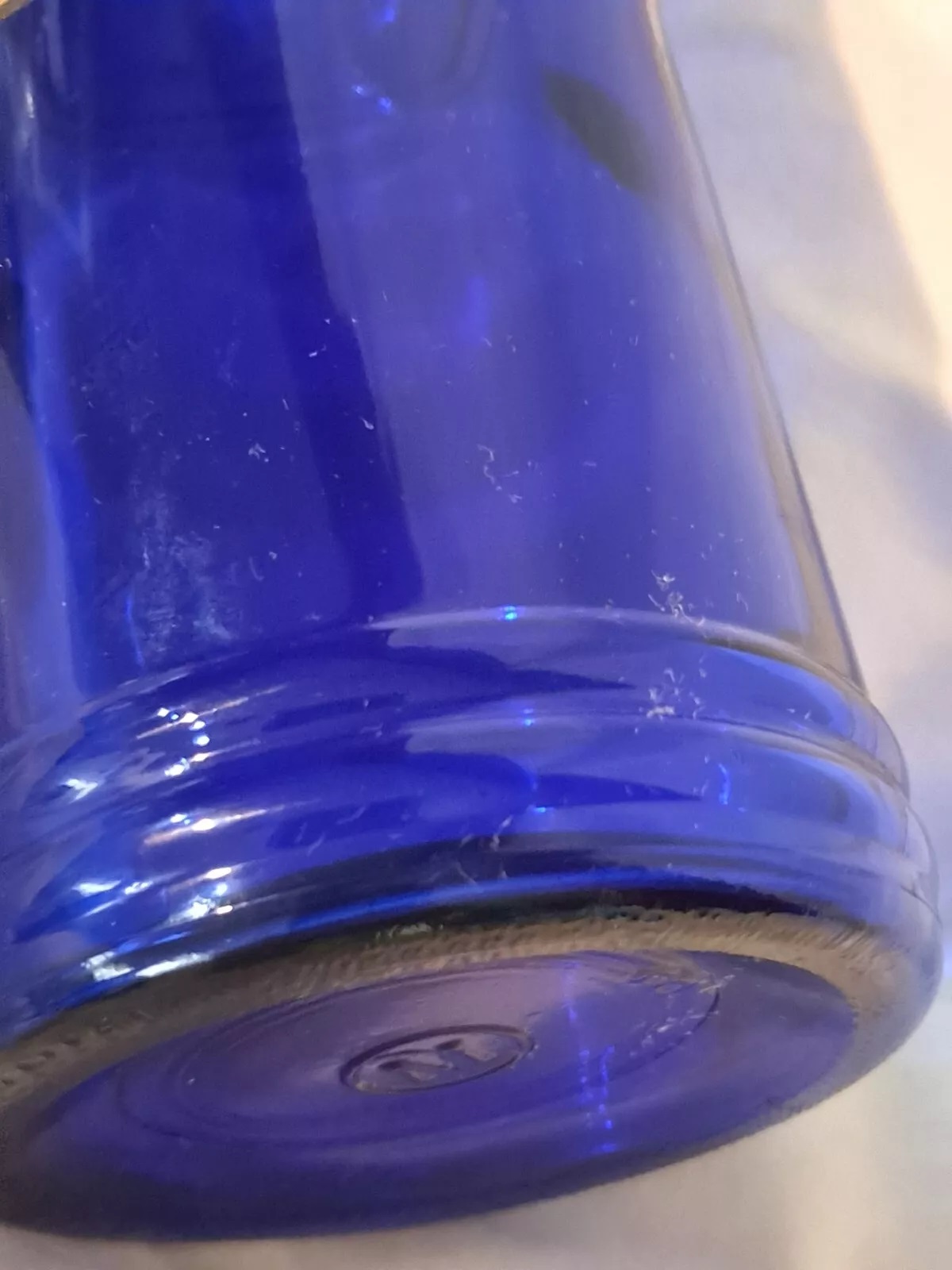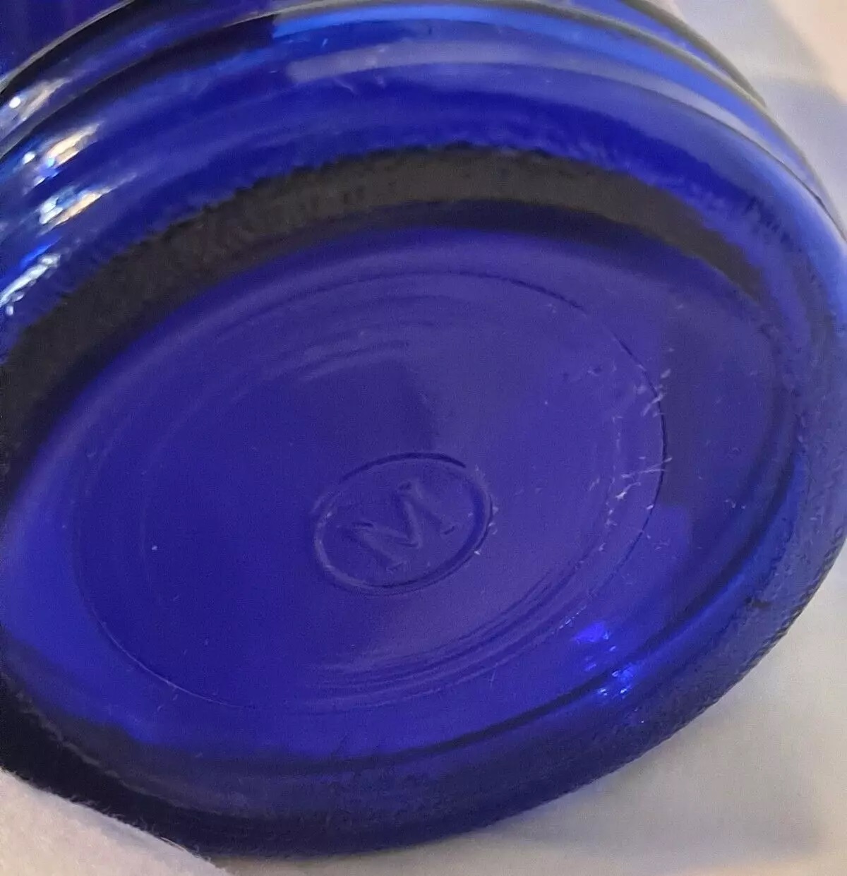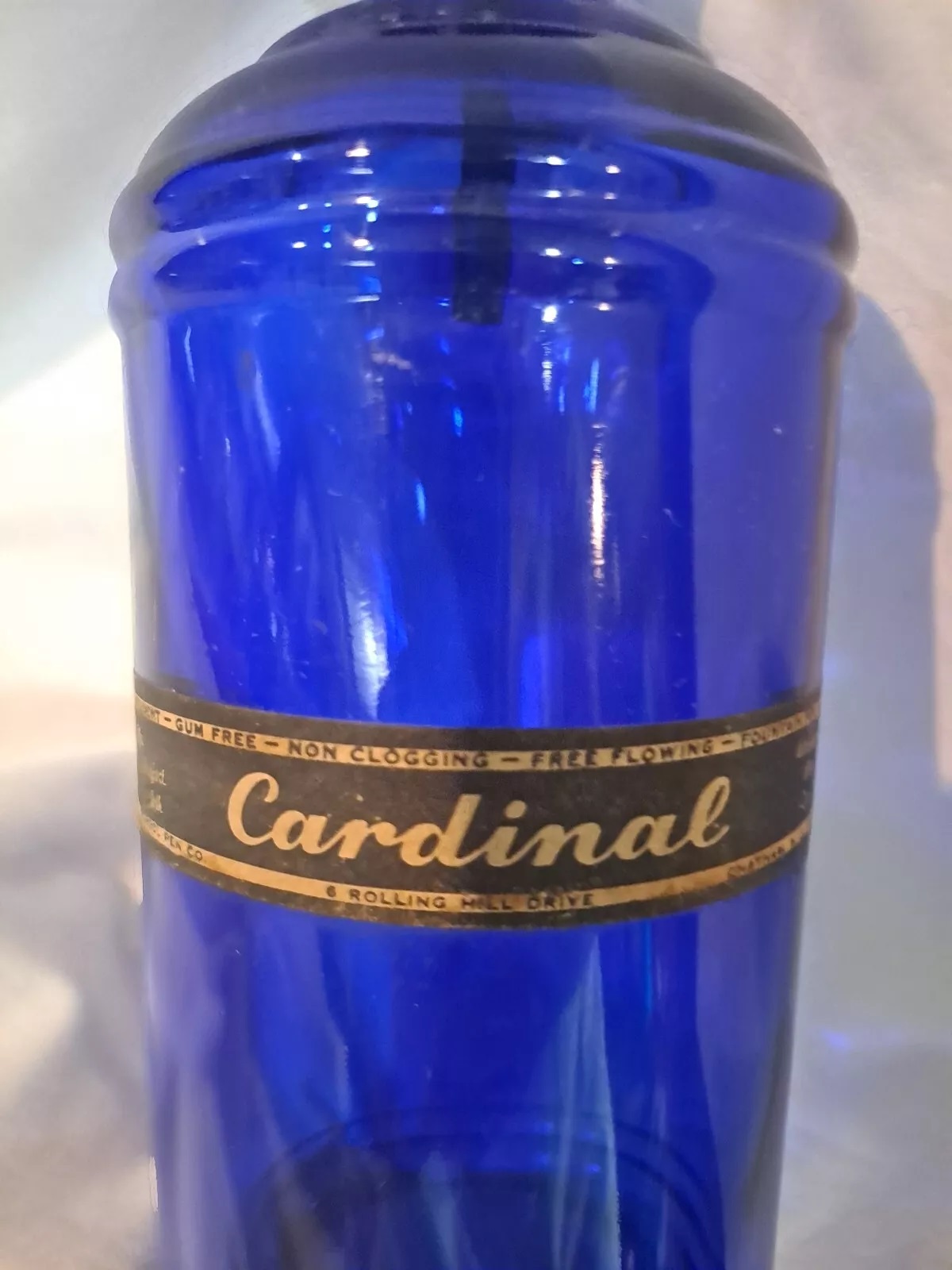 This cobalt blue ink bottle is cylindrical in shape and held ink to fill fountain pens. The bottom is embossed with the letter “M”. The original label features the word “Cardinal” in cursive script and was called “The Perfect Ink”. This was supplied by the School Pen Company, 6 Rolling Mill Dr, Chatam N.J. The label reads “Student – Gum Free – Non Clogging – Free Flowing – Fountain Pen Ink”. It appears that the School Pen Company was active from around the 1920s to the 1950s, focusing on producing ink and writing instruments for educational purposes.