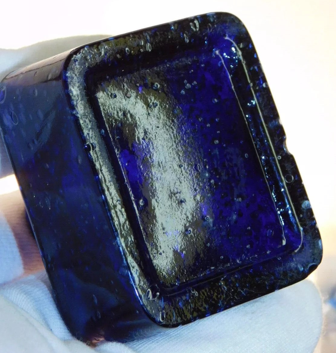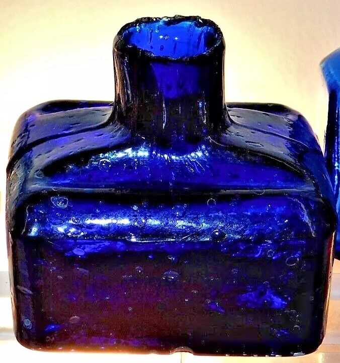 A 3 oz size, cobalt blue glass, sheer top ink bottle with integral pen ledges. It has a “honey-combed” body with excess bubbles in the entire body and outer surfaces.