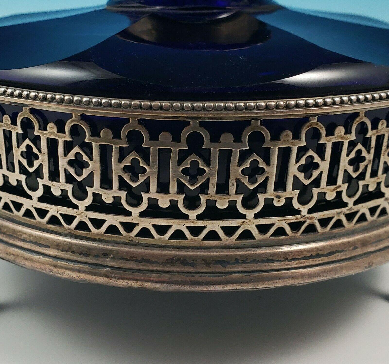 - Sterling Silver Frame: The glass inkwell is held securely within a sterling silver frame. This frame is an example of Neoclassical Adam style, made popular by the architect and designer Robert Adam. The frame is not solid, but has a pierced, geometric design that allows the vibrant cobalt blue of the glass to be seen from the side.