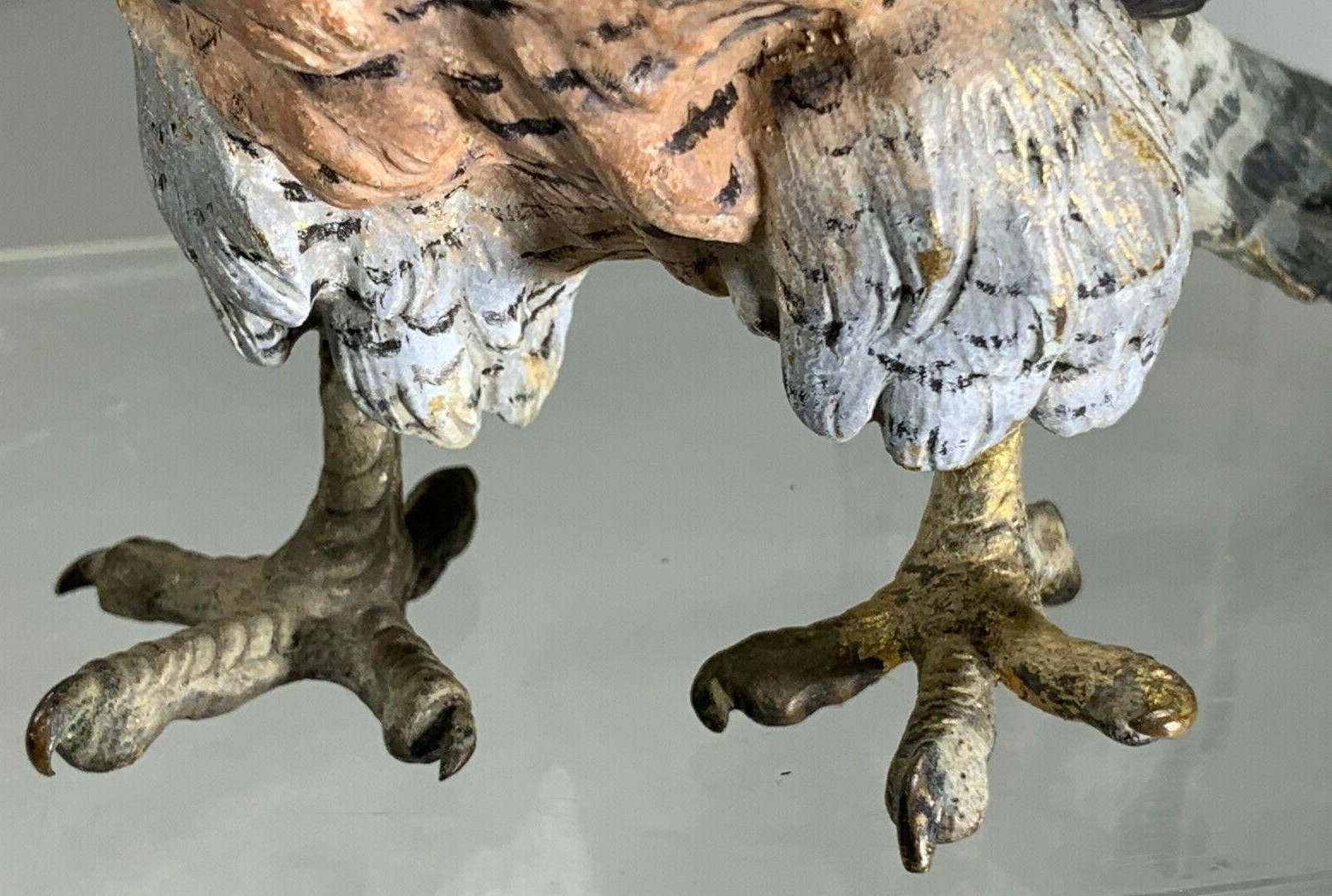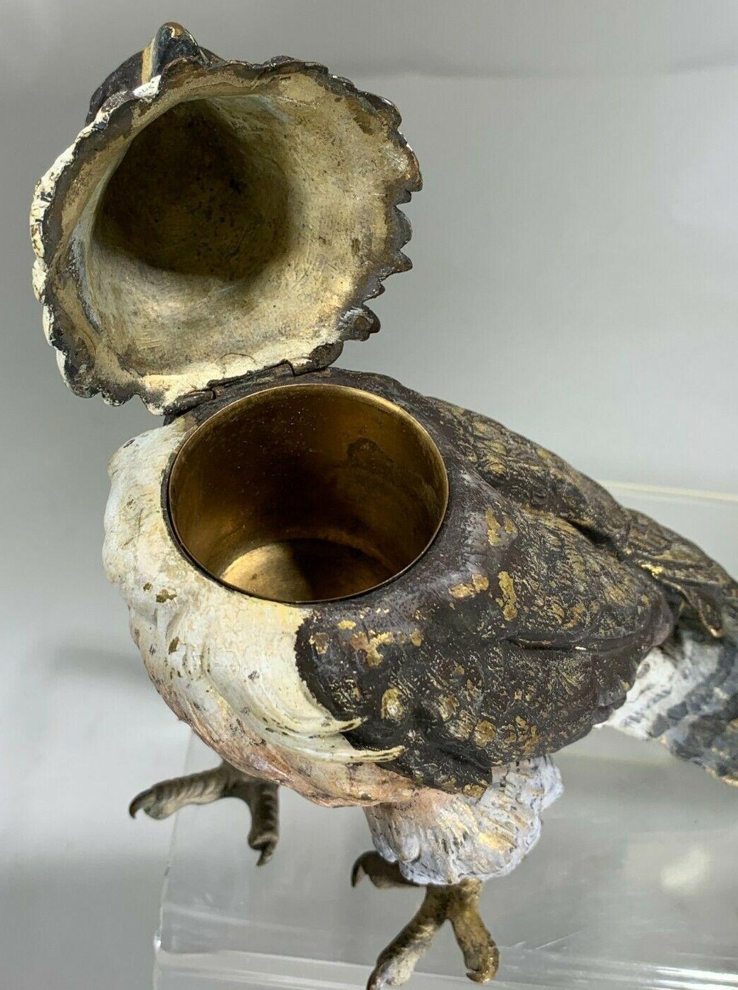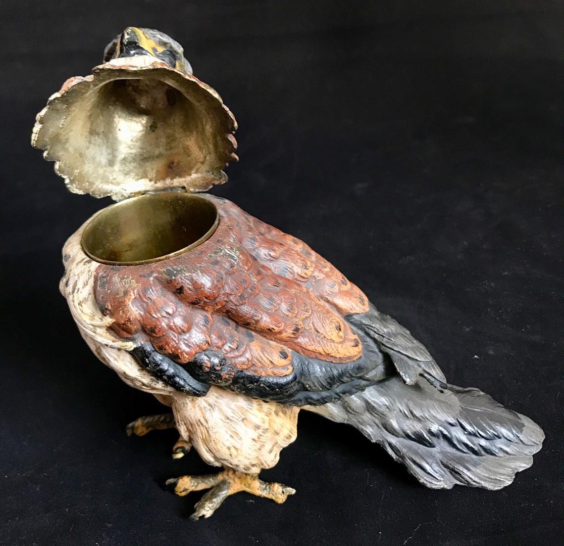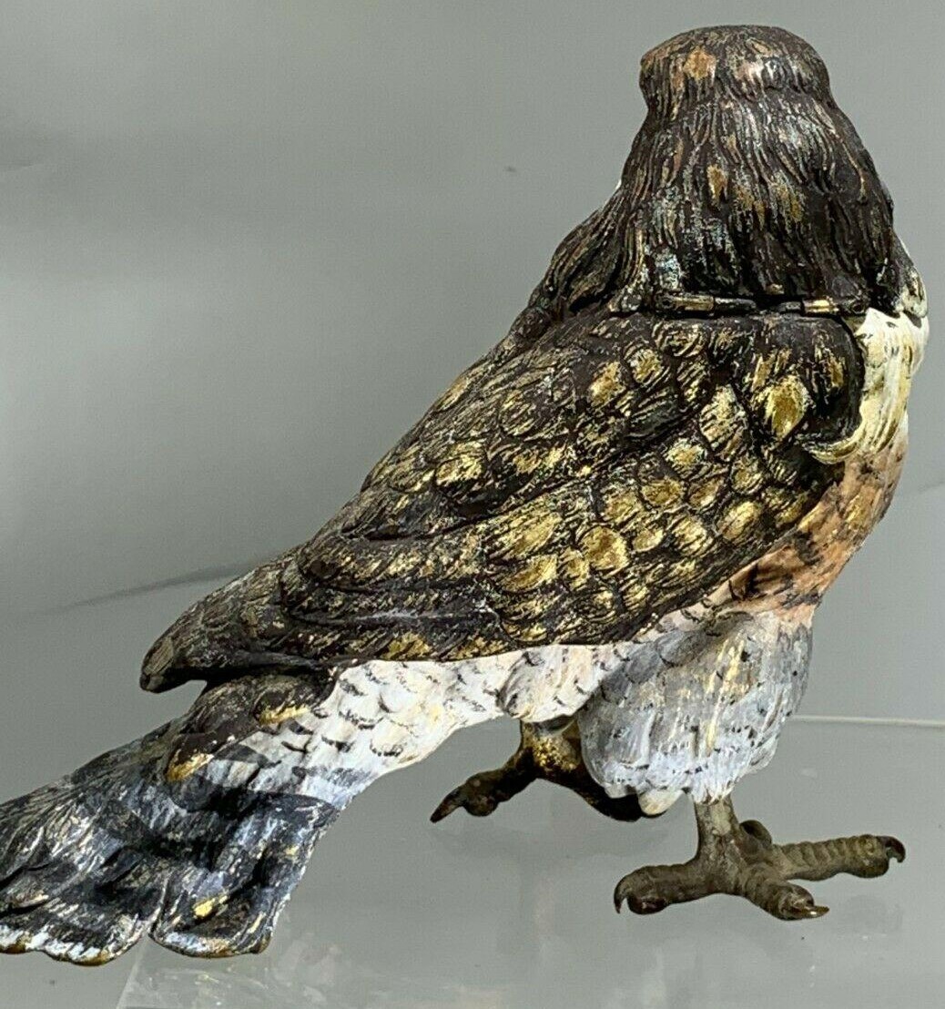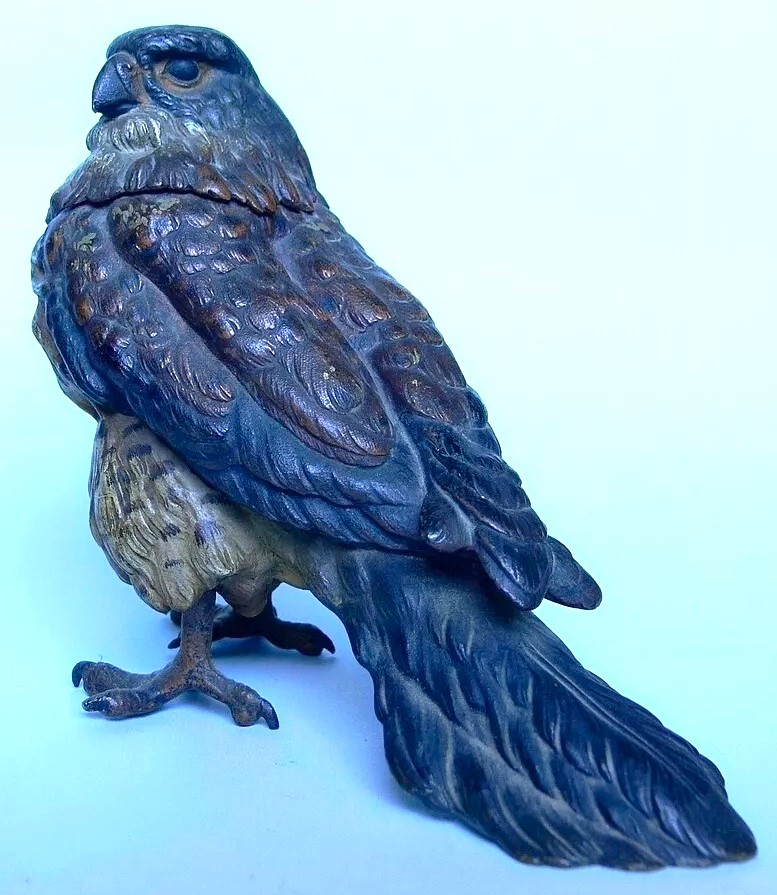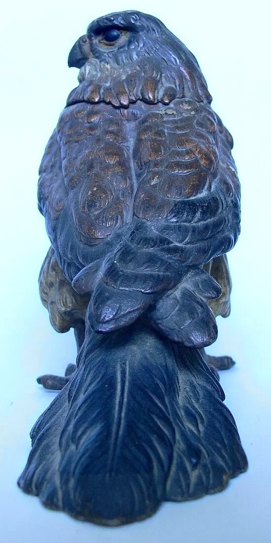 Vienna bronze cold-painted figural inkwell in the form of a falcon or hawk. The standing bird’s neck is hinged at the back, which opens to reveal a brass liner. The underside of its tail is impressed with “Geschutzt”. Three examples are pictured.