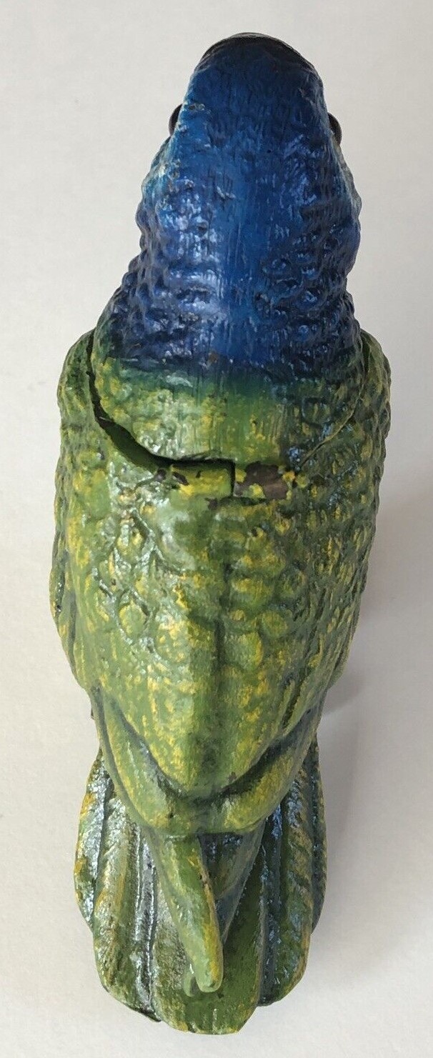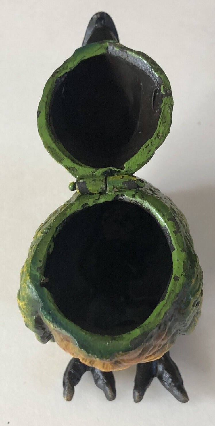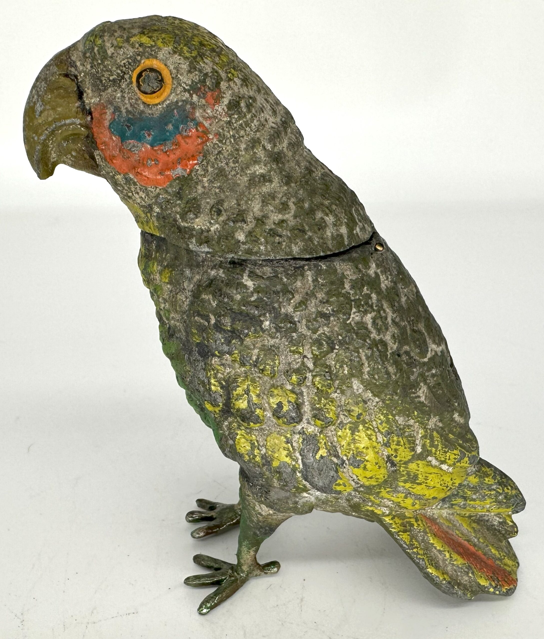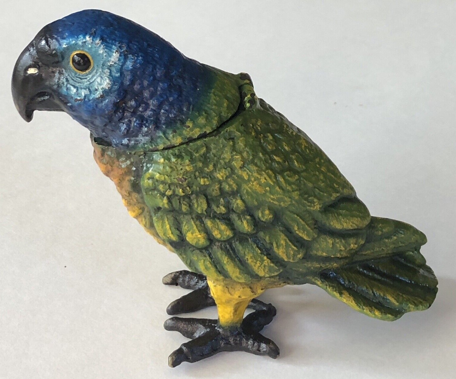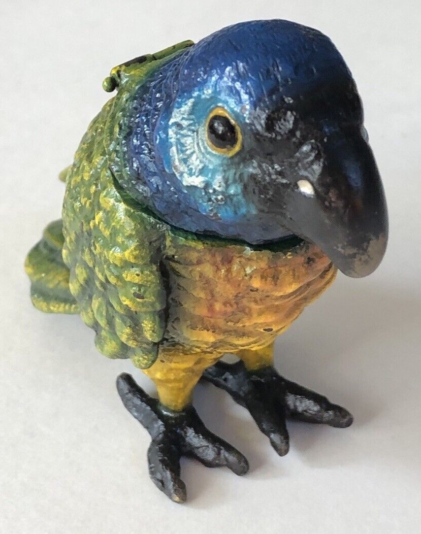 A true antique parrot inkwell is shown in the last three pictures. The full Inkipedia listing can be found at this link: Cast Metal Cold Painted Parrot Inkwell – The Society of Inkwell Collectors (SOIC) (inkwellresearch.com)