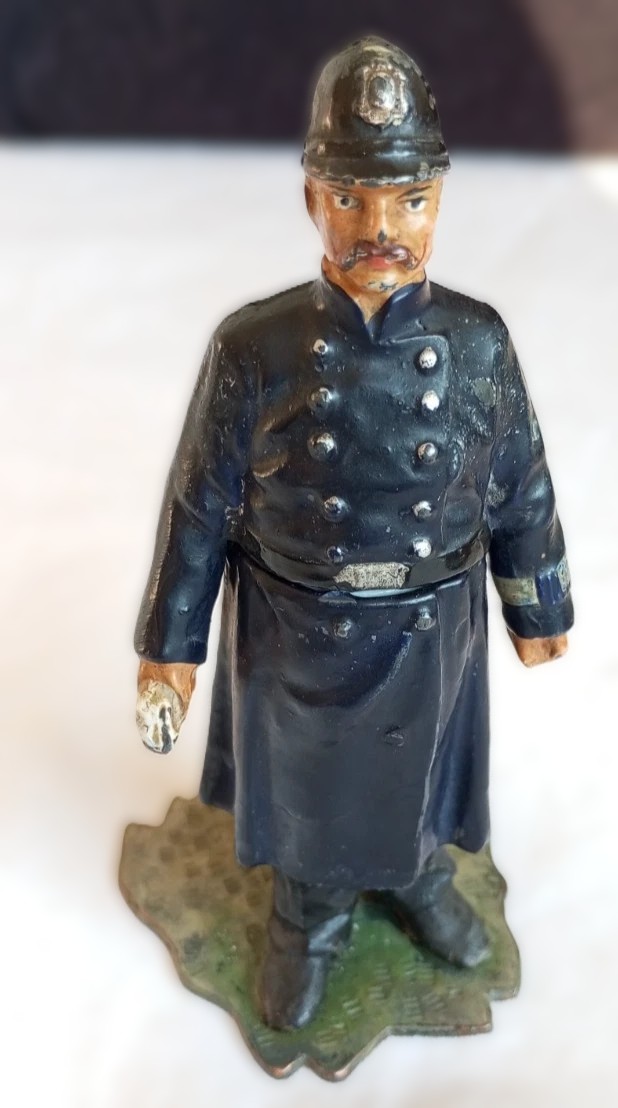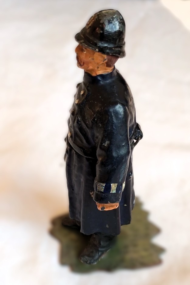 - Finish: The metal is finished with cold paint (paint applied to the metal without firing). The coloring depicts a traditional British police uniform: