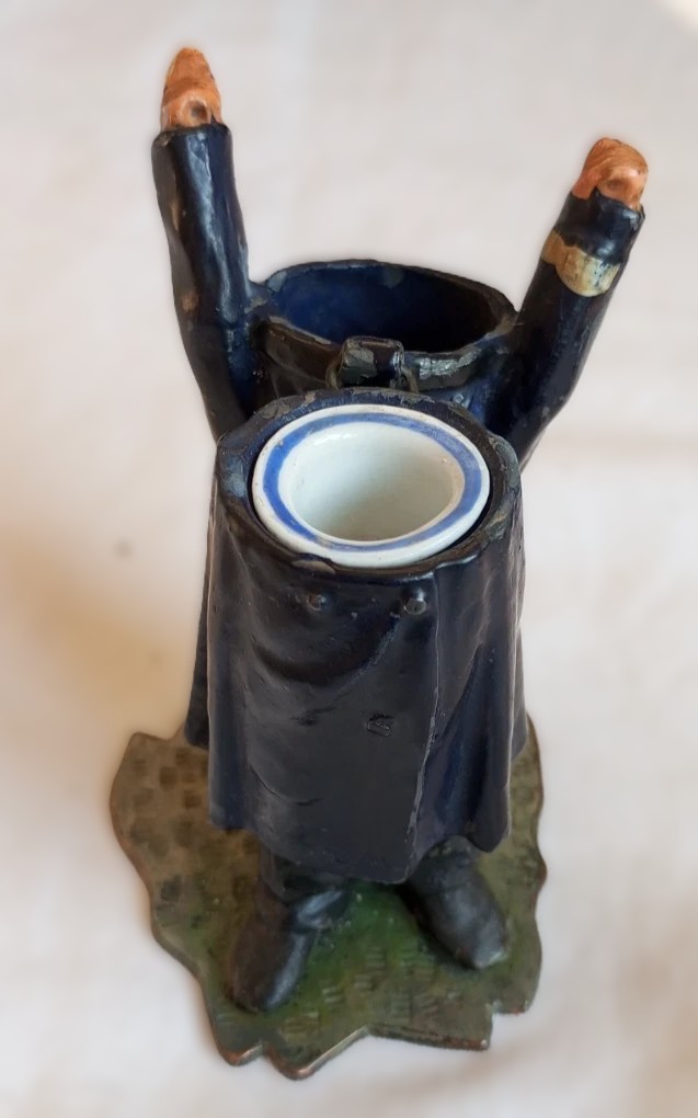This inkwell is a figural piece crafted from cast metal, depicting a uniformed policeman, intended to be an English “Bobby.” This type of novelty item was popular in the late 19th and early 20th centuries.