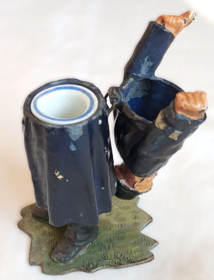 - Functionality: The inkwell is hidden. The figure is hinged at the waist, allowing the upper half (torso and head) to pivot backward and open. This reveals the removable ceramic ink pot.